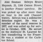 Able Seaman Selwyn Reese Heycock, age 21, resided at 1164 Comox Street is another HMCS Fraser survivor. He was picked up after more than an hour in cold English Channel waters. He lost his life when HMCS Margaree went down after a collision with another ship. Able Seaman Selwyn Heycock was a submarine detection expert. He was a member of the naval reserve in 1937, and was called up for service in October 1938. He served on the destroyer HMCS St. Laurent before transferring to HMCS Fraser. He was a student at Carleton School.