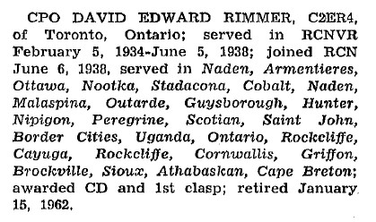 David's brothers John B. (Zip) Rimmer and Reginald B. Rimmer both served in the RCN.