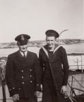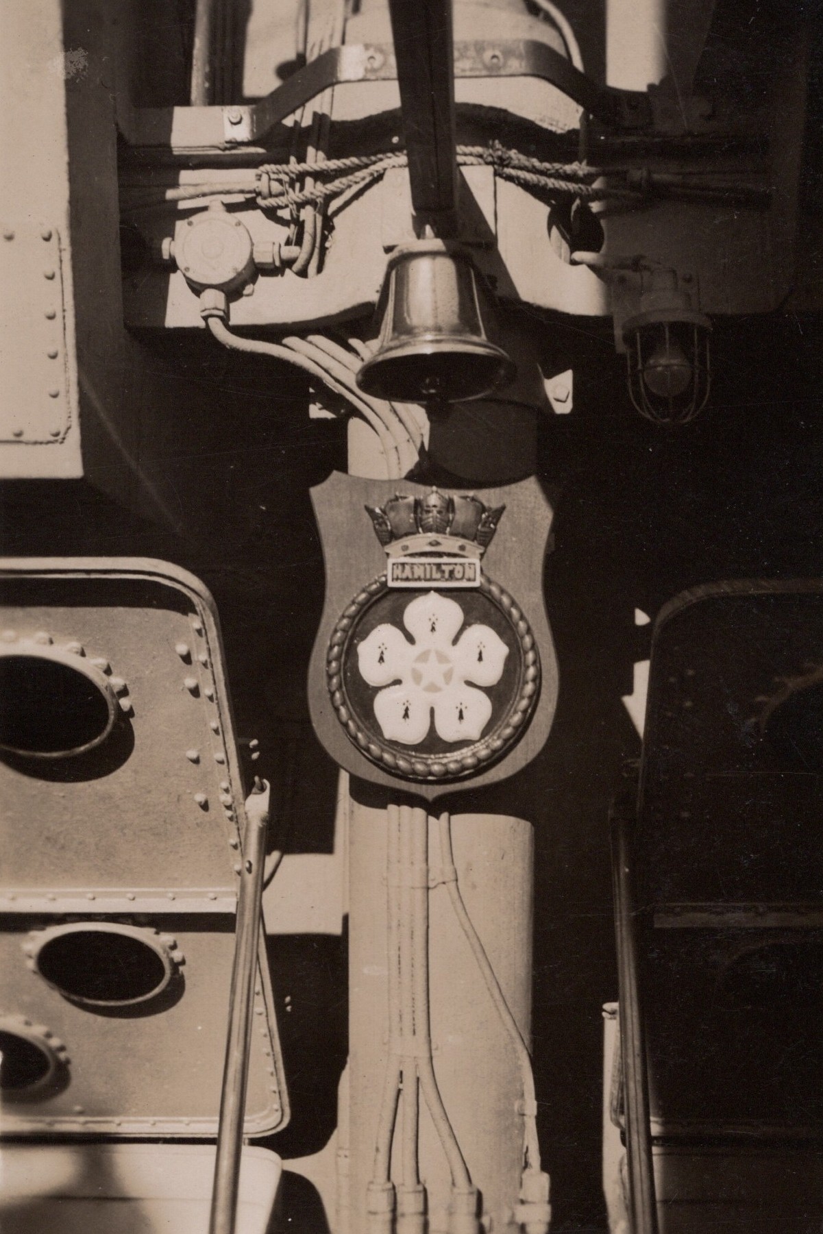 (JNC038) Ship's badge of HMCS HAMILTON I24 (JNC039) The ship's bell and badge of HMCS HAMILTON I24 (JNC040) James Cox (right) with unknown Chief Petty Officer on HMCS HAMILTON I24 (JNC041) James Cox (right) with unknown Chief Petty Officer on HMCS HAMILTON I24 - with a Fairmile Motor Launch in the back ground. (JNC042) Unknown sailors in a mess deck on HMCS HAMILTON I24