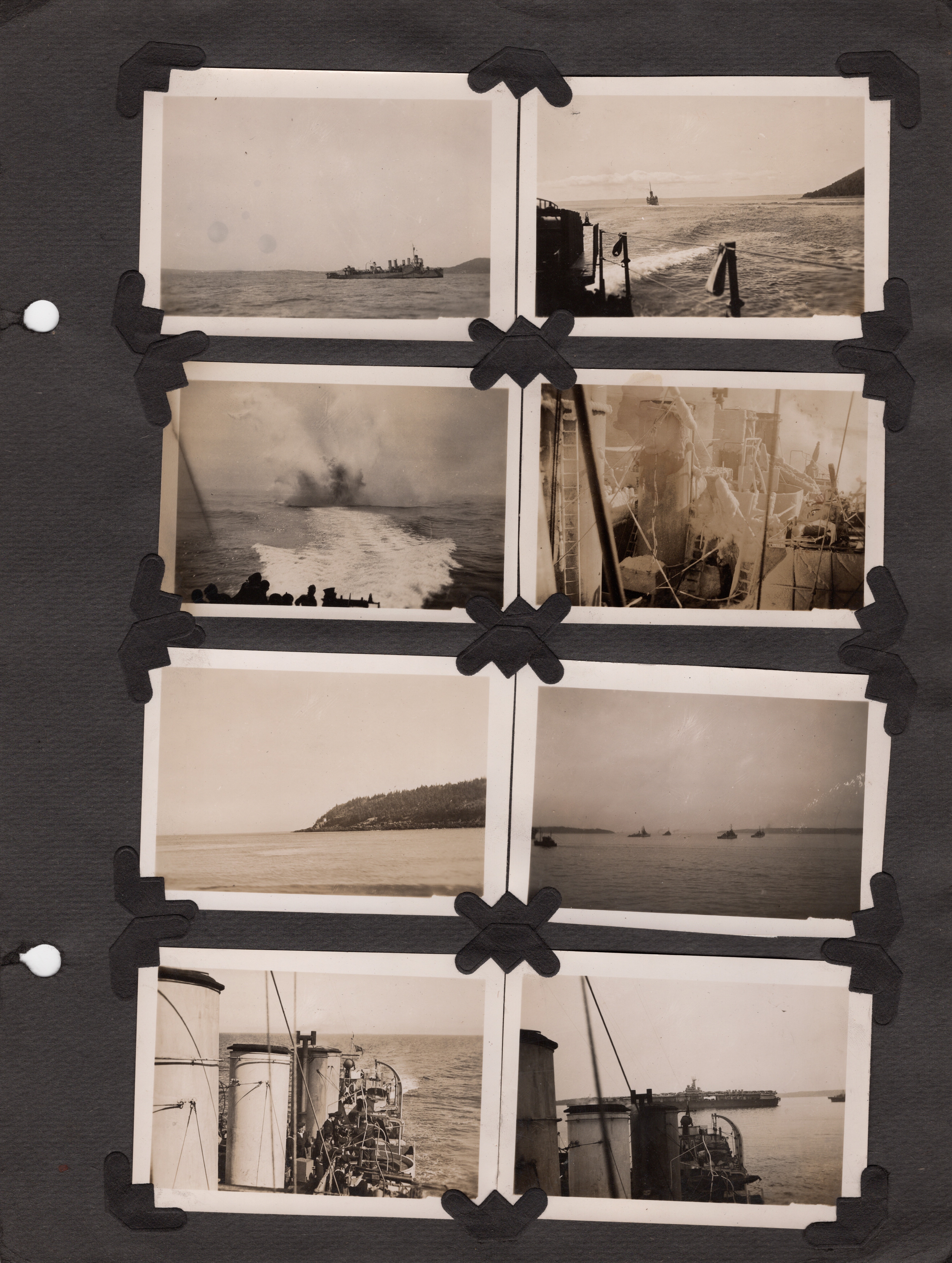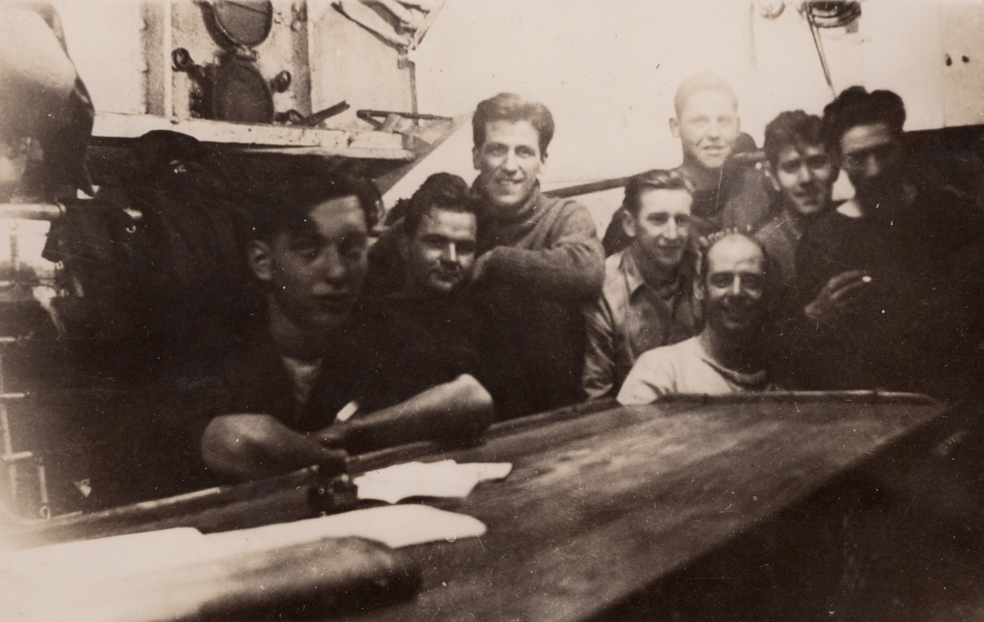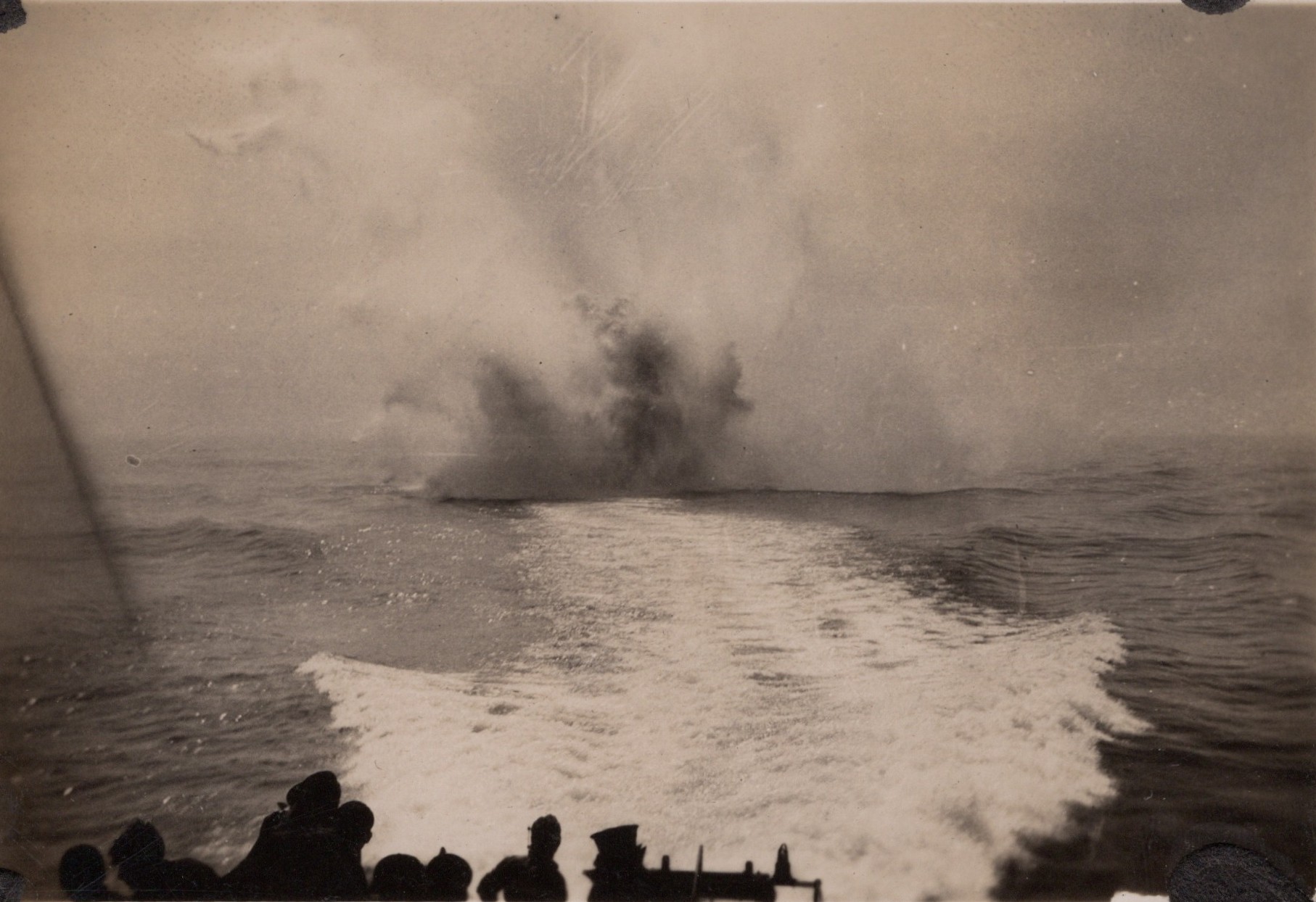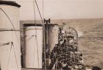(JNC062) Unknown officer on the bridge of HMCS HAMILTON I24 (JNC063) James Cox with unknown shipmate on HMCS HAMILTON I24 (JNC064) Unknown sailors on HMCS HAMILTON I24 (JNC065) Convoy seen from HMCS HAMILTON I24. Another convoy escort is directly astern of HMCS HAMILTON (JNC066) Depth charge exploding astern of HMCS HAMILTON I24