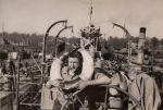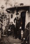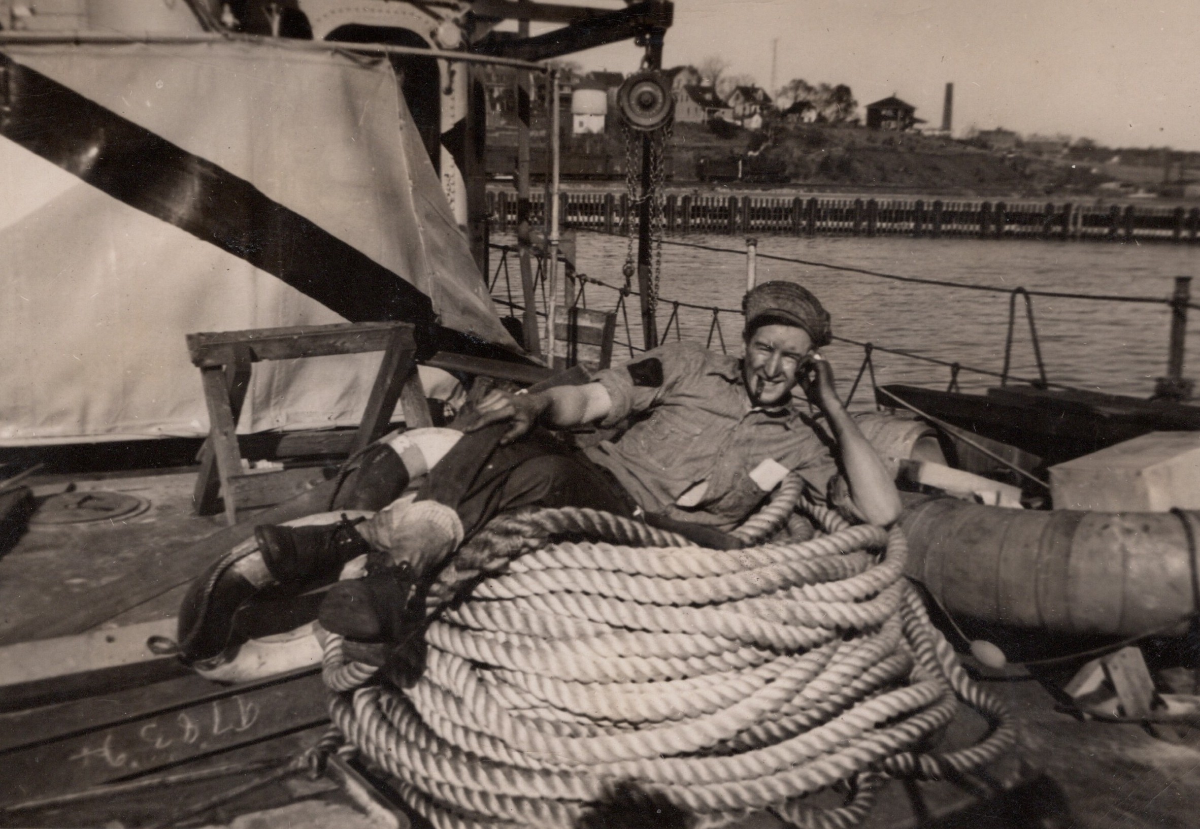 (JNC043) Unknown sailor, wearing an HMCS VENTURE cap tally, on the quarterdeck of HMCS HAMILTON I24 with a couple of civilian workers taking a break beside him. (JNC044 - JNC045) James Cox by the emergency steering position on HMCS HAMILTON I24 (JNC046) James Cox resting on a coiled hawser on the fo'c's'le of HMCS HAMILTON I24