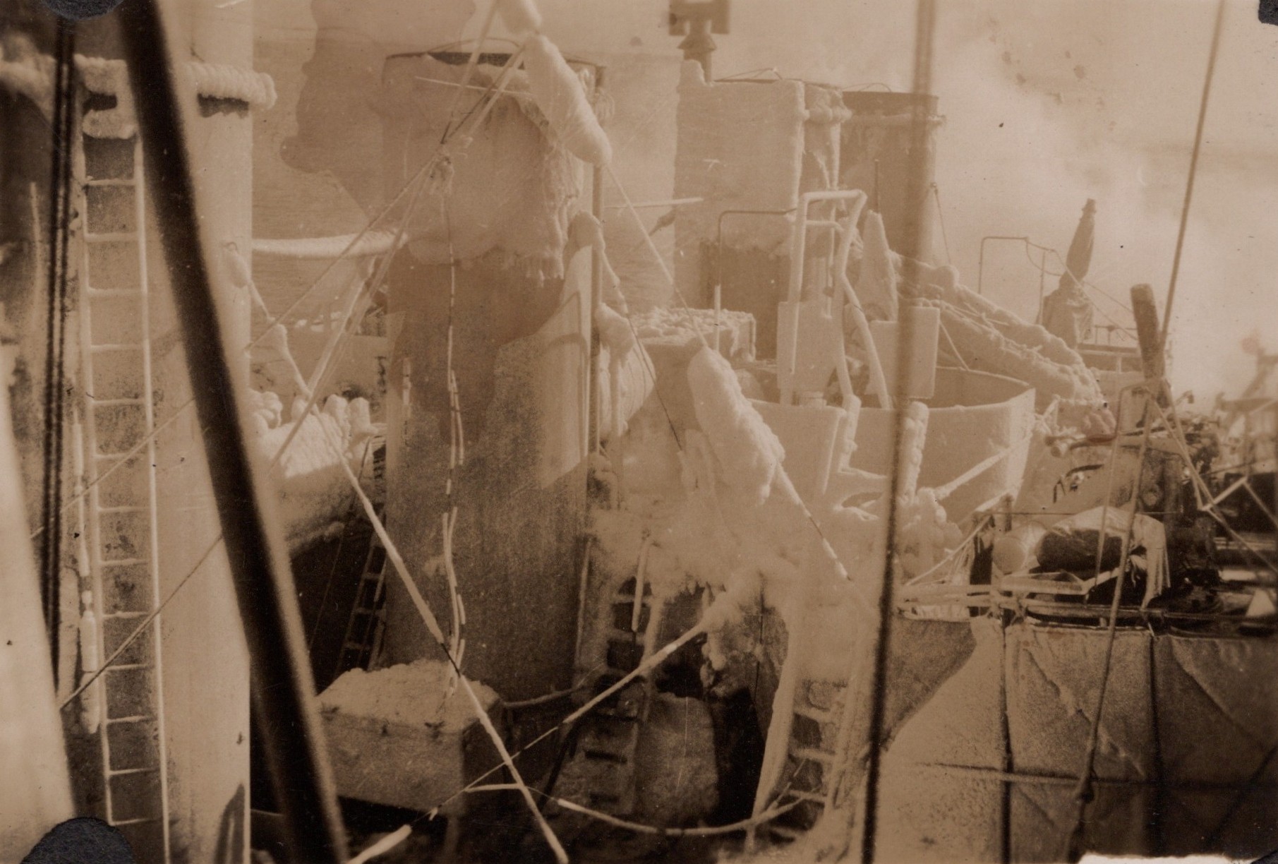 (JNC087) Unknown Petty Officer on an ice covered HMCS BITTERSWEET K182. Photo taken from the boat deck, just aft the bridge, looking forward. (JNC088) Sailors by the depth charge rails on HMCS BITTERSWEET K182