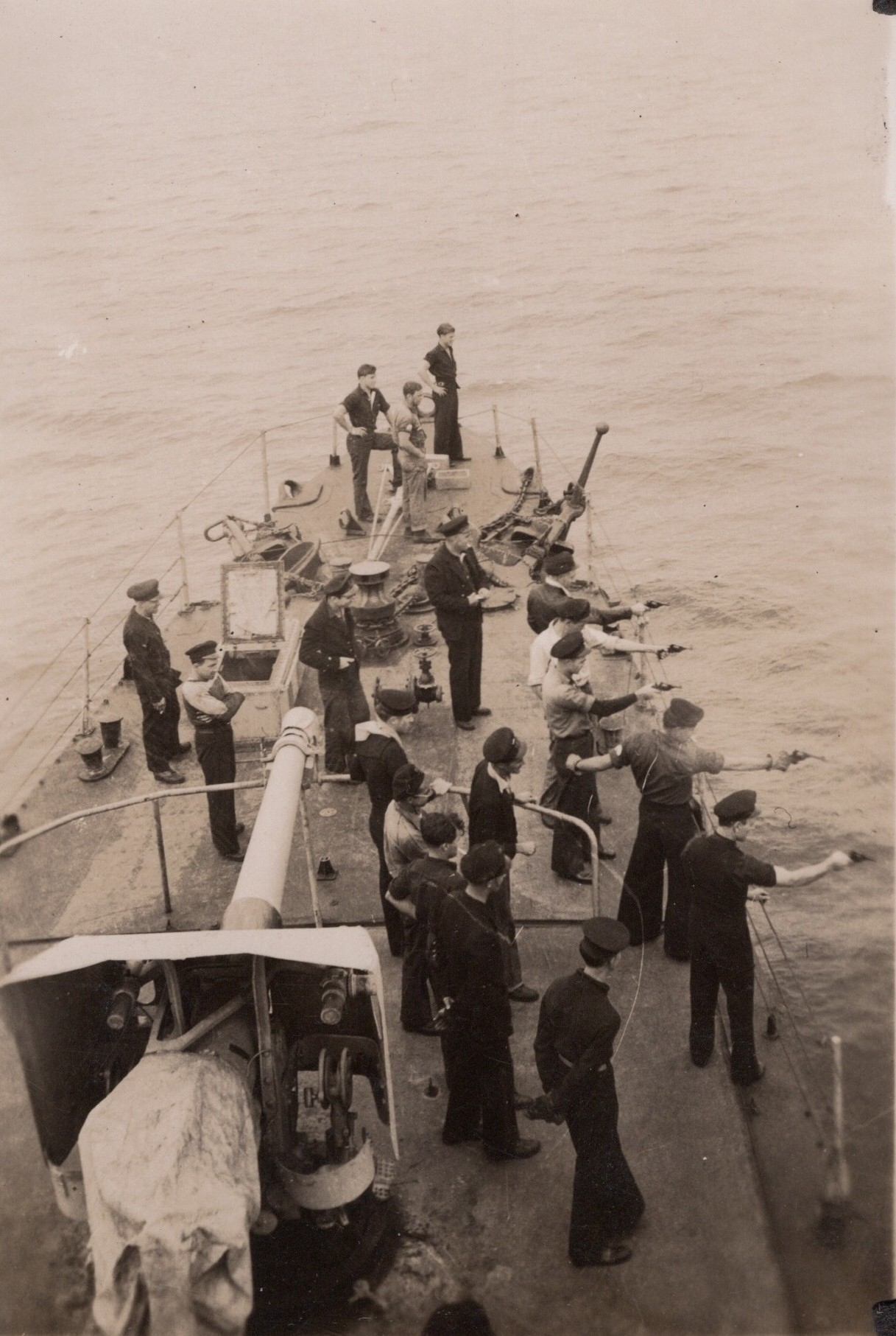 (JNC085) Small arms weapons training taking place on the fo'c's'le of HMCS HAMILTON I24 (JNC086) Libertymen on HMCS HAMILTON I24 waiting for the duty boat to go ashore on leave (JNC087) Pier with a small lighthouse and signal pole at an unknown location