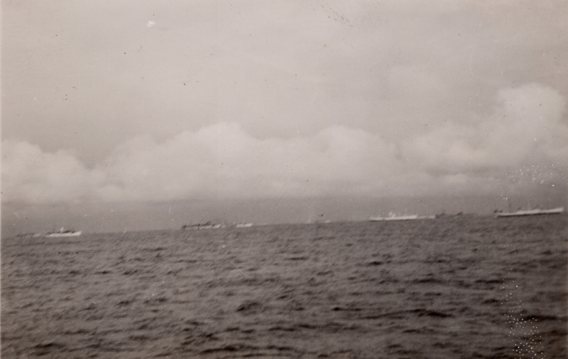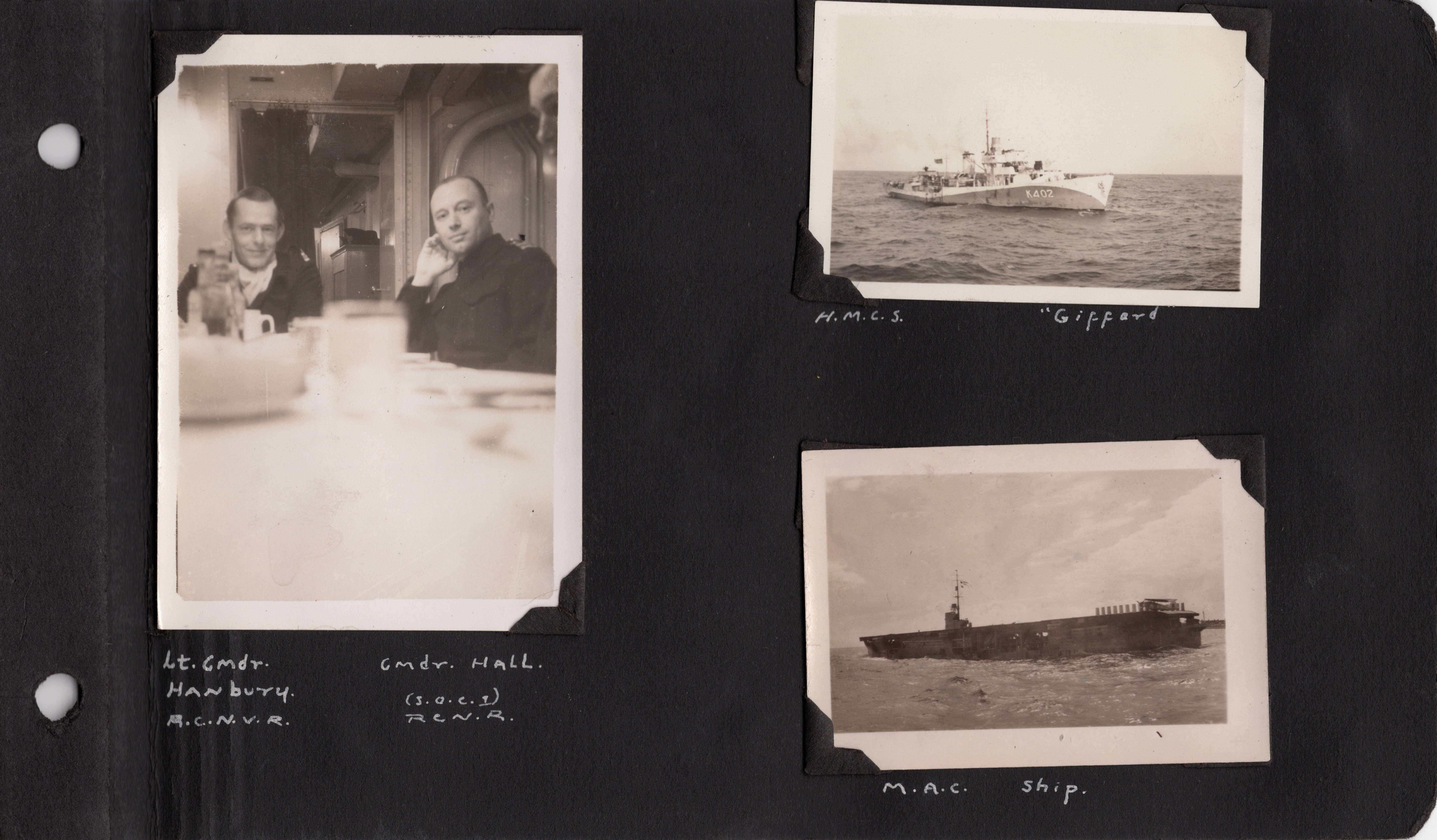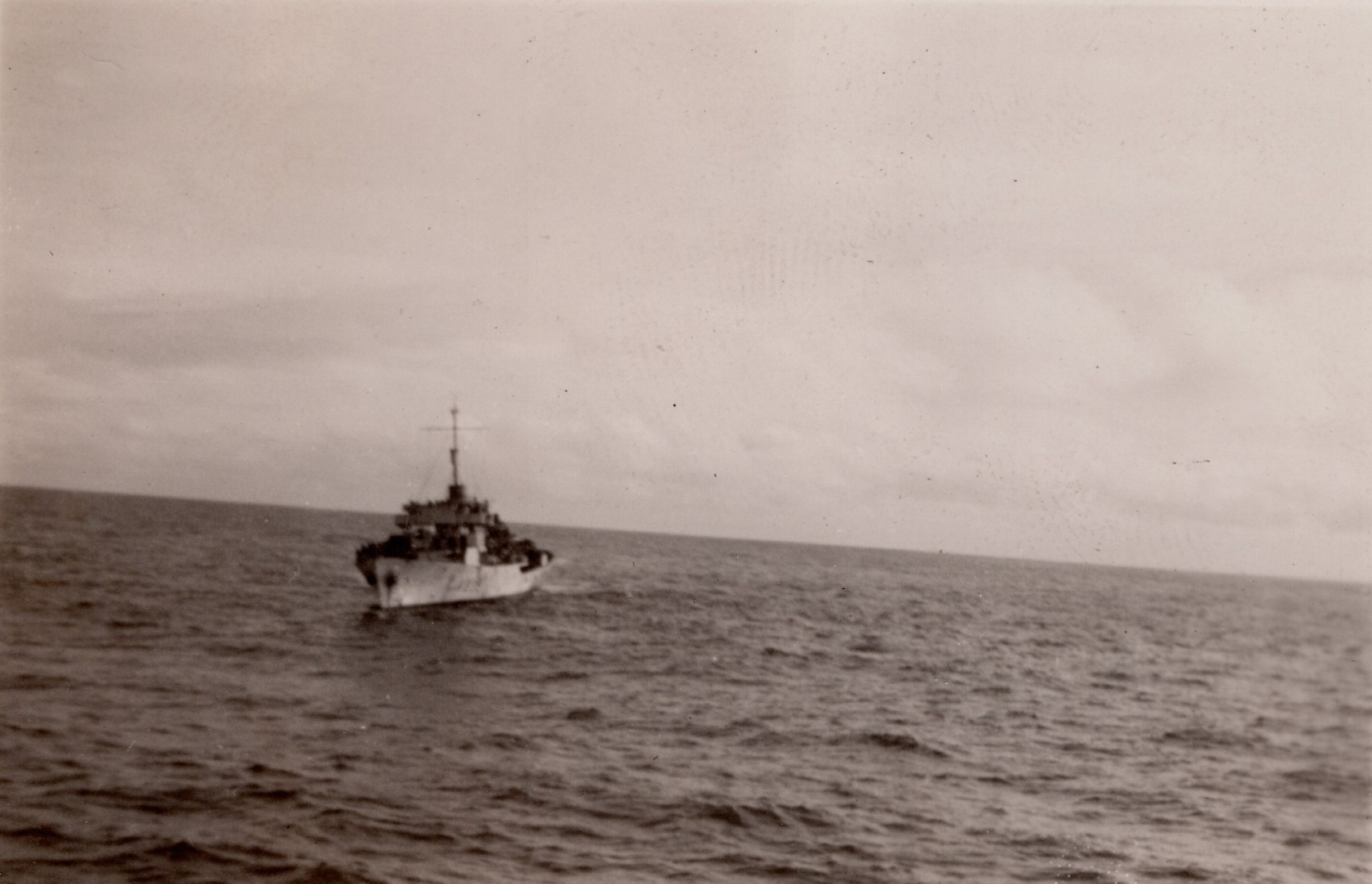 (NFA022) HMCS GIFFARD K402 in the Atlantic on Convoy Duty - Jun 1944 (NFA023) Small arms target shooting at sea on HMCS NEW GLASGOW K320 - Jun 1944 // Note the target stand secured to the stern of the ship. (NFA024) Merchant Aircraft Carrier Empire MacKay in convoy - Jun 1944 (NFA025) Merchant Aircraft Carrier Empire MacRae in convoy - Jun/Jul 1944 (NFA026) An English frigate [HMS MOURNE K261] about to dock at Londonderry Harbour (N. Ireland) (at the time their Signalman was calling shore station then HMCS NEW GLASGOW'S Signalman Norman Ayres answered) // back of photo