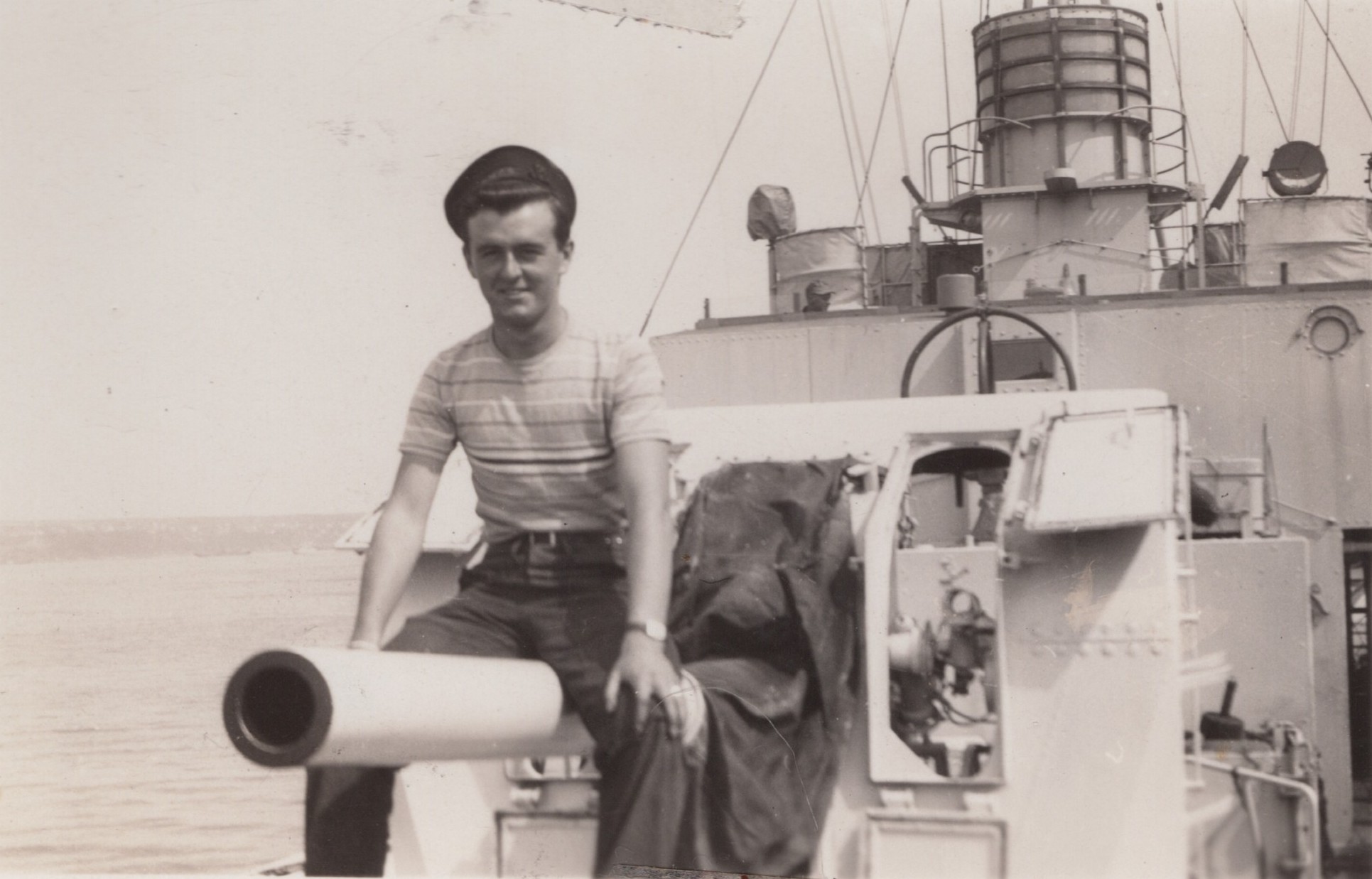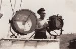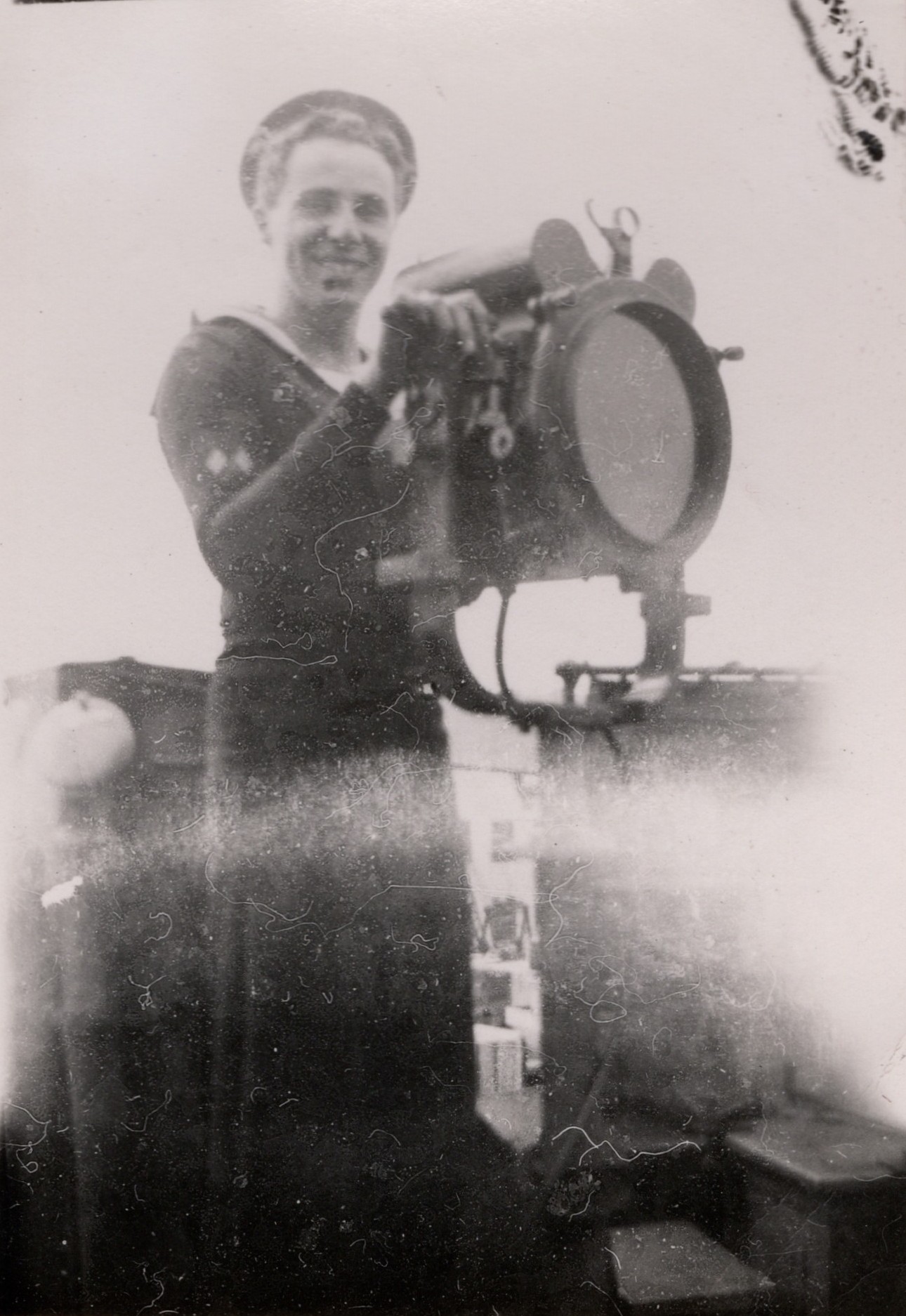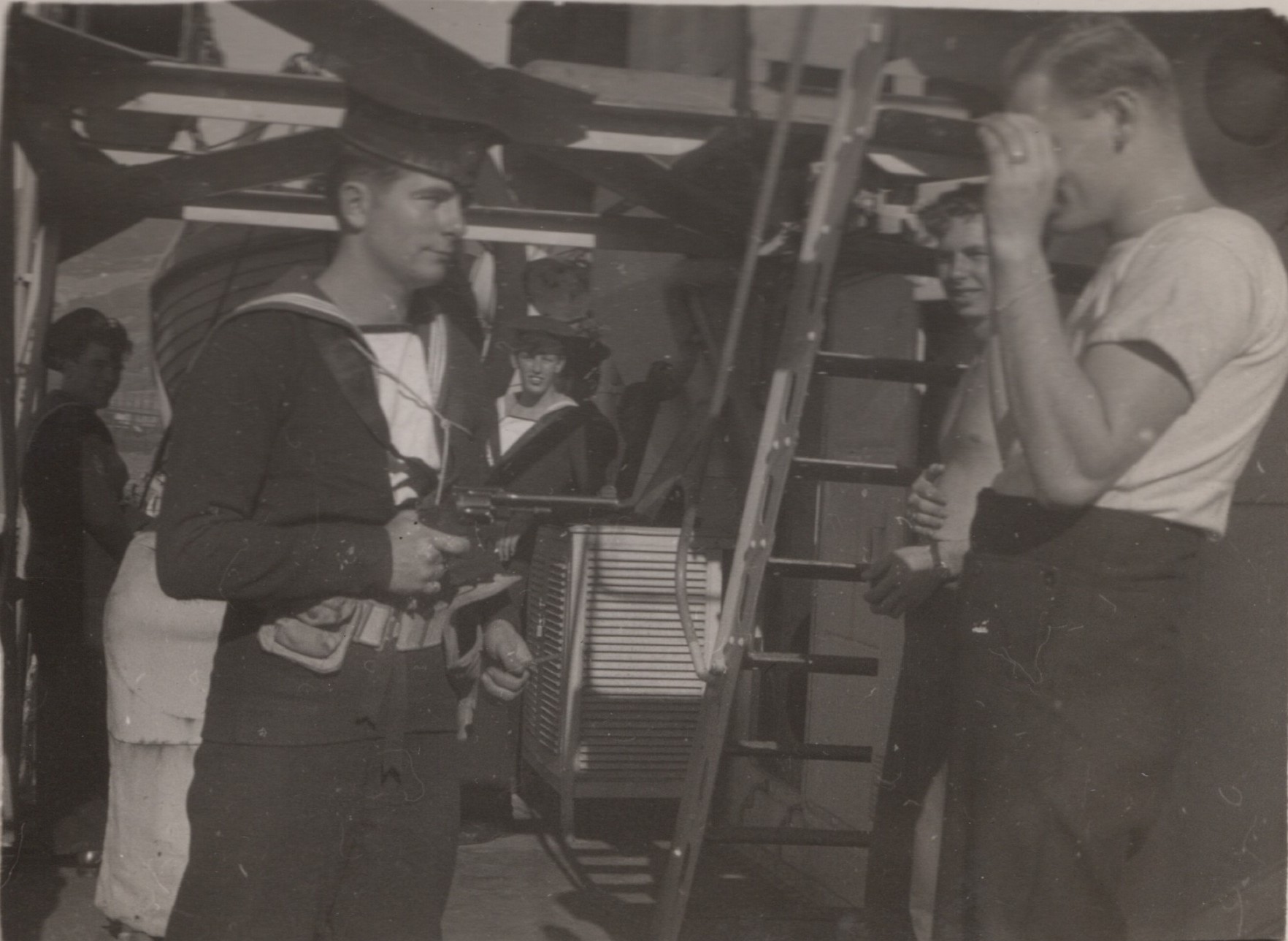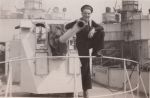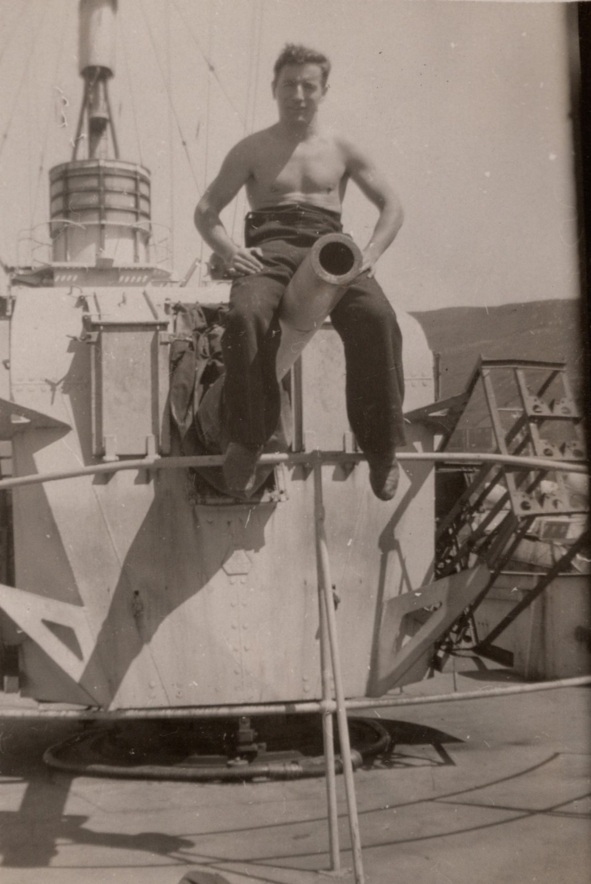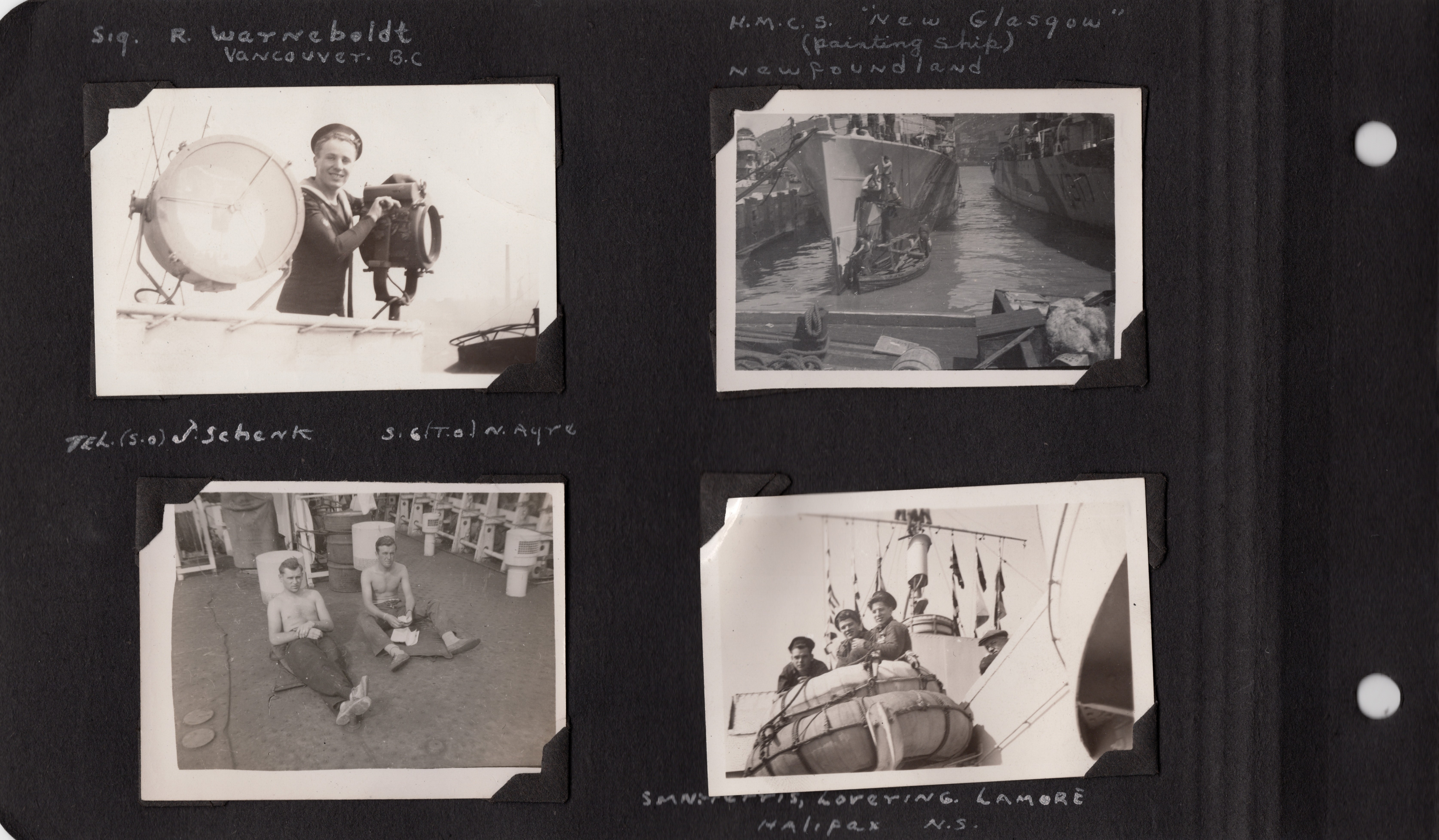 (NFA009) Signalman Norman Ayre by the signal light on HMCS NEW GLASGOW K320 at Halifax, NS. (NFA010) Signalman Norman Ayre sitting on the forward gun on HMCS NEW GLASGOW K320 at Halifax, NS. (NFA011) Signalman Ron Warneboldt by the forward gun on HMCS NEW GLASGOW K320 at Halifax, NS - Apr 1944 (NFA012) British sub in St. Margaret's Bay, NS - Spring 1944 (NFA013) Signalman Ron Warneboldt (of Vancouver, BC) by the signal light on HMCS NEW GLASGOW K320 - Halifax, May 1944