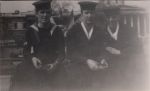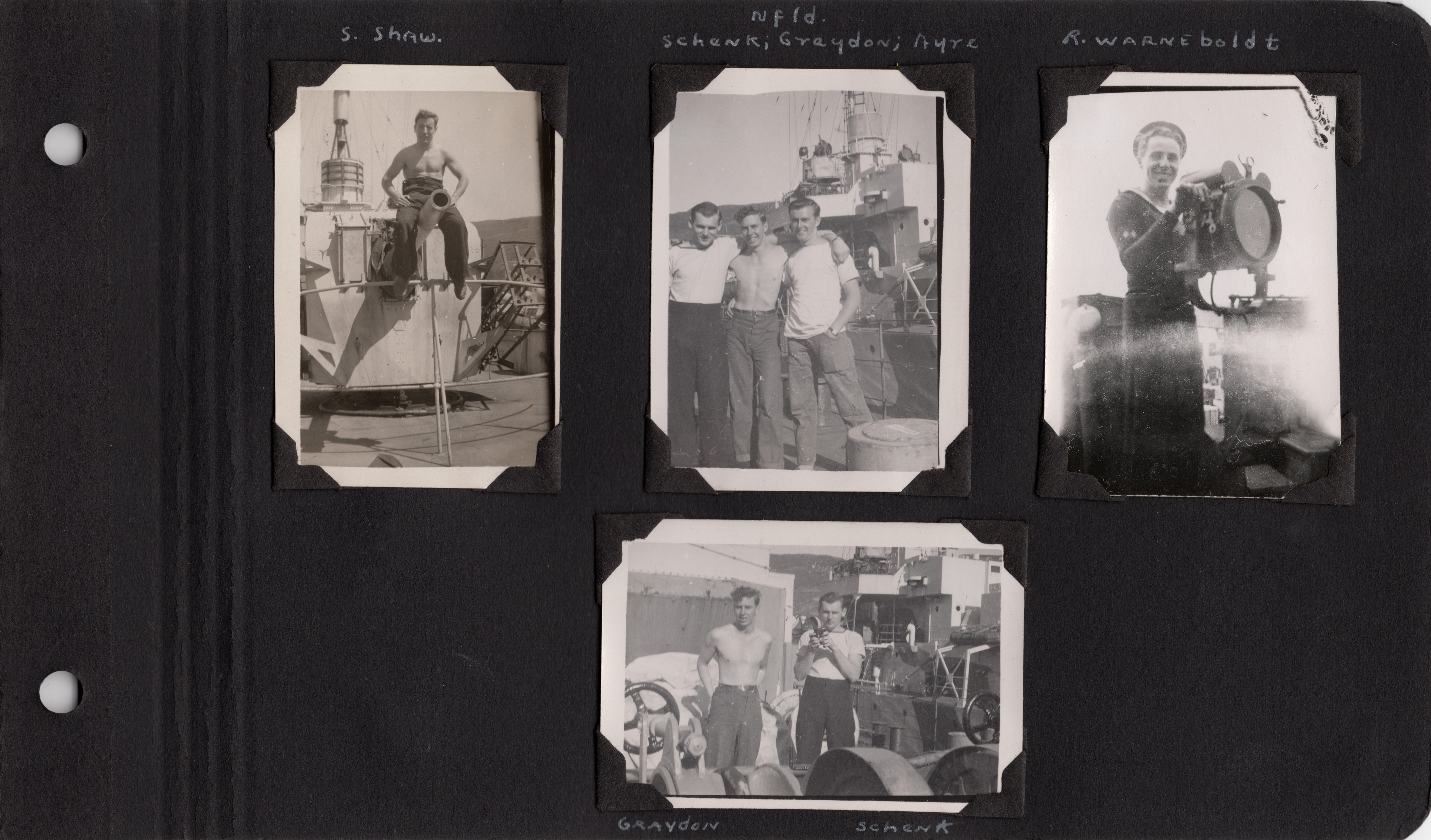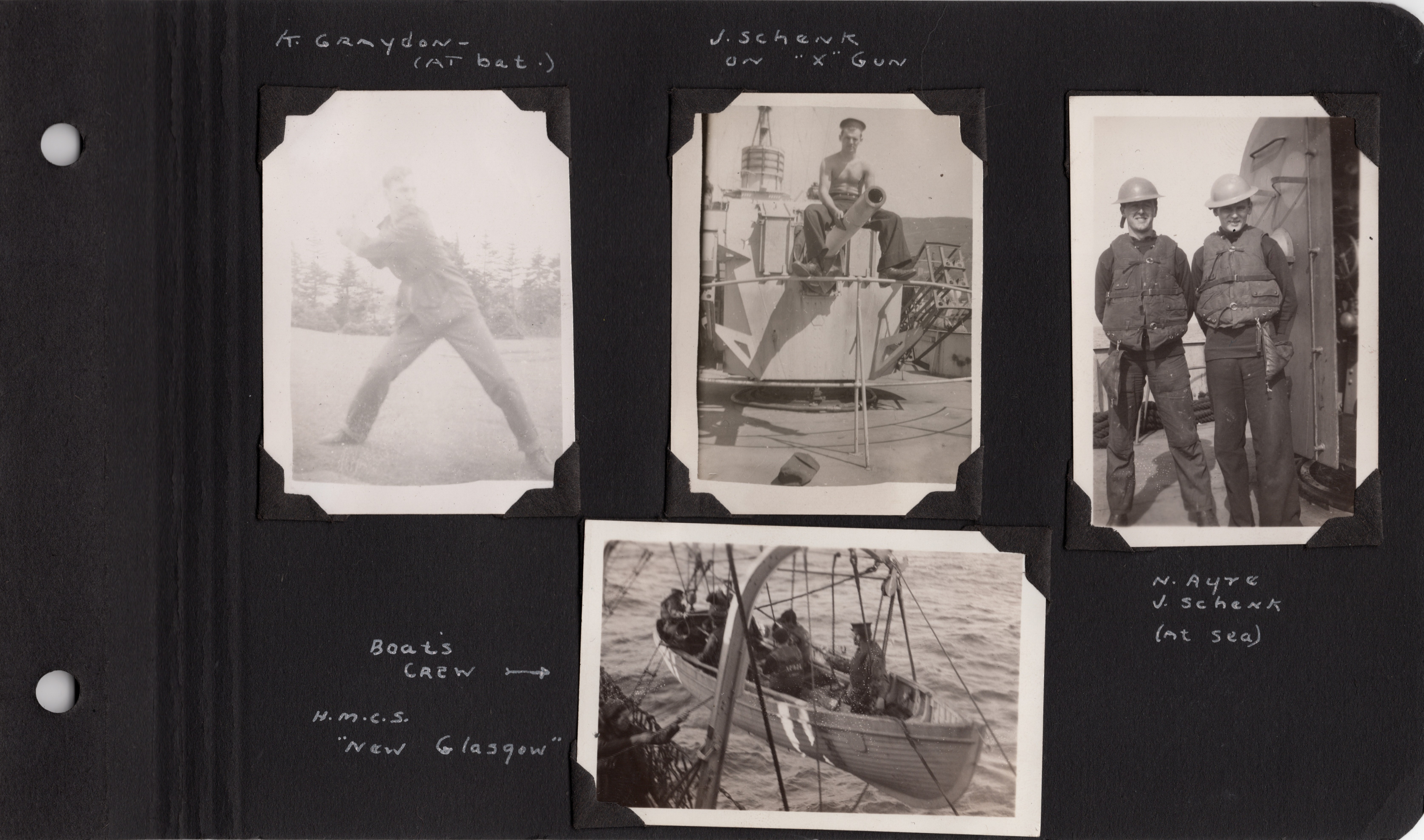 (NFA039) Telegraphist John Schenk sitting on "B" gun at St. John's, Nfld (NFA040) Coder Sam Shaw sitting on "B" gun at St. John's, Nfld - Jul 1944 (NFA041) Pay writer H. Whitson, Leading Coder J. Black, and Petty Officer Telegraphist O. Robert on "X" gun deck HMCS NEW GLASGOW K320 (NFA042) Telegraphist John Schenk, Telegraphist Ken Graydon, and Signalman Norman Ayres on HMCS NEW GLASGOW K320 at St. John's, Nfld - Jul 1944. HMCS CHEBOGUE K317 in background (NFA043) Telegraphist Ken Graydon, Telegraphist John Schenk, H/F D/F operators on HMCS NEW GLASGOW K320, St. John's, Nfld - Jul 1944. HMCS CHEBOGUE K317 in the background