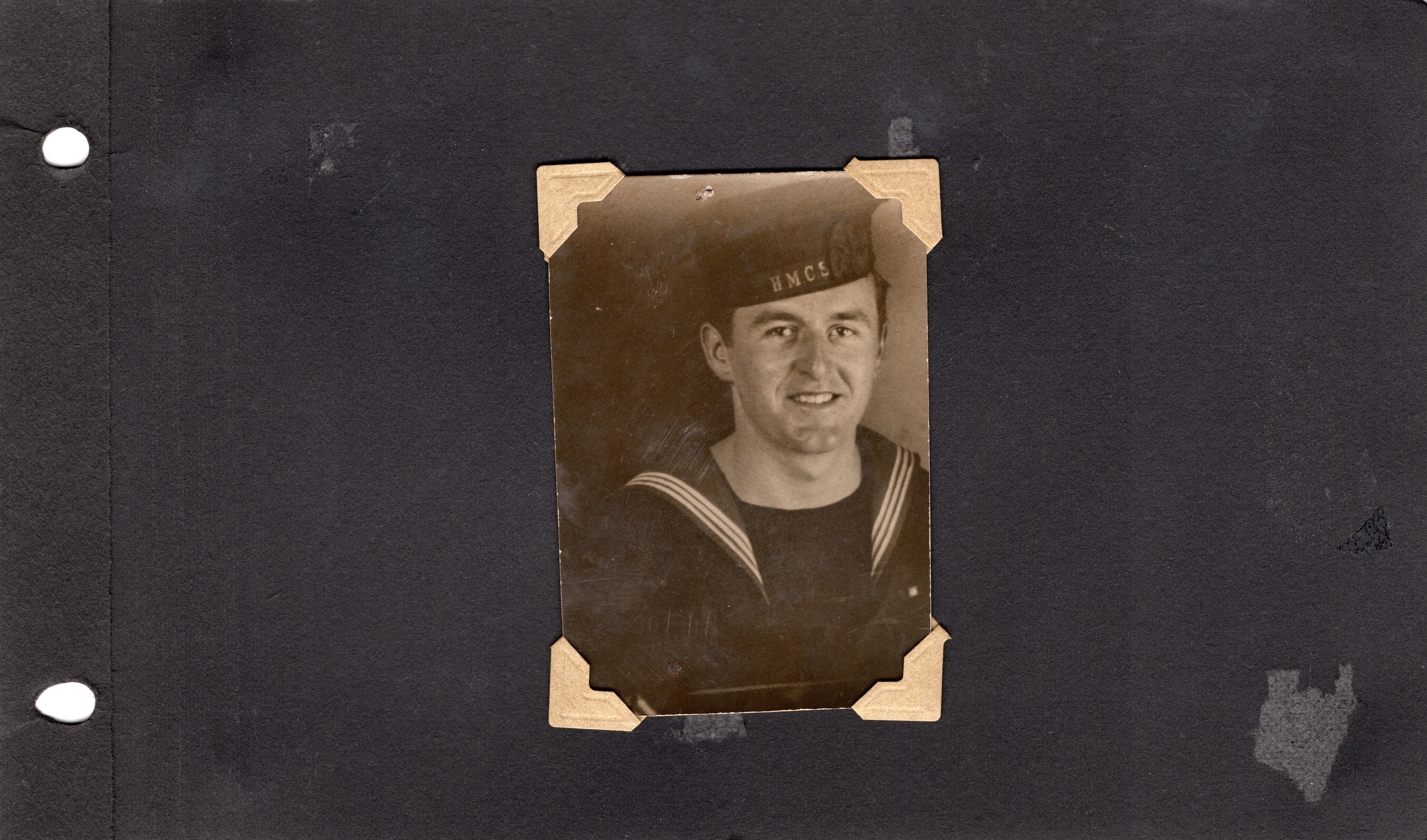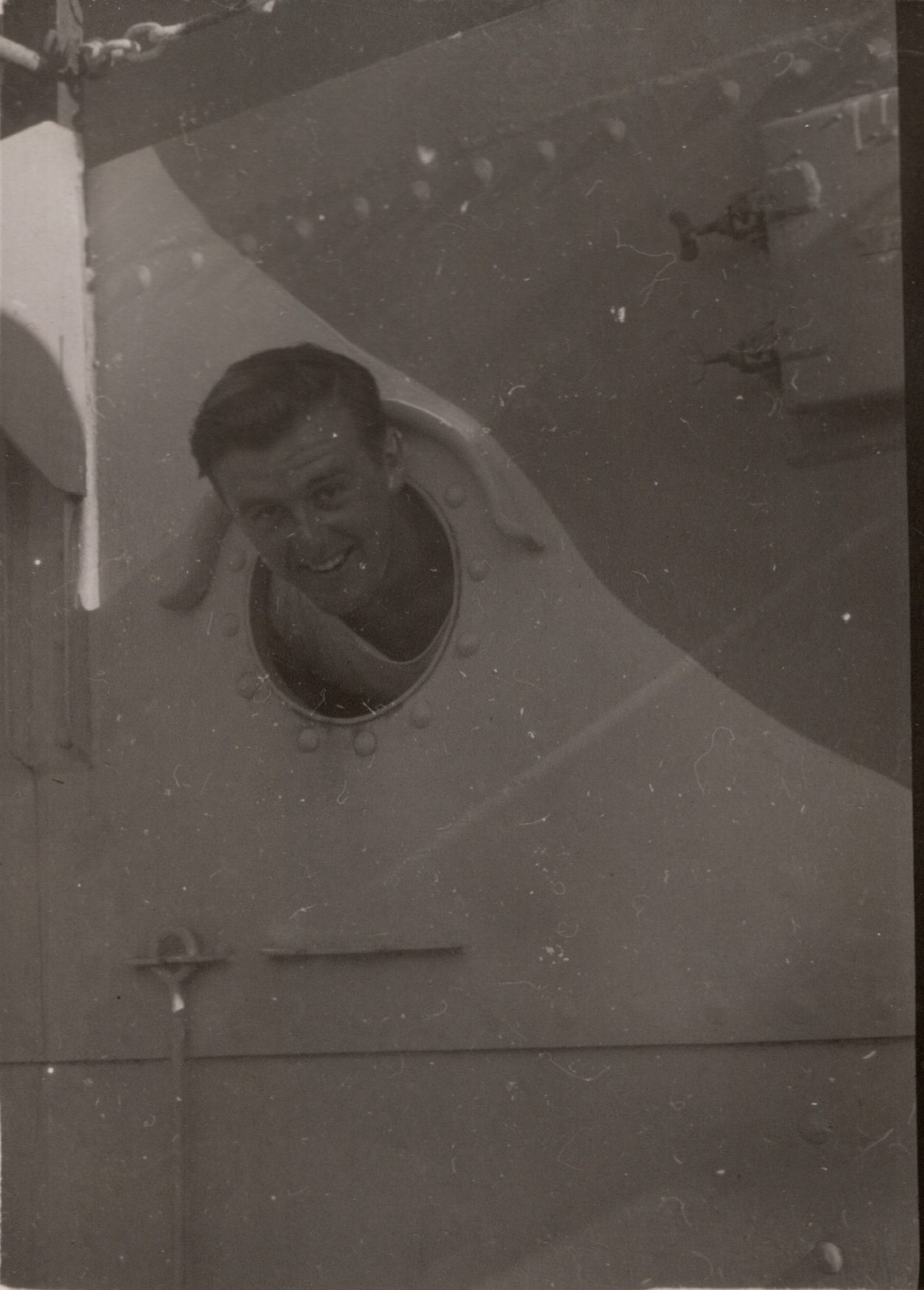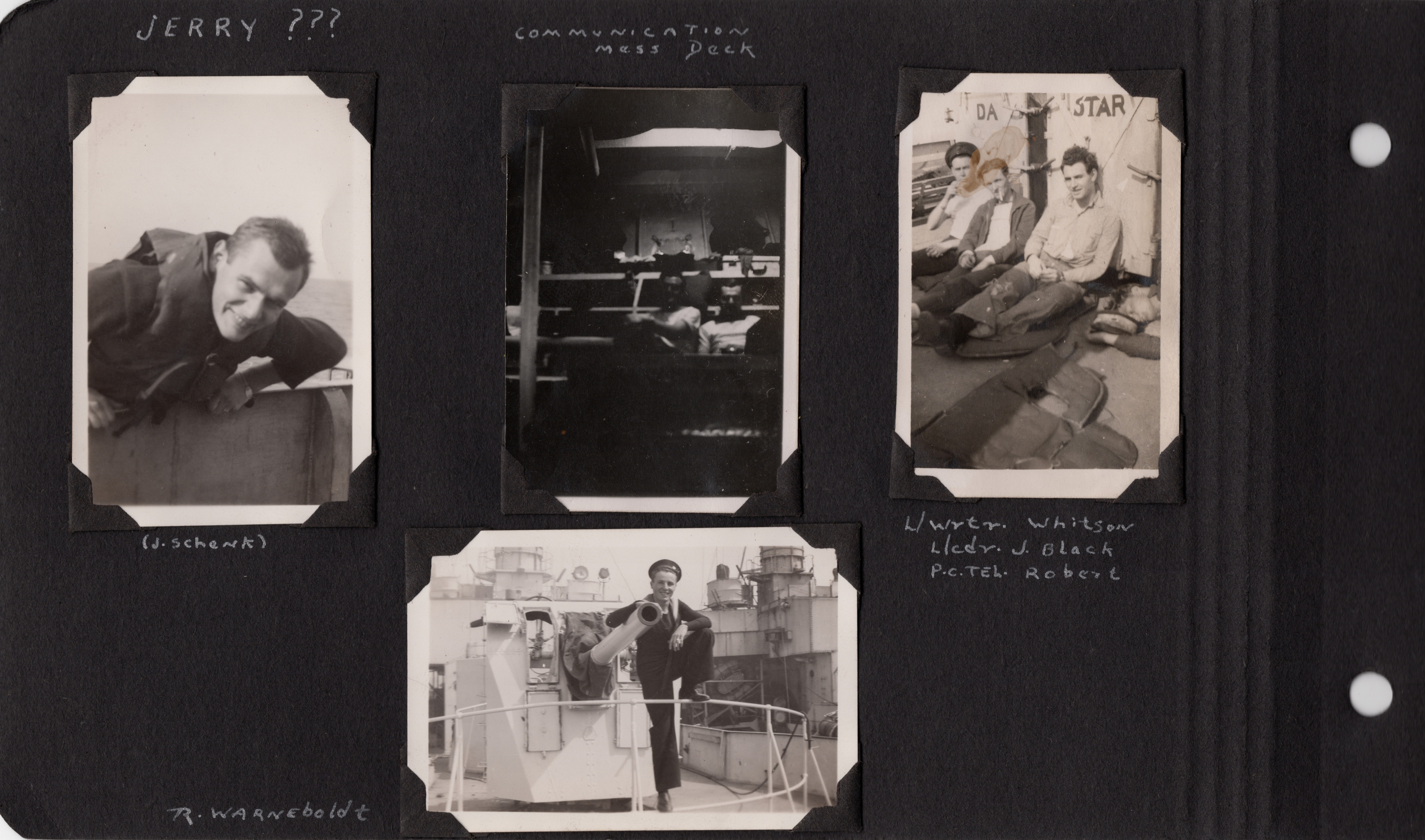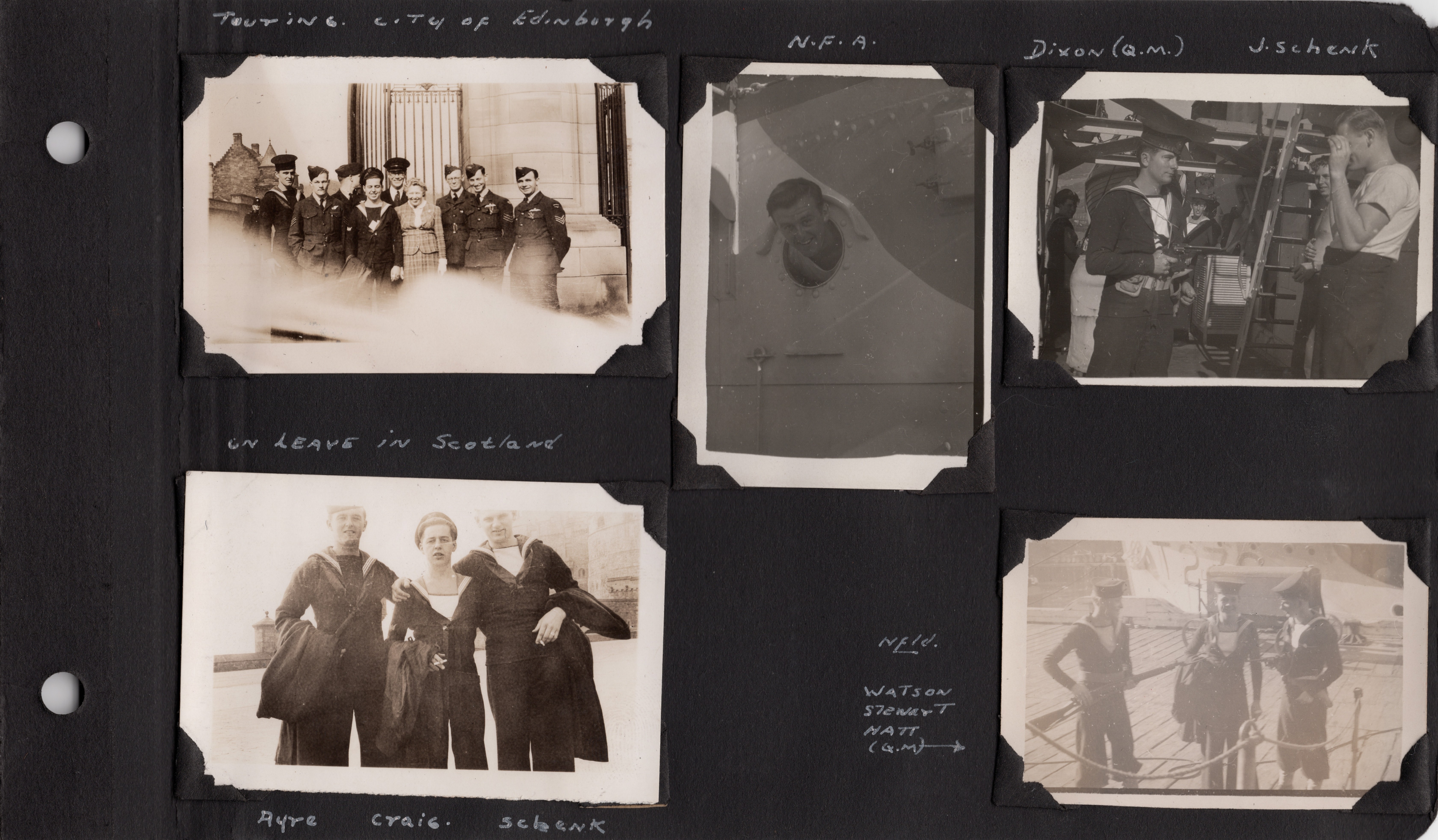 (NFA084) Ship's company of HMCS JOLIETTE K418 at Sunday Divisions, St. John's, Nfld - Aug 1944. Photos taken from the bridge of HMCS NEW GLASGOW K320 (NFA085) L-R: Submarine Detector Lovering, Quartermaster Dickson, Quartermaster, Heaving Line Seaman; Telegraphist John Schenk H/F D/F Operator // Back of photo (NFA086) L-R: Radar Operator 2c Watson, Seaman Stuart, Quartermaster Dickson at St. John's, Nfld - Jul 1944 (NFA087) Signalman Norman Ayre looking out a port hole on HMCS NEW GLASGOW K320 at St. John's, Nfld - Jul 1944