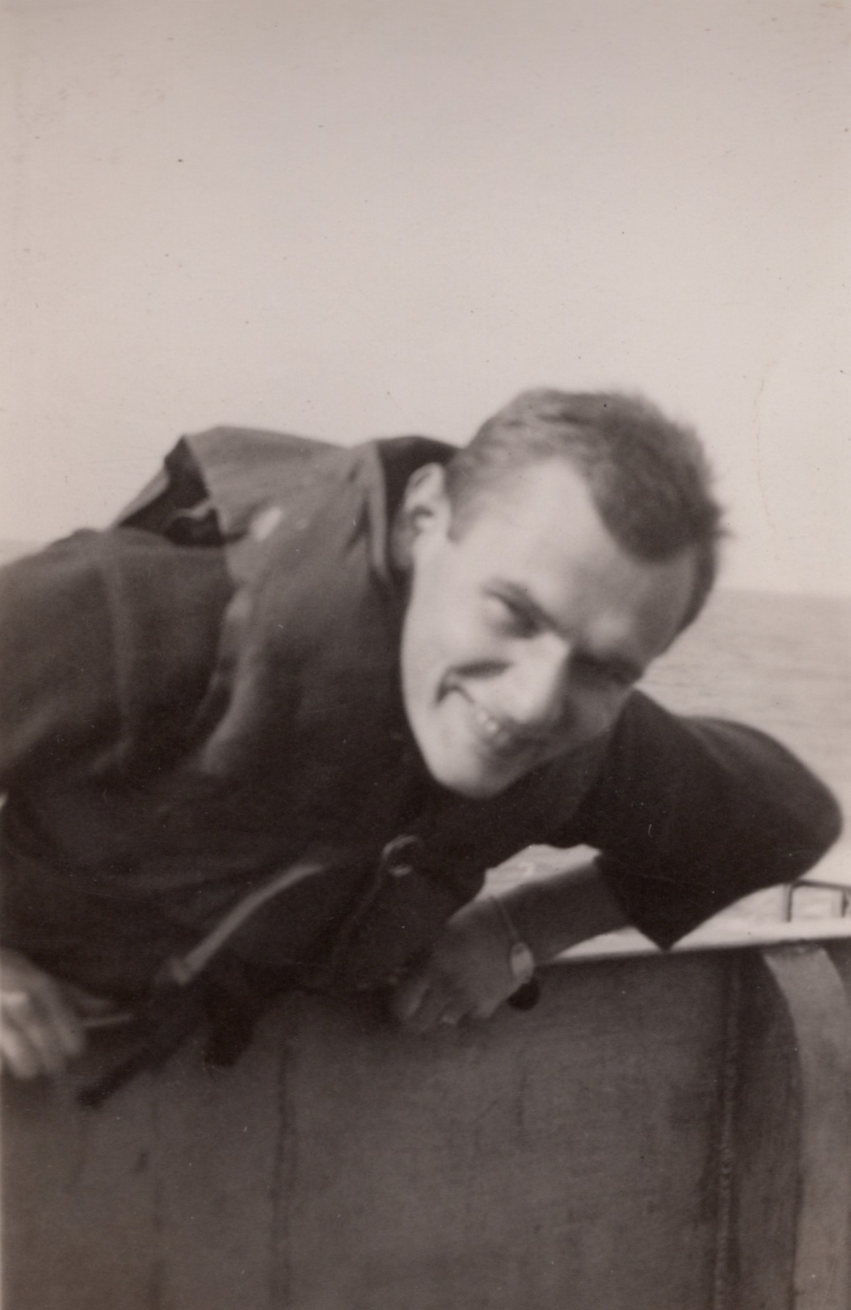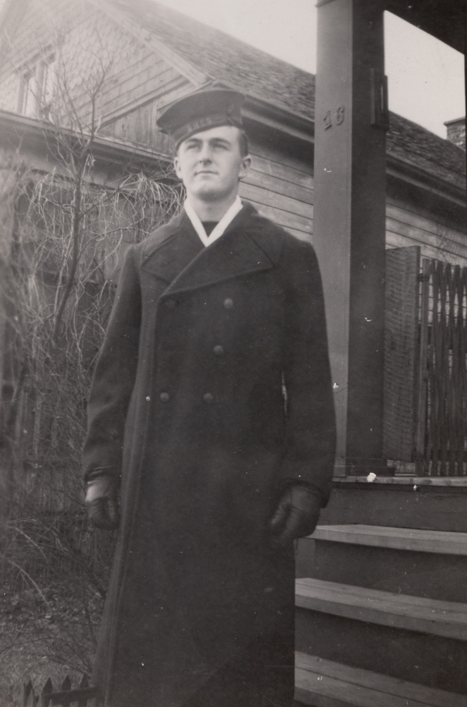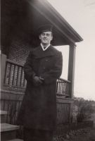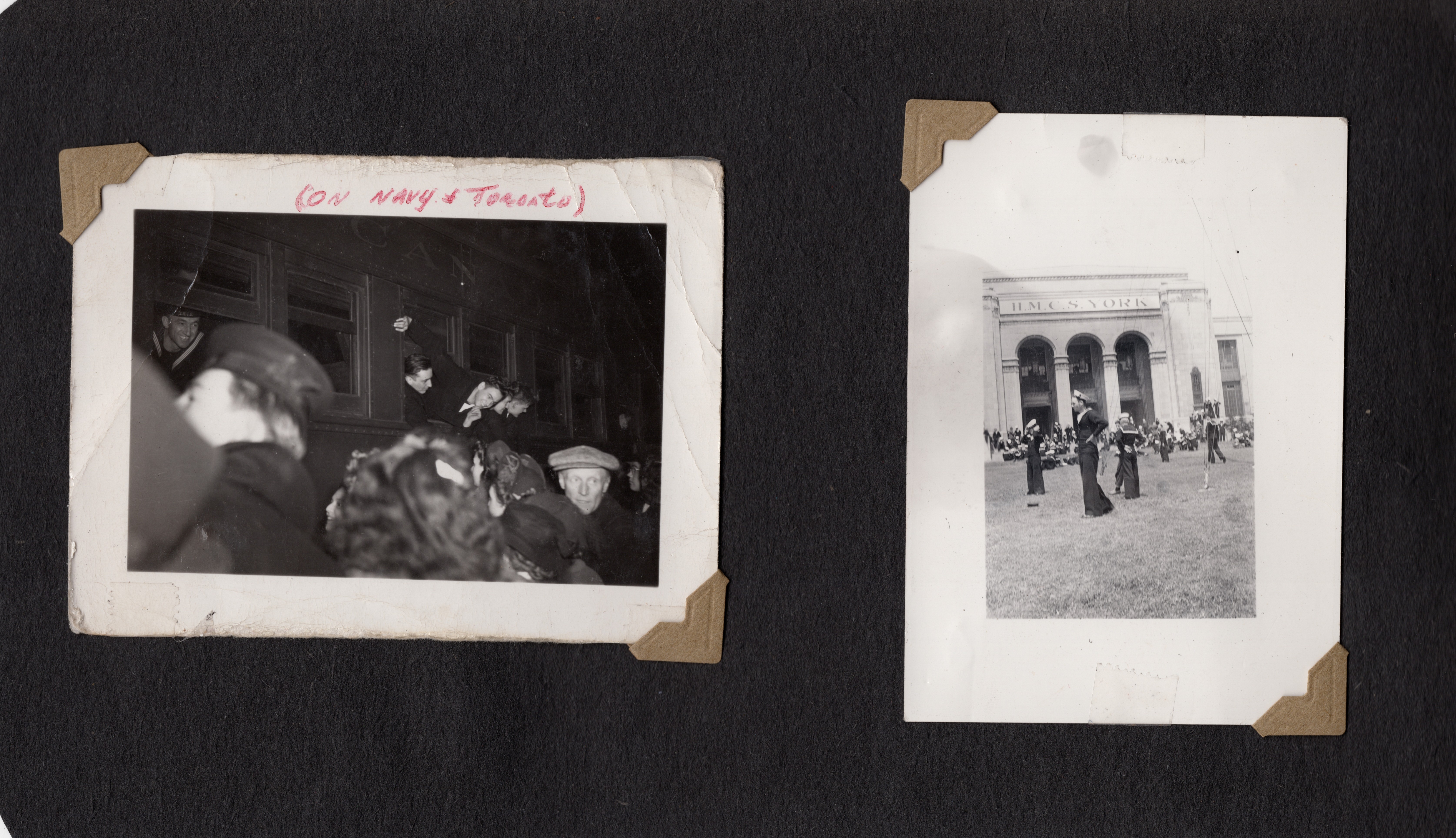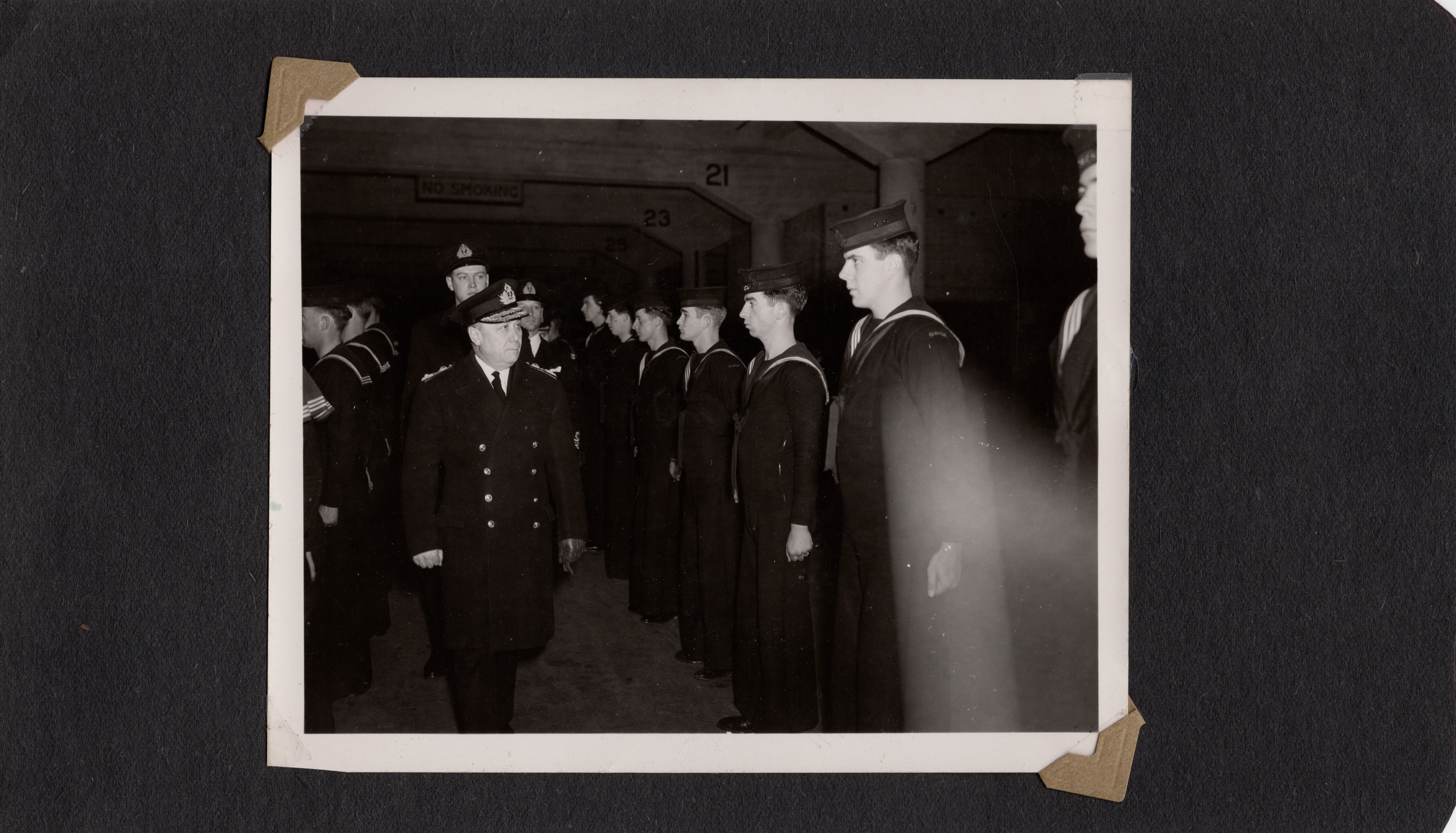 (NFA084) Ship's company of HMCS JOLIETTE K418 at Sunday Divisions, St. John's, Nfld - Aug 1944. Photos taken from the bridge of HMCS NEW GLASGOW K320 (NFA085) L-R: Submarine Detector Lovering, Quartermaster Dickson, Quartermaster, Heaving Line Seaman; Telegraphist John Schenk H/F D/F Operator // Back of photo (NFA086) L-R: Radar Operator 2c Watson, Seaman Stuart, Quartermaster Dickson at St. John's, Nfld - Jul 1944 (NFA087) Signalman Norman Ayre looking out a port hole on HMCS NEW GLASGOW K320 at St. John's, Nfld - Jul 1944