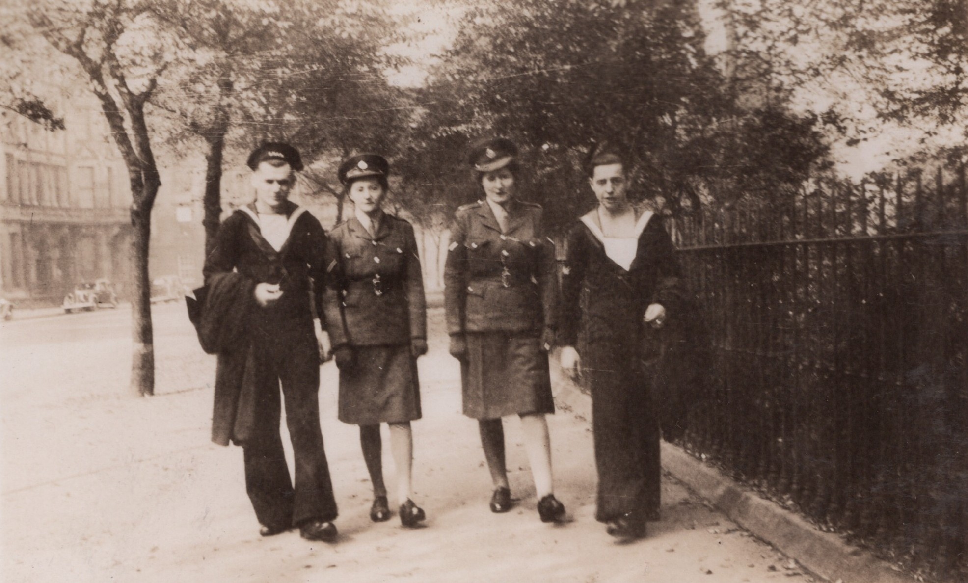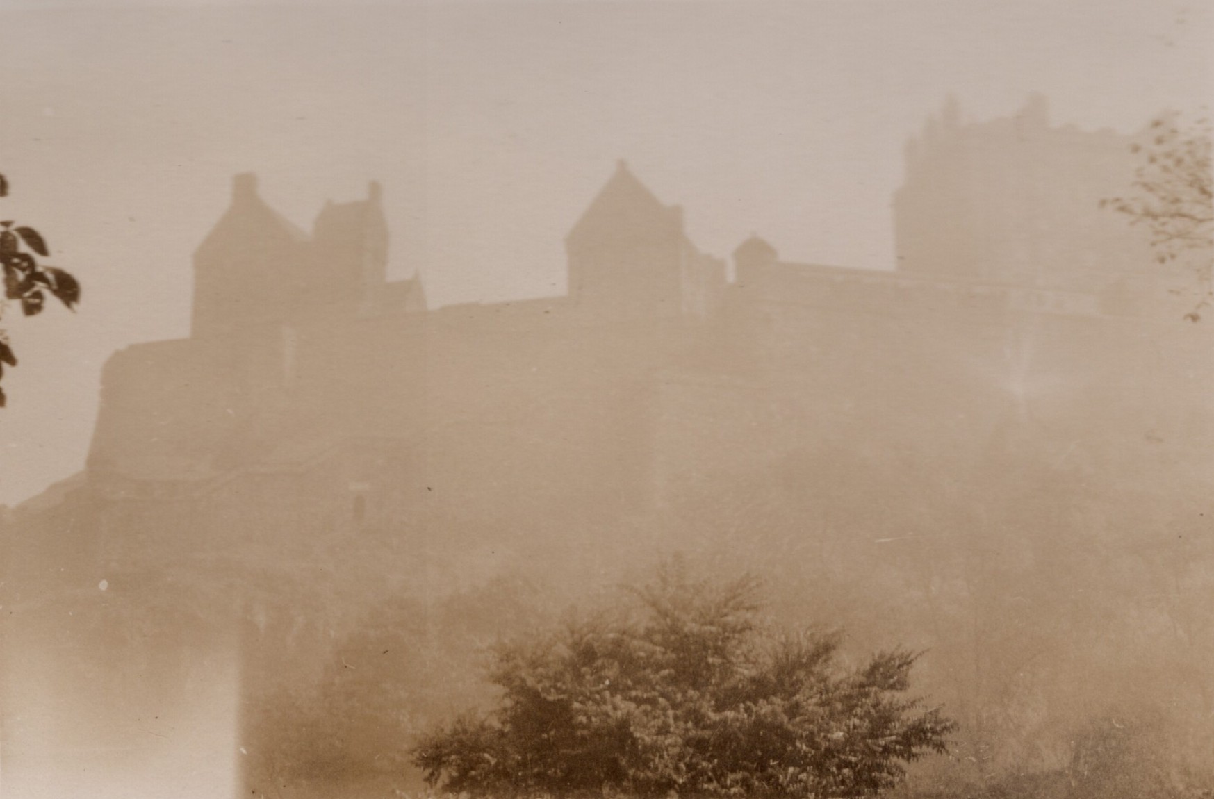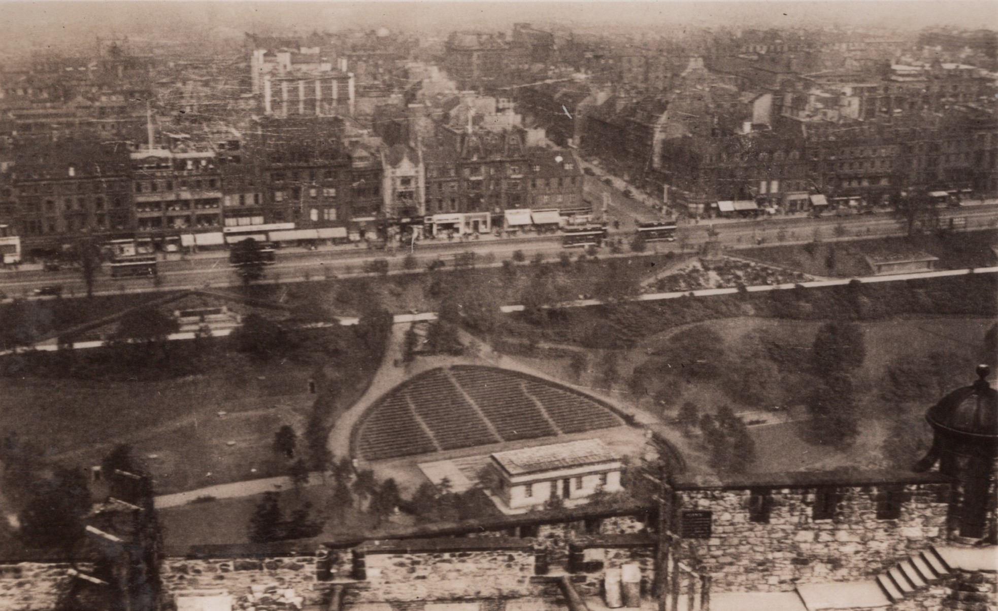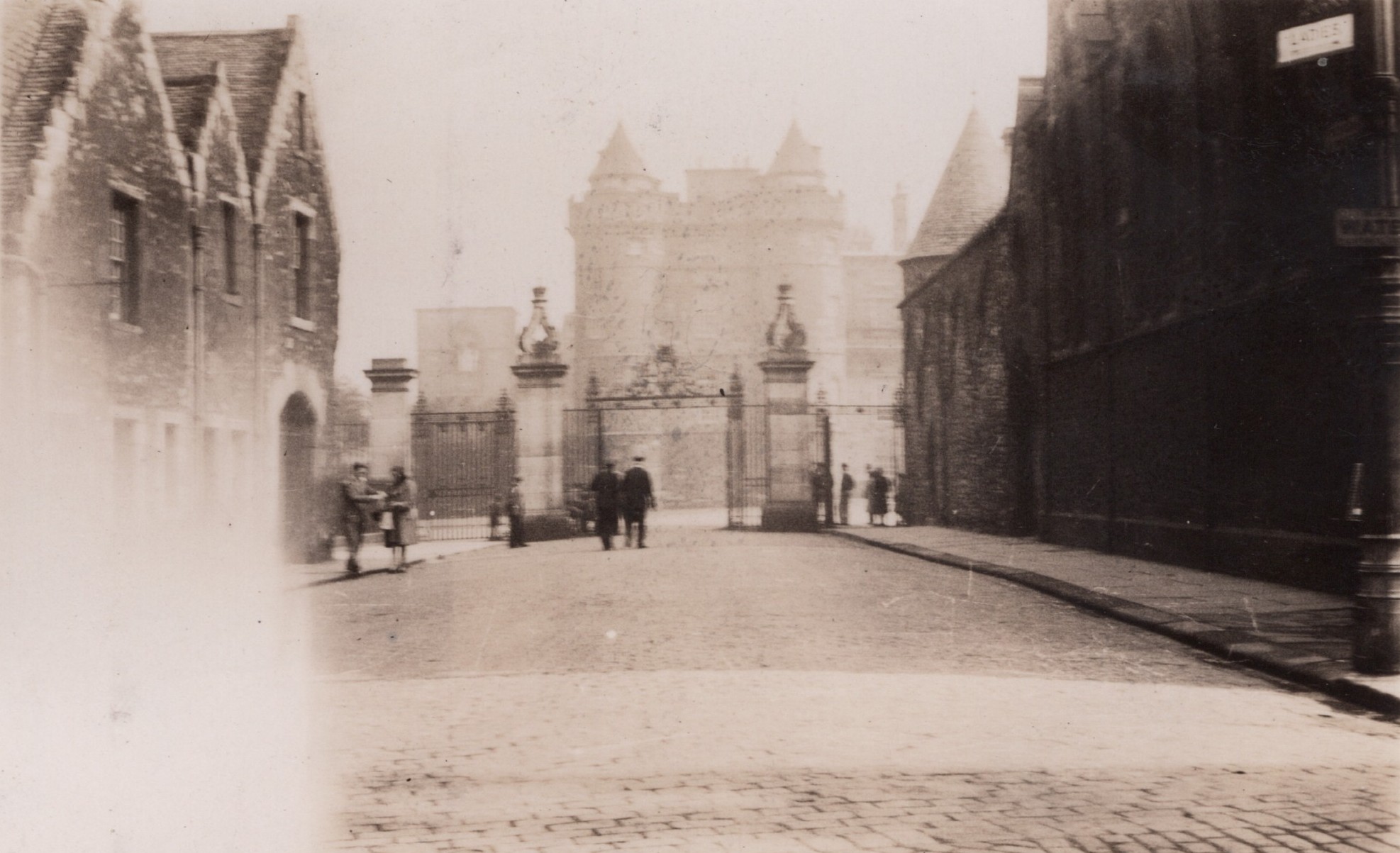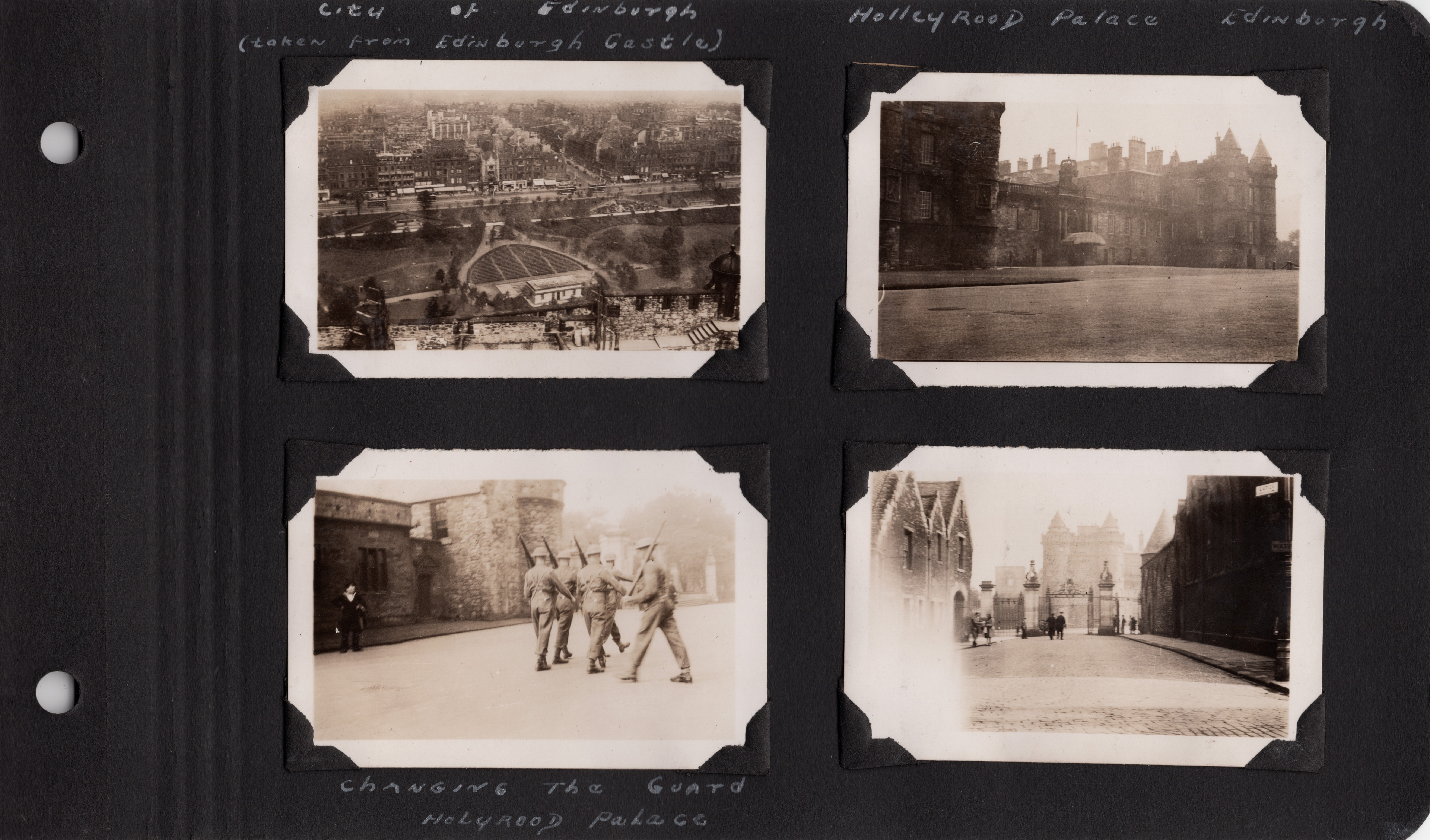 (NFA093) Crowd waiting for King and Queen on Princess St., Edinburgh, Scotland. Photo taken from window ledge on Victoria League - Sep 1944 (NFA094) Signalman Norman Ayre sitting on a cannon inside Edinburgh Castle, Edinburgh, Scotland - Sep 1944 (NFA095) "On the wolf" - Telegraphist John Schenk and Telegraphist Norman Craig with 2 ATS MP's - trying to pick up on way to Edinburgh, Castle, Edinburgh, Scotland - Sep 1944 (NFA096) Taken from Edinburgh Castle overlooking Princess St. and Gardens, Edinburgh, Scotland - Sep 1944 (NFA097) Hollyrood Palace, Edinburgh, Scotland. King, Queen and Princess stopped there on visiting Scotland - Sep 1944