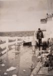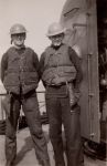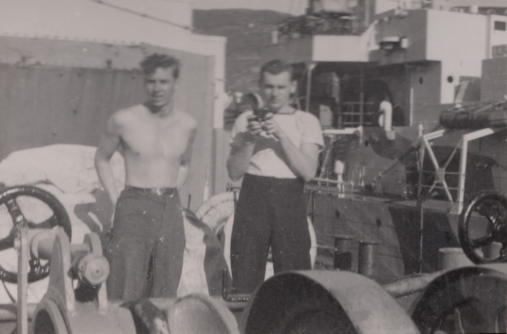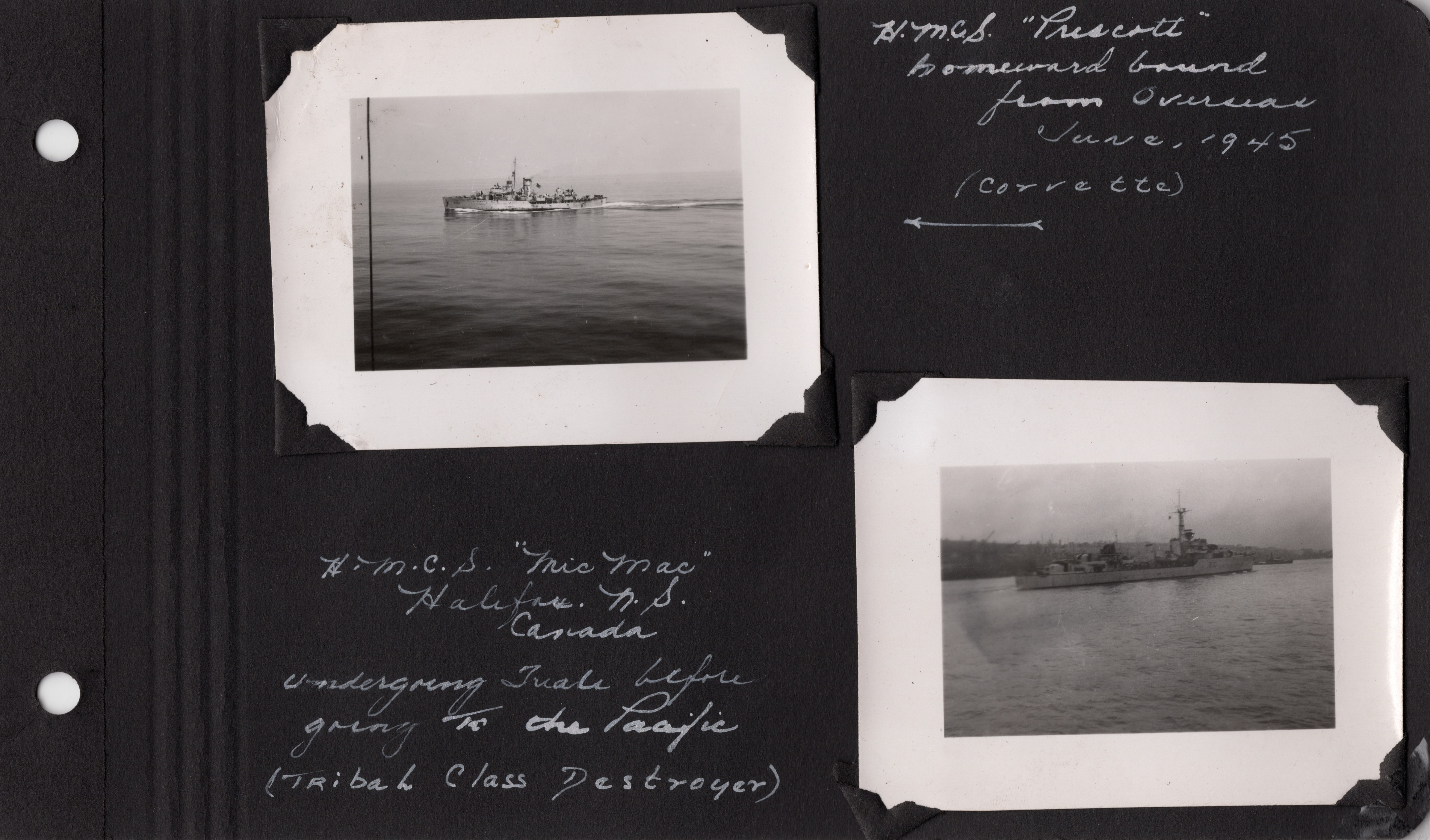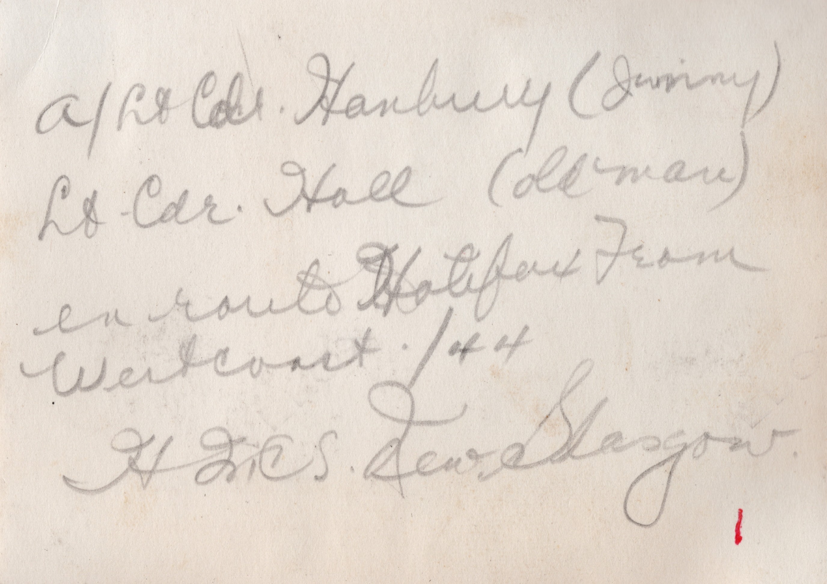 (NFA006) A/LCdr Hanbury (the Jimmy) and LCdr Hall (Old Man) [on HMCS NEW GLASGOW K320 en route to Halifax from the west coast - 1944 // back of photo. Note: The New Glasgow arrived in Halifax on 17 Feb 1944. (NFA007) HMCS NEW GLASGOW K320 off Halifax, NS - Feb 1944 (NFA008) "Chippy" on HMCS NEW GLASGOW K320 off Halifax, NS