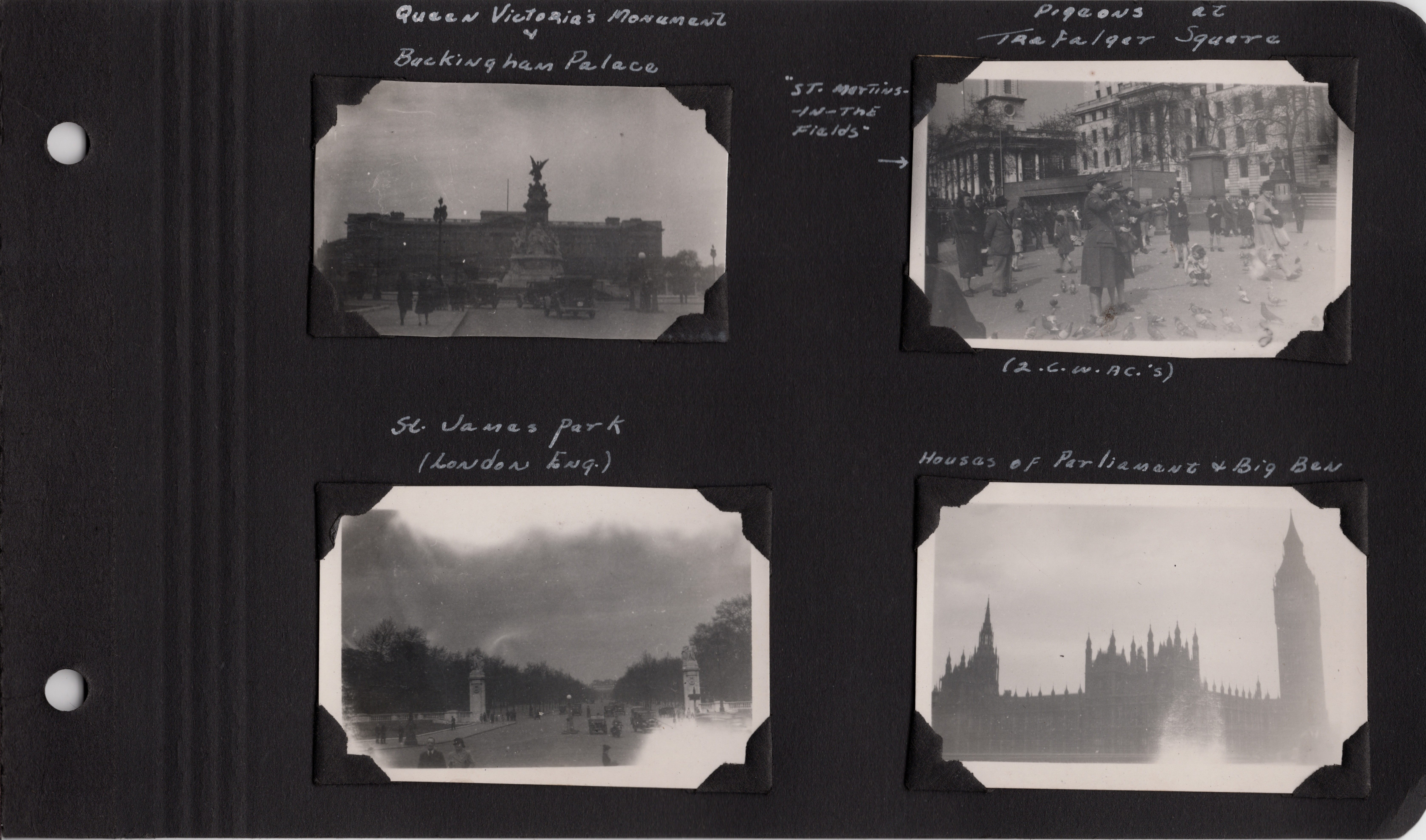 (NFA120) Westminster Abby, London, England (NFA121) Nelson's Monument, Trafalgar Square, London, England (NFA122) Signalman Norman Ayre, Coder Ross McLeod and Telegraphist Walter Cooper, London, England, Mar 1945 (NFA123) Tower of London, London, England (NFA124) Queen Victoria's Monument in front of Buckingham Palace