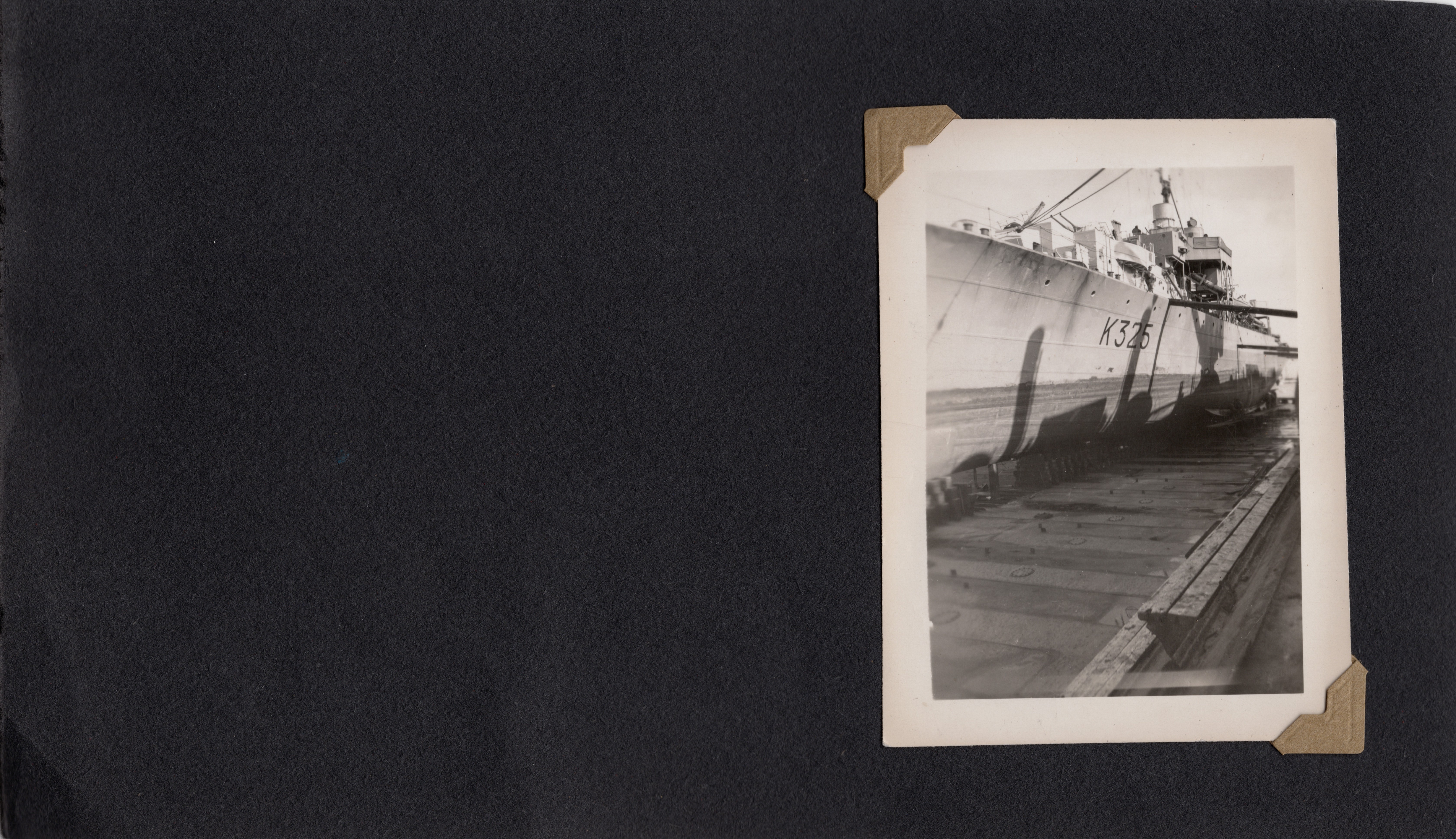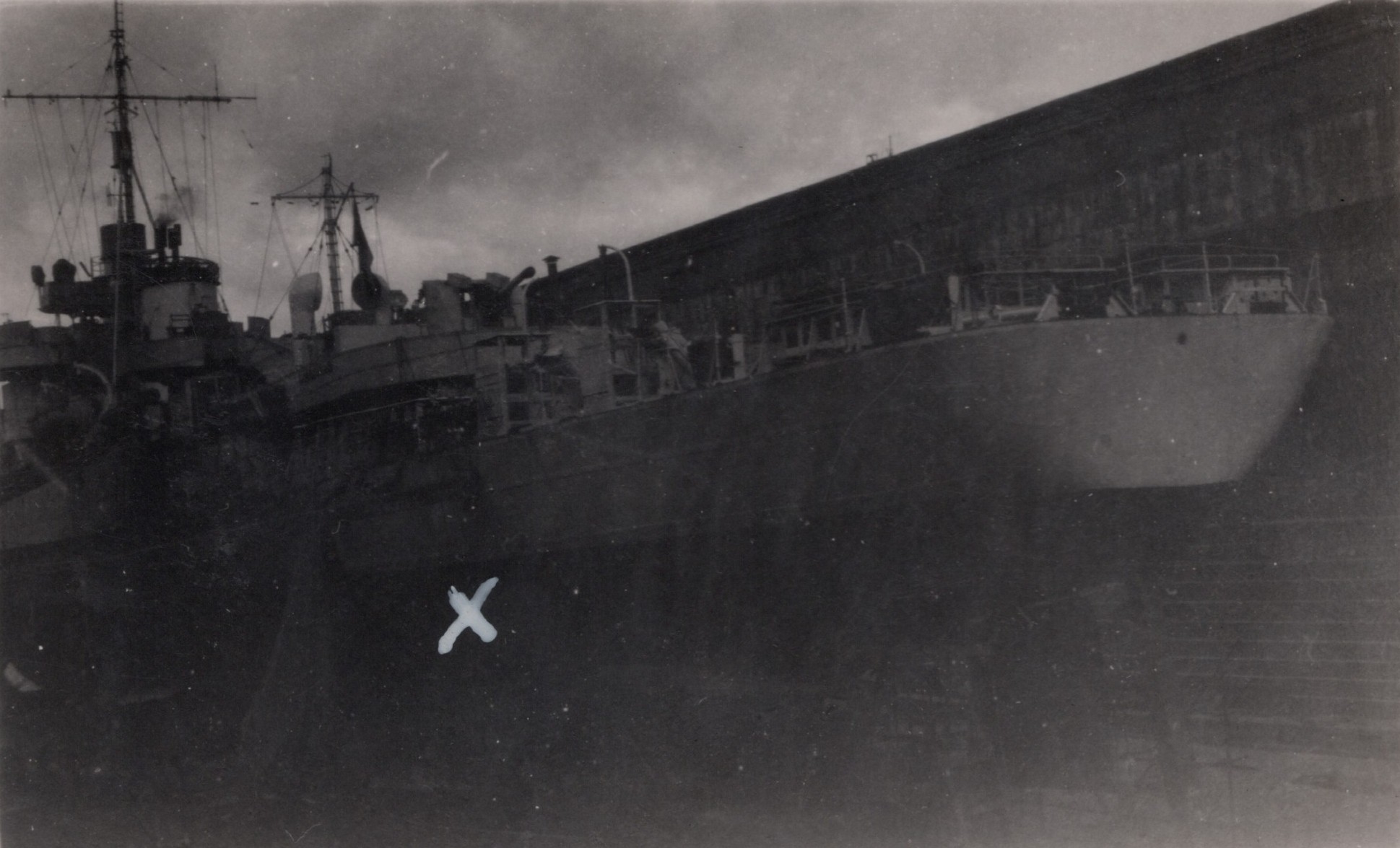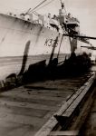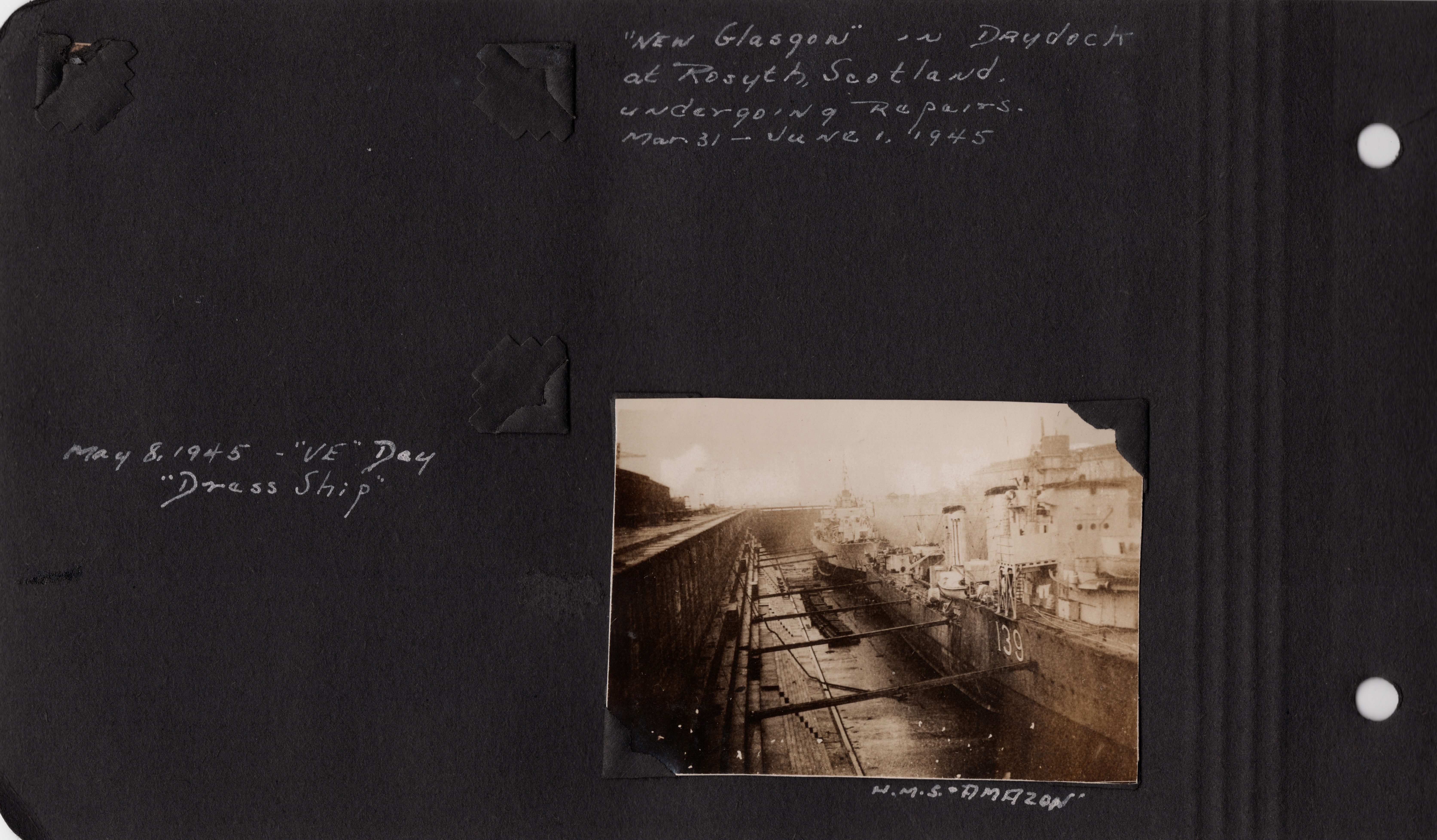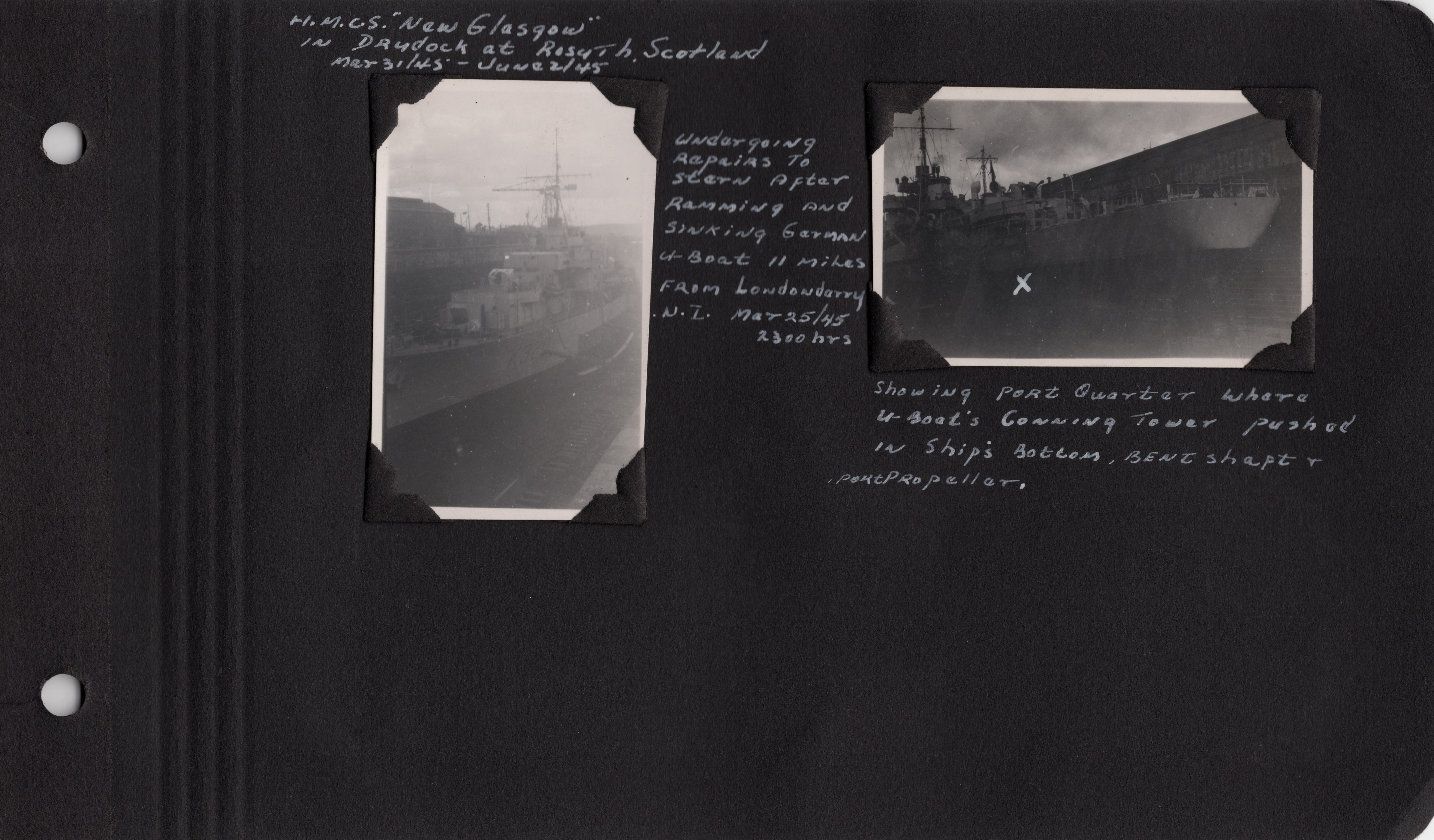 (NFA109) HMCS NEW GLASGOW K320 in drydock at Roysyth, Scotland for repairs after ramming U-1003 off Lough Foyle, approximately 11 miles from Londonderry, on 21 Mar 1945 at 2300 hours. (NFA110) The "X" marks the area on HMCS NEW GLASGOW K320 where U-1003's conning tower push in the ship's hull, bent the shaft and port propeller (NFA111 - NFA112) HMCS NEW GLASGOW K320 with ship dressed for V.E. Day while in drydock at Rosyth, Scotland (NFA113) HMS AMAZON I39 in drydock at Rosyth, Scotland with HMCS NEW GLASGOW K320 astern of her