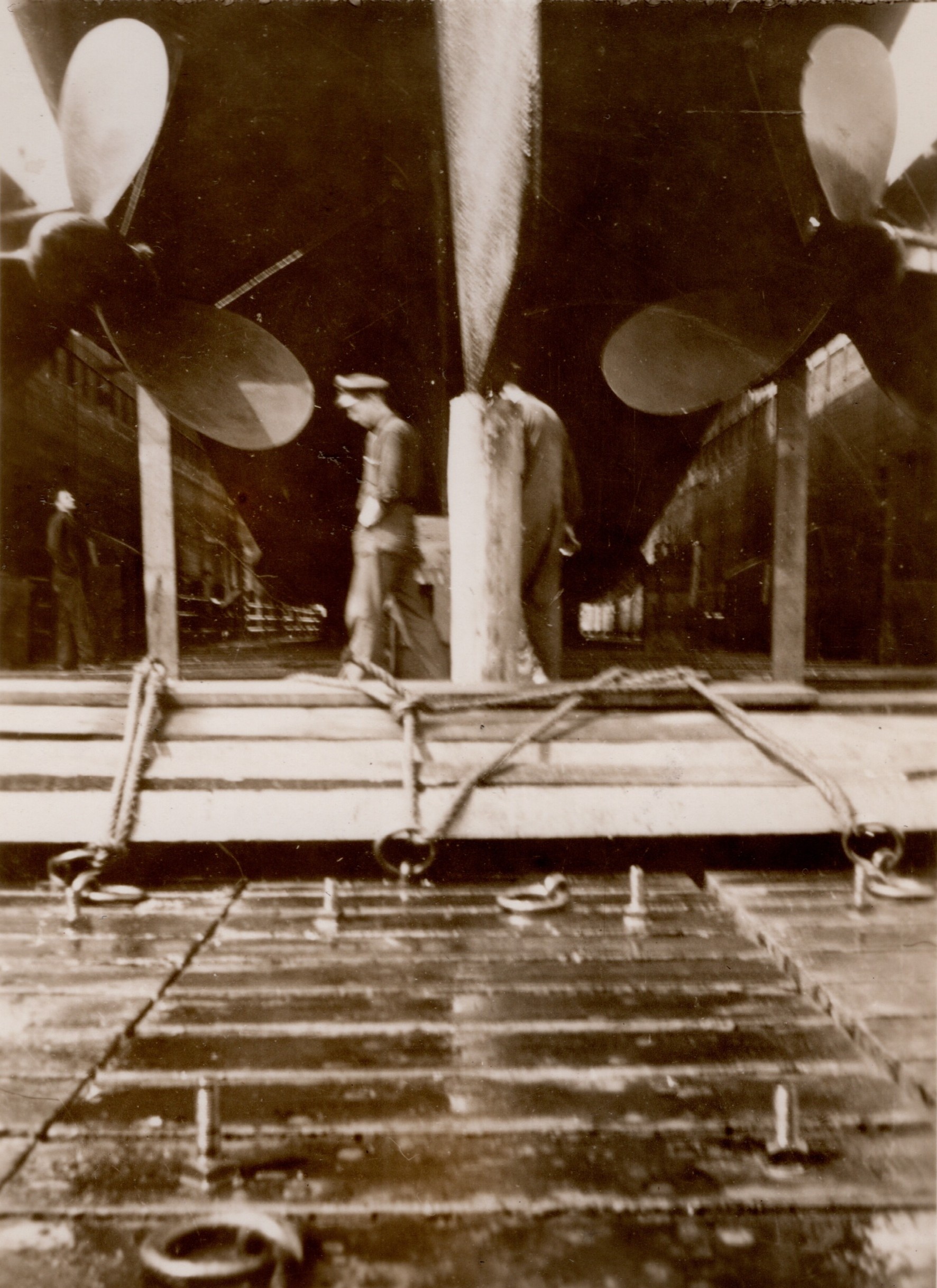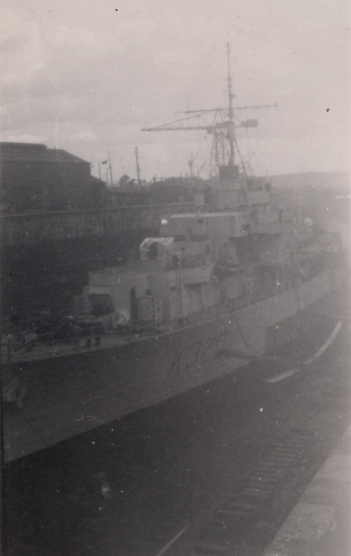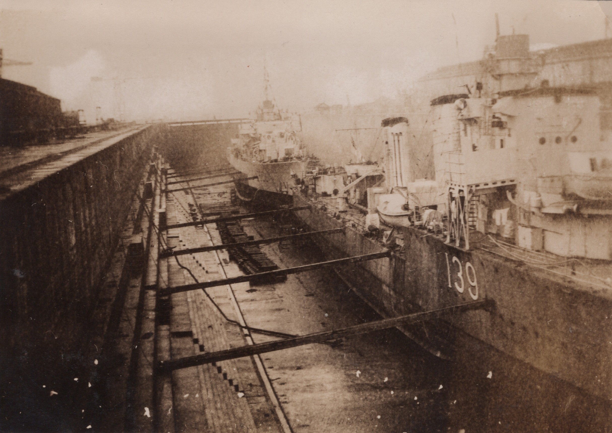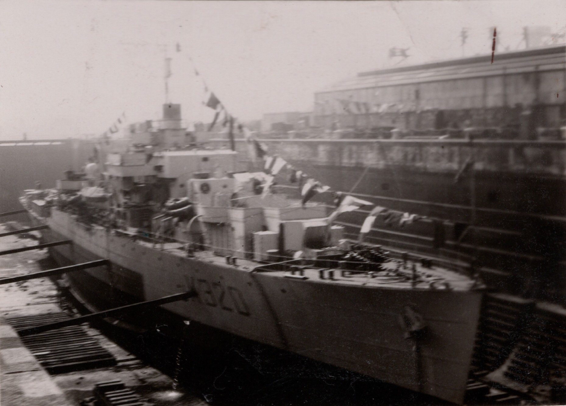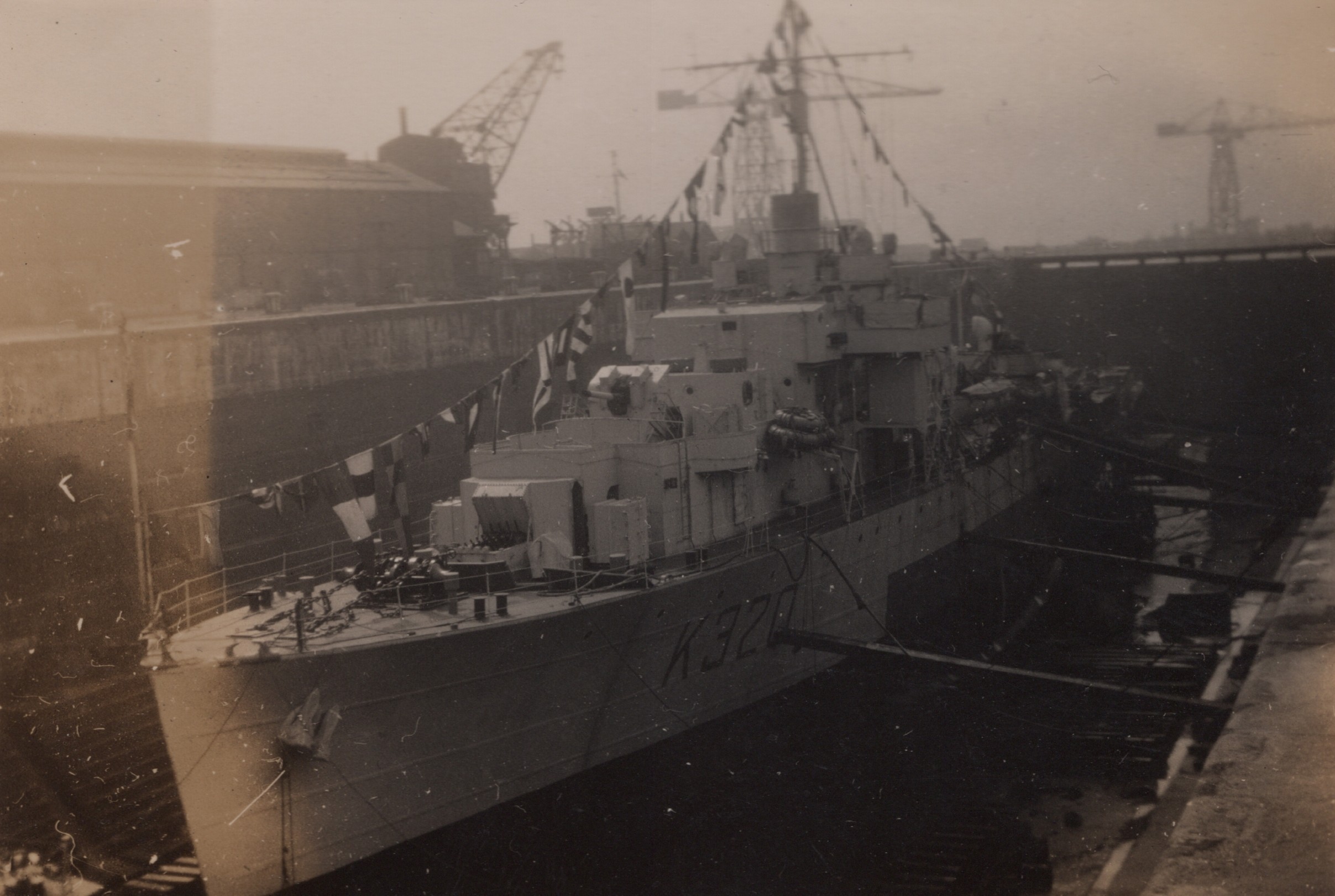 (NFA109) HMCS NEW GLASGOW K320 in drydock at Roysyth, Scotland for repairs after ramming U-1003 off Lough Foyle, approximately 11 miles from Londonderry, on 21 Mar 1945 at 2300 hours. (NFA110) The "X" marks the area on HMCS NEW GLASGOW K320 where U-1003's conning tower push in the ship's hull, bent the shaft and port propeller (NFA111 - NFA112) HMCS NEW GLASGOW K320 with ship dressed for V.E. Day while in drydock at Rosyth, Scotland (NFA113) HMS AMAZON I39 in drydock at Rosyth, Scotland with HMCS NEW GLASGOW K320 astern of her