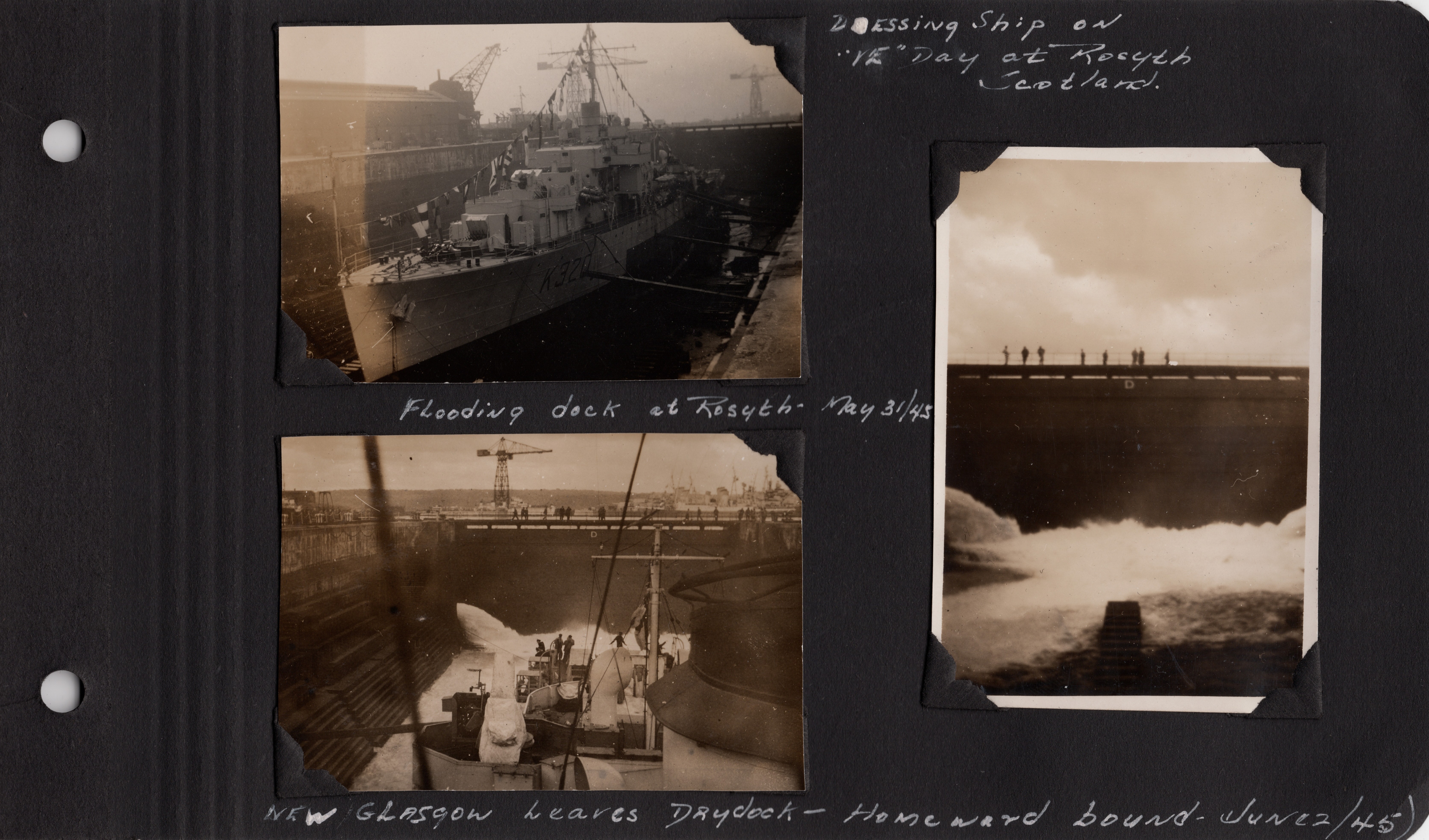 (NFA114) HMCS NEW GLASGOW K320 in drydock at Rosyth, Scotland, dressed for V.E. Day. HMS AMAZON I39 in drydock ahead of her. (NFA115 - NFA116) Drydock at Rosyth flooding as HMCS NEW GLASGOW K320 prepares to undock 02 Jul 1945