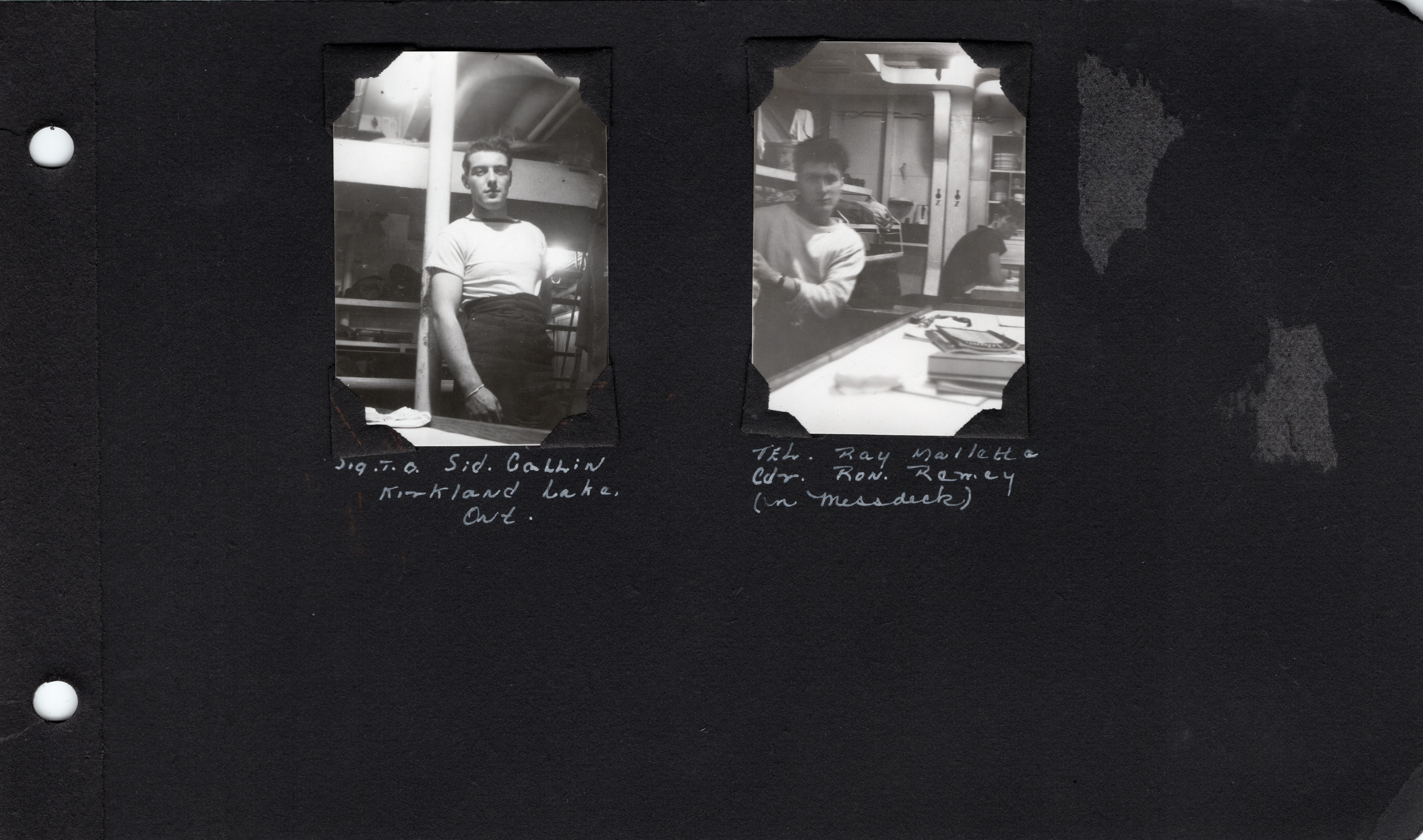 (NFA047) Communicator's mess deck on HMCS NEW GLASGOW K320. Signalman Norman Ayres (left) and Telegraphist John Schenk - undated (NFA048) Coffee time in the Communicator's Mess Deck - Stoker Petty Officer Comber, Stoker Petty Officer MacLardy, Signalman Norman Ayre, Telegraphist Norman Craig, Telegraphist John Schenk - undated (NFA049) Signalman Sid Callin of Kirkland Lake, Ontario in the Communicator's Mess Deck on HMCS NEW GLASGOW K320 - undated (NFA050) Telegraphist Ray Mallett and Coder Ron Remey in the Communicator's Mess Deck on HMCS NEW GLASGOW K320 - undated (NFA051) Signalman Norman Ayre and shipmates ashore in an unknown location - undated