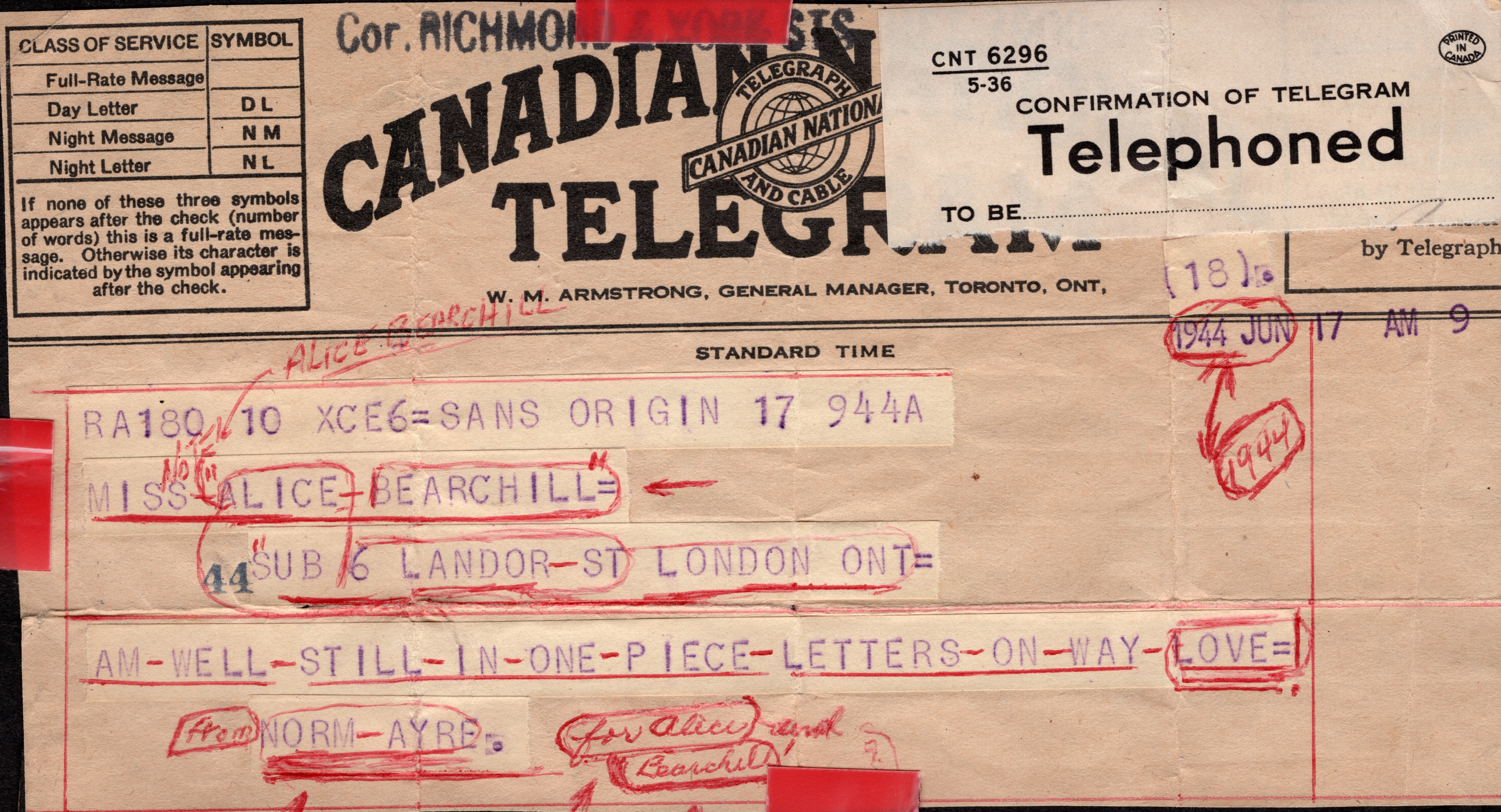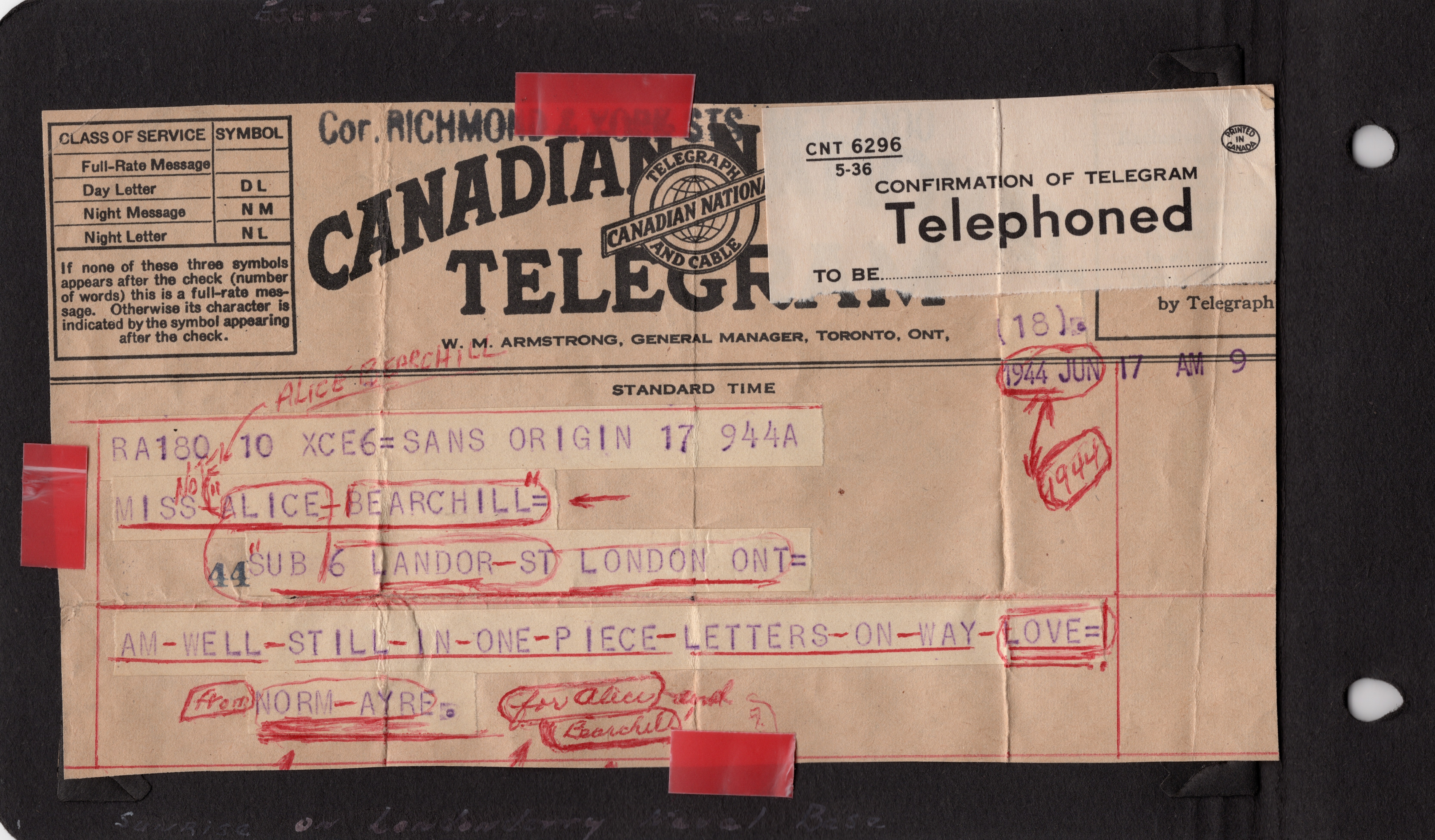 (NFA001) Sigalman Norman Ayre - 1944 Photo taken Belfast, Northern Ireland (NFA002 - NFA003) Signalman Norman Ayre on leave - undated (NFA004) Telegram to Alice Bearchill - 17 Jun 1944