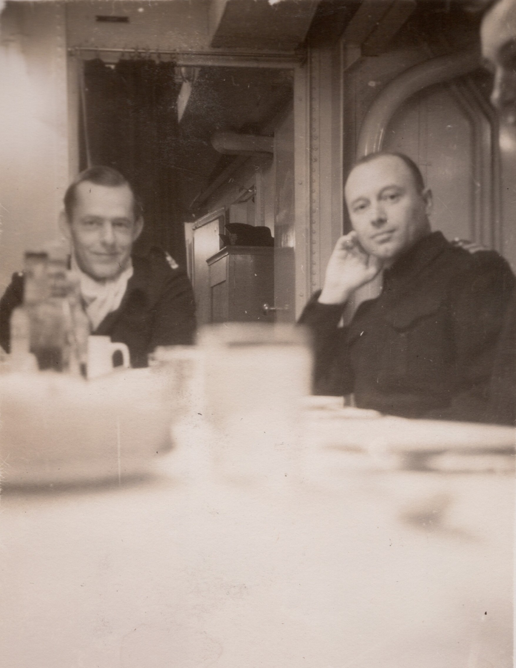 (NFA103) Part of Communications mess, HMCS NEW GLASGOW K320. Taken X-mas day 1944 in the Bristol Channel off Lundy Island // Back row: Signalman Norman Ayre; Coder Ross McLeod; Signalman Harvey Hamilton; Telegraphist Ray Malliette; Signalman Sid Collin // Front row: Telegraphist M. Howe; T. Valiant; Telegraphist (H/F D/F Operator) Ken Graydon; Signalman Reg Woods; Leading Coder Stan Thompson; Telegraphist Norman Craig // Back of photo (NFA104) Party of Communications mess, HMCS NEW GLASGOW K320. taken X-mas day 1944 in the Bristol Channel off Lundy Island (NFA105) HMS RAMILLIES, Portsmouth, England - Feb 1945 (NFA106) Sig Norman Ayres on HMCS NEW GLASGOW K320. The ship is at anchor off Larne, Northern Ireland during "WUPS" (Work Ups) - Feb 1945 (NFA107) Telegraphist Mprris Howe (left) and Signalman Norman Ayre on HMCS NEW GLASGOW K320 at sea - Feb 1945