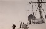 (NFA019) Telegraphist John Schenk coming over the side of "X" gun deck on HMCS NEW GLASGOW K320 - May 1944 (NFA020) Able Seaman Ferris, Submarine Detector Lovering and Submarine Detector Lamore in a Carley float on HMCS NEW GLASGOW K320 at Halifax - May 1944 (NFA021) HMCS GIFFARD K402 on convoy duty - May 1944 // Webmaster's note: The only convoy GIFFARD escorted in May 1944 was HX.291, New York City to Liverpool, England. The NEW GLASGOW was also an escort for this convoy.