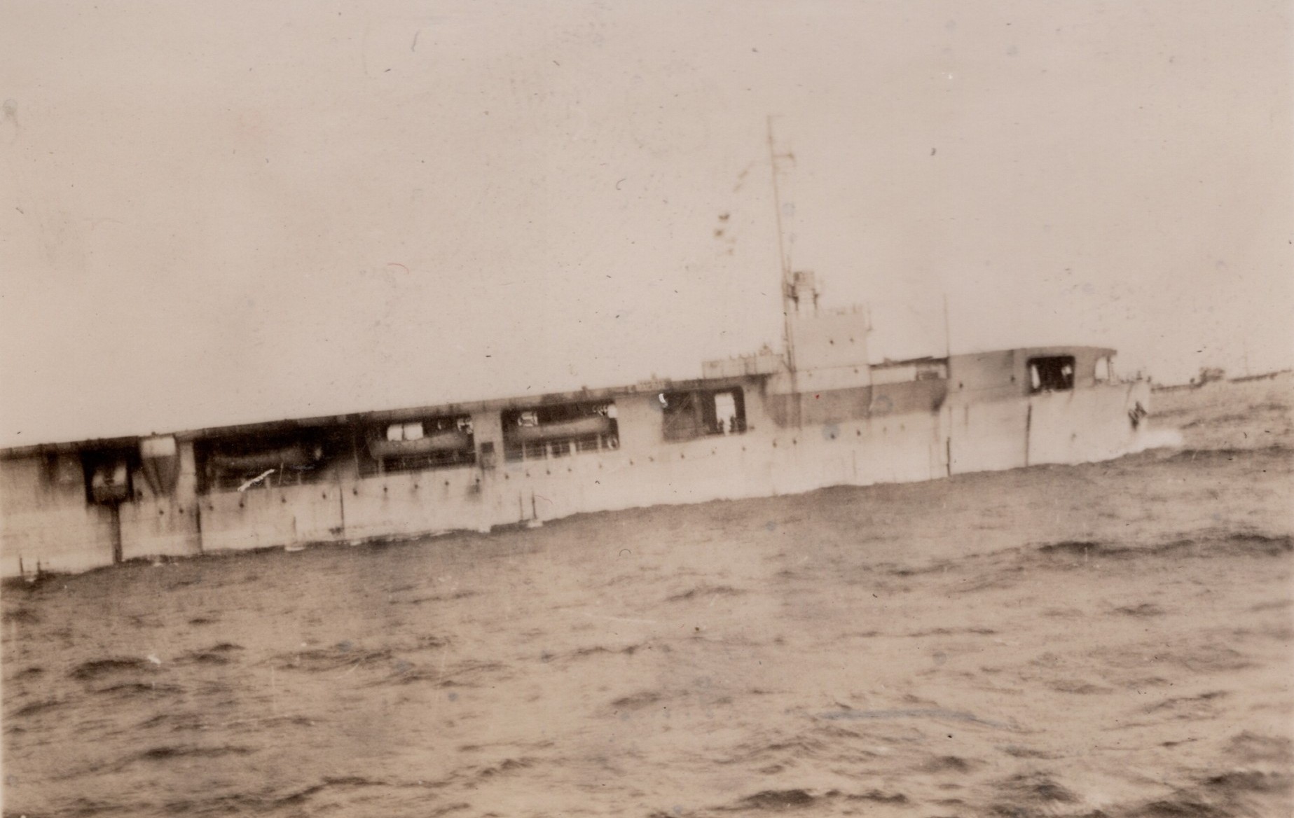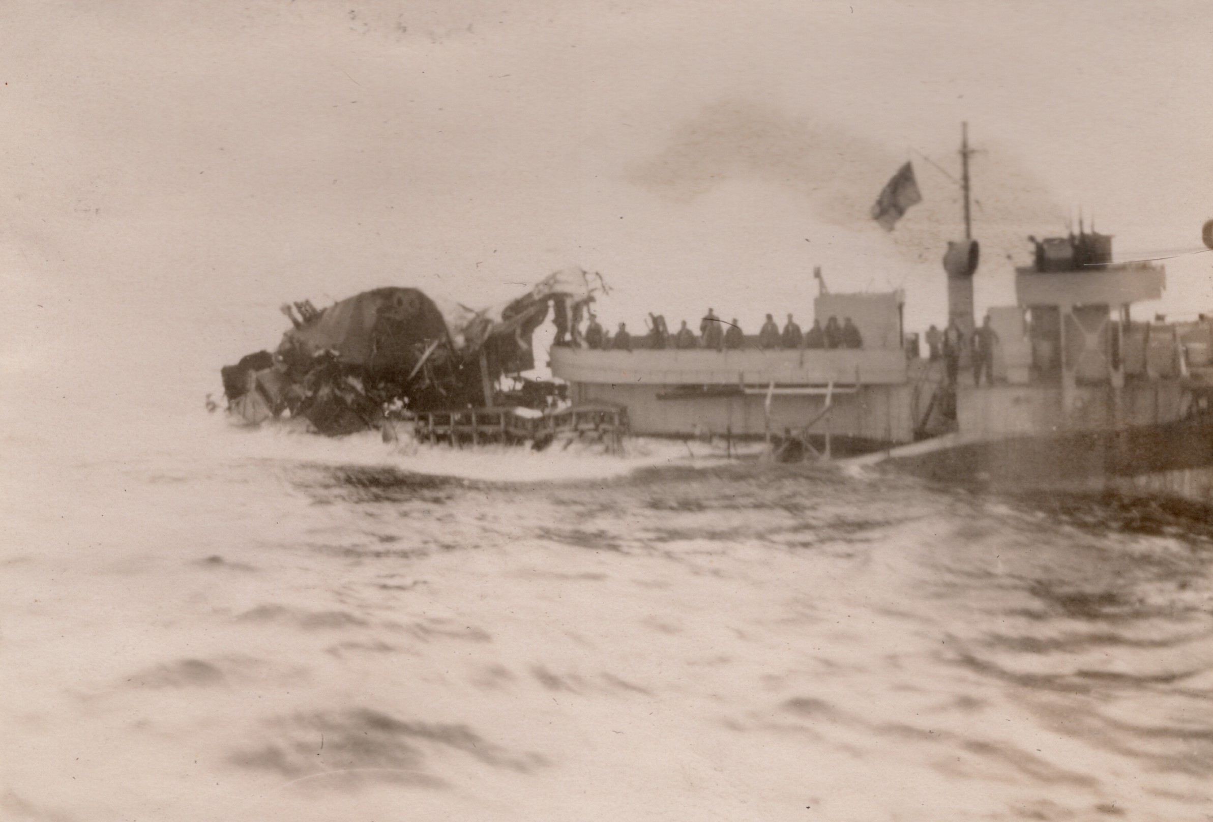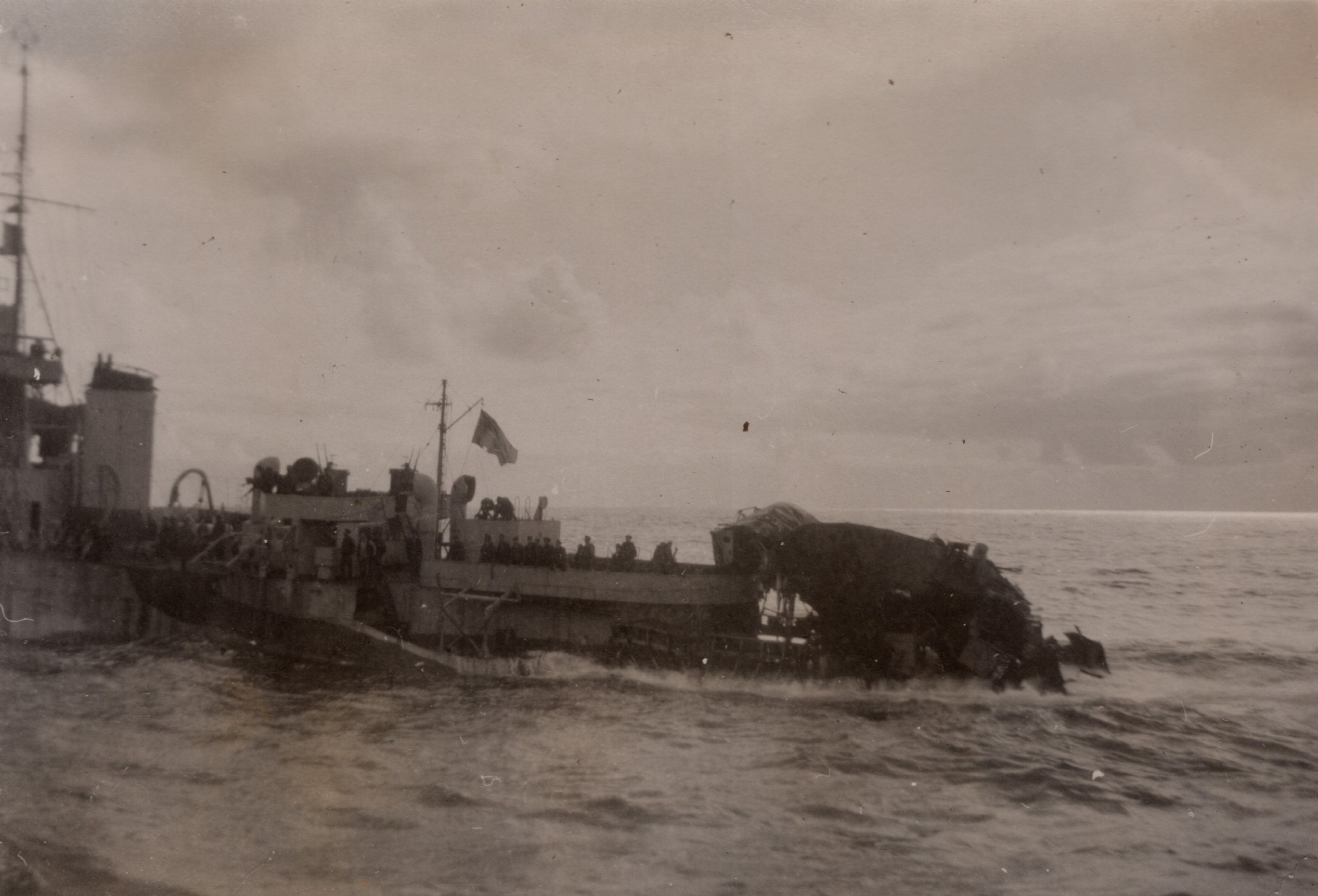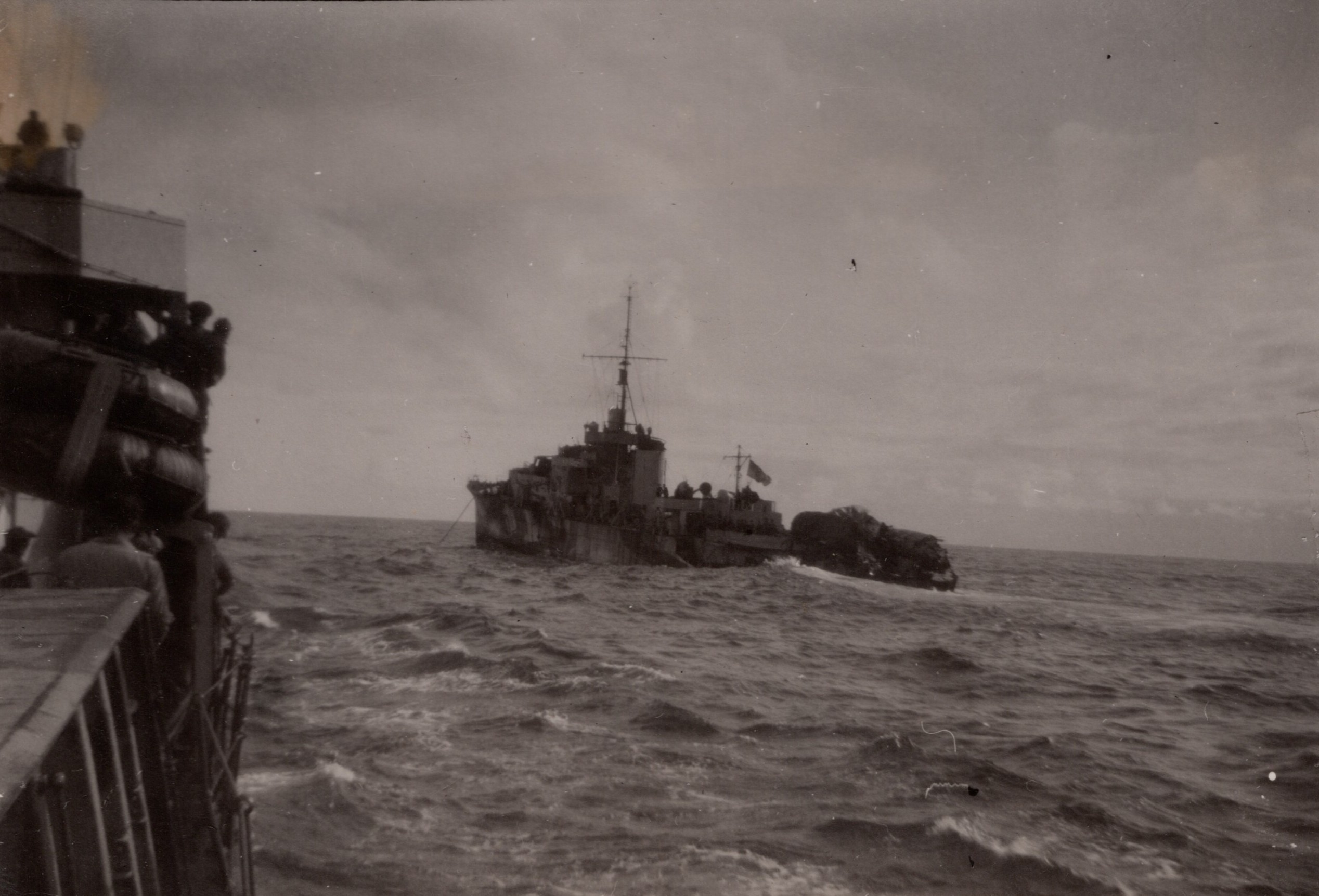 (NFA100 - NFA102) HMCS CHEBOGUE K317 torpedoed in her stern on 08 Oct 1944 at 8:00 p.m. while on mid-ocean escort duty approx 600 miles off S.W. coast of Ireland. Photos taken from HMCS NEW GLASGOW K320