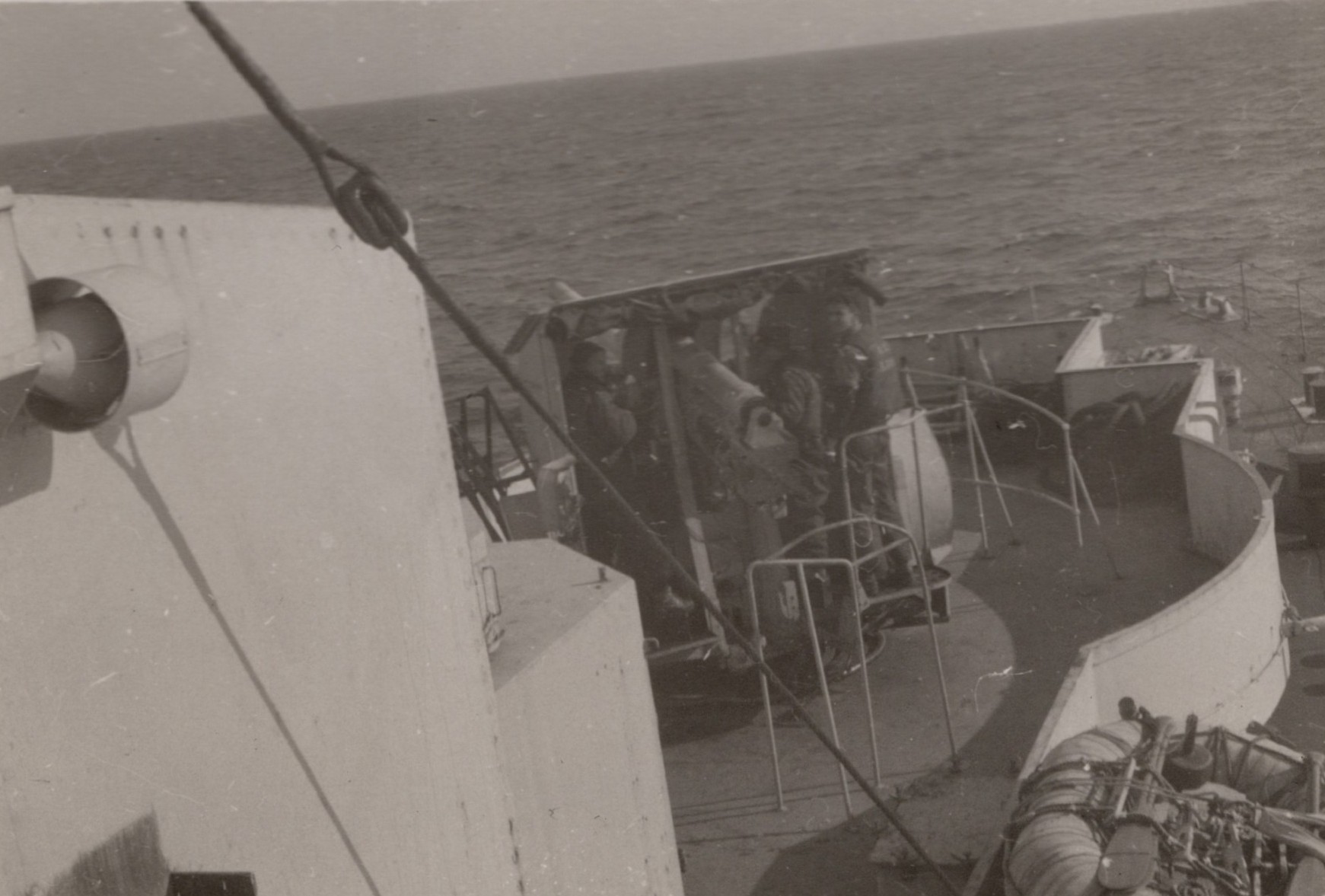 (NFA072) Unknown corvette approaching HMCS NEW GLASGOW K320 - undated (NFA073) Motor workboat from unknown ship passing HMCS NEW GLASGOW K320 while in convoy - undated (NFA074) Gunnery drills "X" gun on HMCS NEW GLASGOW K320 - undated (NFA075) Sailors on "X" gun platform of HMCS NEW GLASGOW K320 watching something happing on the port side of the ship - undated (NFA076) Paddlewheel steam tug secured alongside HMCS NEW GLASGOW K320 - undated