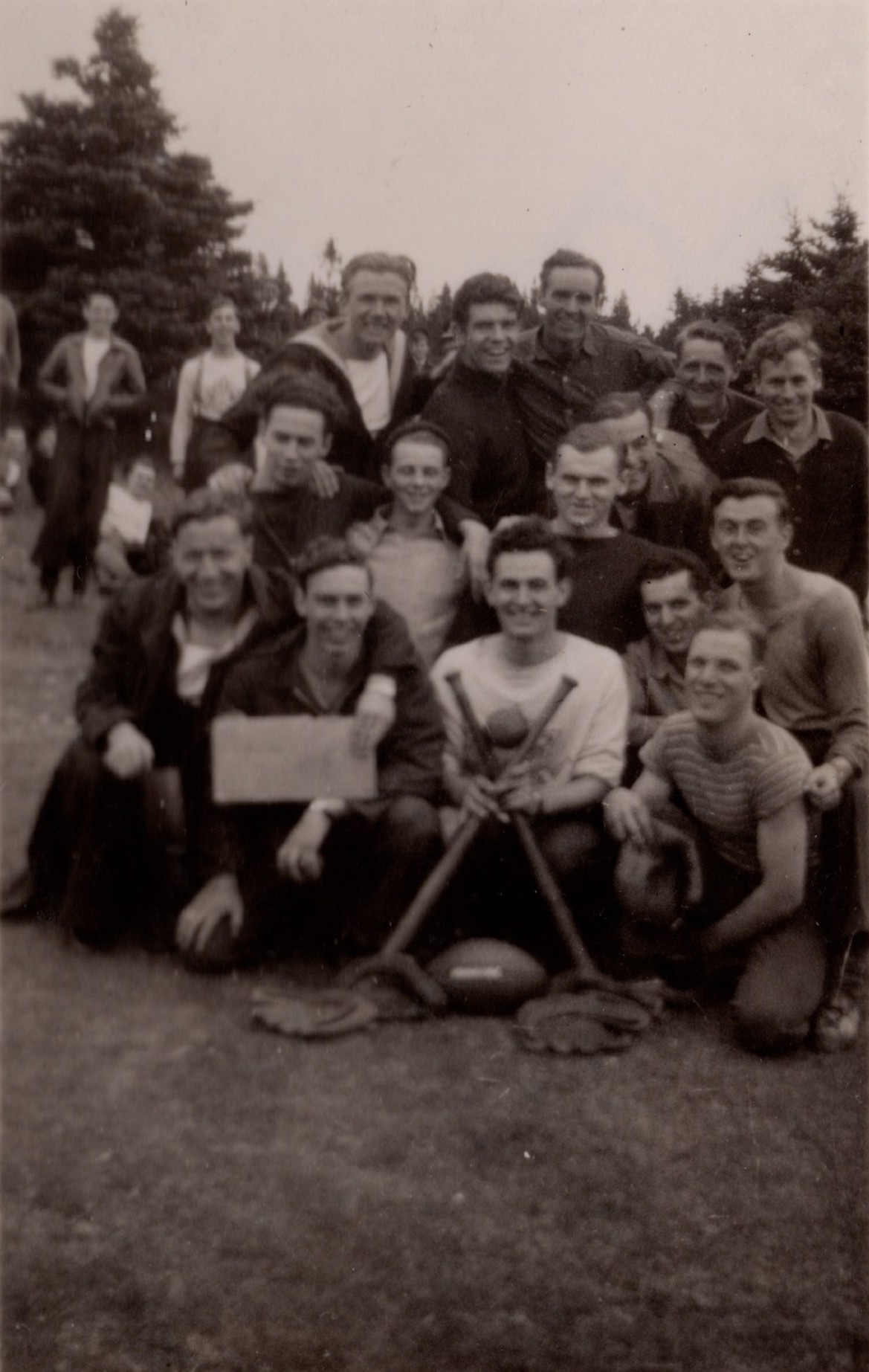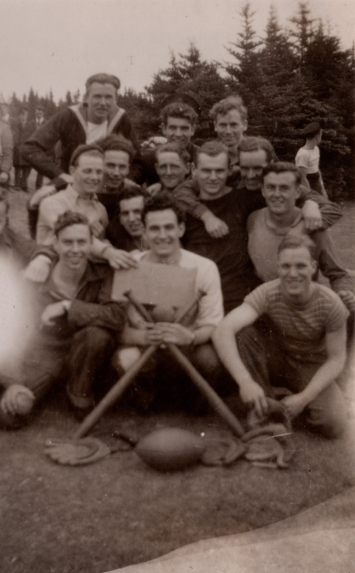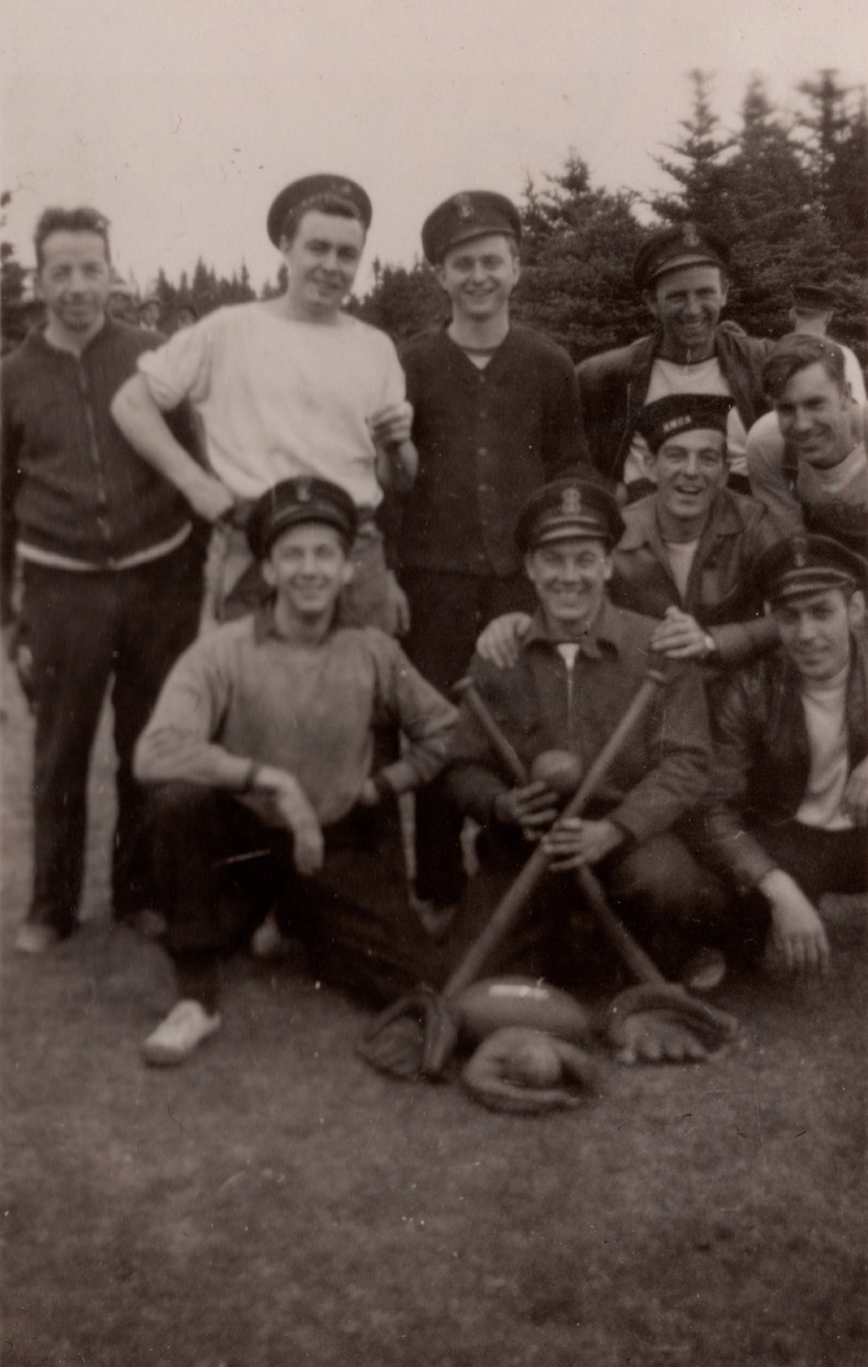 HMCS NEW GLASGOW K320 Sports Day at St. John's, Nfld - Jun 1944 (NFA034) Telegraphist Morris Howe, Signalman Norman Ayre, Signalman Reg Woods, Telegraphist Tony Theoret, Petty Officer Telegraphist (PO TEL) O. Robert (Cap) (NFA035) Pyramid ..... (NFA-36) Result - Bottom Row L-R: Telegraphist Tony Theoret, Signalman Norman Ayre, Telegraphist John Schenk, Coder, Ron Reméy; Centre L-R: Telegraphist Morris Howe, Coder Sam Shaw; Top: Telegraphist Doug Reed (NFA037) Telegraphist John Schenk, Telegraphist Tony Theoret, Signalman Norman Ayres, Telegraphist Ken Graydon. (NFA038) Telegraphist Ken Greydon, H/F D/F at ballgame. St. John's, Nfld - Jun 1944