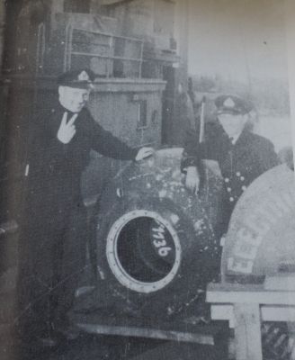 (left) Article on Skipper Lieutenant Louis Cormier being awarded "Member - Order of the British Empire (MBE)" (right) Skipper Lieutenant Louis Cormier by the German mine his ship recovered and brought ashore - for which he was awarded the MBE.