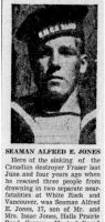 Ordinary Seaman Alfred Ernest Jones was a hero when the Canadian destroyer HMCS Fraser was sunk last June and four years ago when he rescued three people from drowning in two separate near fatalities at White Rock and Vancouver. Ordinary Seaman Jones, age 17, was the son of Mr. and Mrs. Isaac and Lily Jones, of New Westminster, British Columbia. He is believed to have died in the sinking of HMCS Margaree. Young Jones saved hundreds of lives when he defused depth charges on HMCS Fraser that would have exploded had they hit the water. Four years ago he rescued Arthur Oxenham and Lisa Scott from drowning at White Rock and Jean Oxenham from a similar fate at Second Beach.