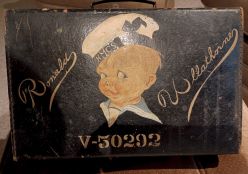 (RRU001) Gunshield art painted by Ronald Ullathorne on the gun shield of the pom-pom in the after gun tub on HMCS SUMMERSIDE K141 (RRU002) Ron's service attaché case. This was used when sailors went on leave to carry the necessities - socks, underwater, shaving kit, letter writing kit, etc. Sailors travelled light on leave as they had to wear their uniforms. It was not uncommon for sailors to personalize they attaché case. Courtesy of Dianne Jones