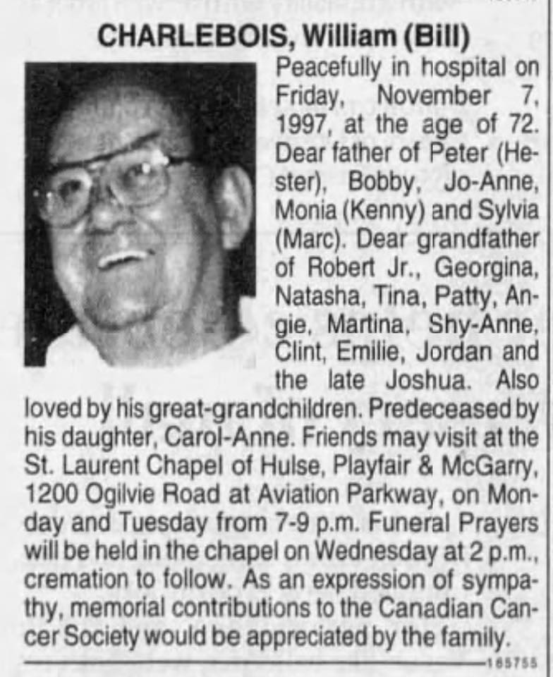 CHARLEBOIS, William (Bill) - Peacefully in hospital on Friday, November 7, 1997, at the age of 72. Dear father of Peter (Hester), Bobby, Jo-Anne, Monia (Kenny) and Sylvia (Marc). Dear grandfather of Robert Jr., Georgina, Natasha, Tina, Patty, Angie, Martina, Shy-Anne, Clint, Emilie, Jordan and the late Joshua. Also loved by his great-grandchildren. Predeceased by his daughter, Carol-Anne. Friends may visit at the St. Laurent Chapel of Hulse, Playfair & McGarry, 1200 Ogilvie Road at Aviation Parkway, on Monday and Tuesday from 7-9 p.m. Funeral Prayers will be held in the chapel on Wednesday at 2 p.m., cremation to follow. As an expression of sympathy, memorial contributions to the Canadian Cancer Society would be appreciated by the family. (click here to view the obituary as published)