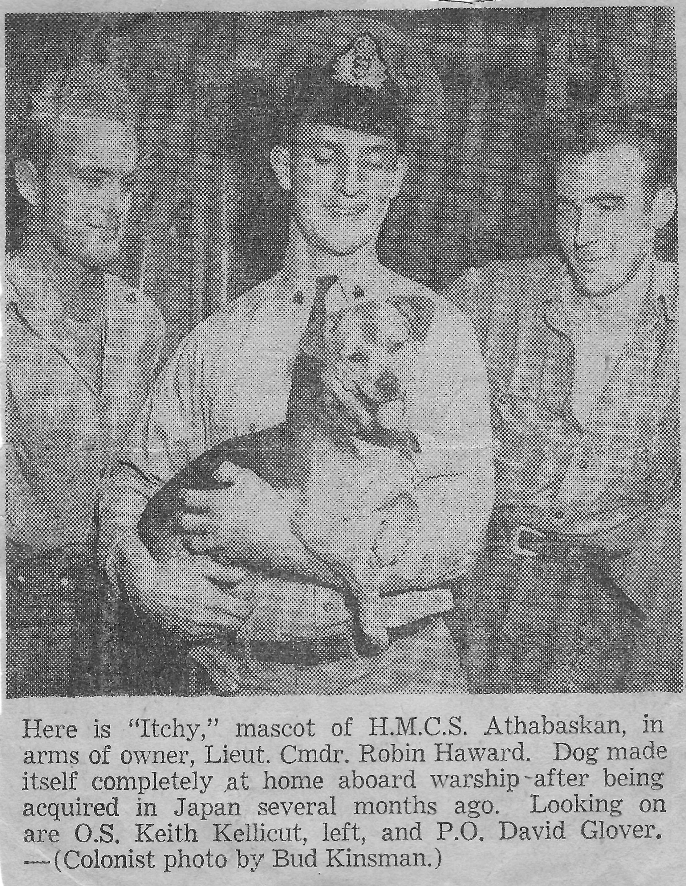 (DEG001) OS David Glover at HMCS CORNWALLIS (DEG002) Pay parade of HMCS ATHABASKAN during her second Korean War Tour. PO David Glover, seated beside the officer (DEG003) "Itchy" - Mascot of HMCS ATHABASKAN. Owner, LCdr Robing Haward, Os Keith Kellicut (left) and PO David Glover (right) // Article from The Daily Colonist, Victoria, BC 10 Jul 1952 Courtesy of Steven Glover