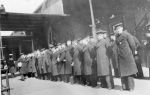 (RSR065) Group of sailors formed up waiting to board a train or just came off a train and waiting for transportation elsewhere - location unknown