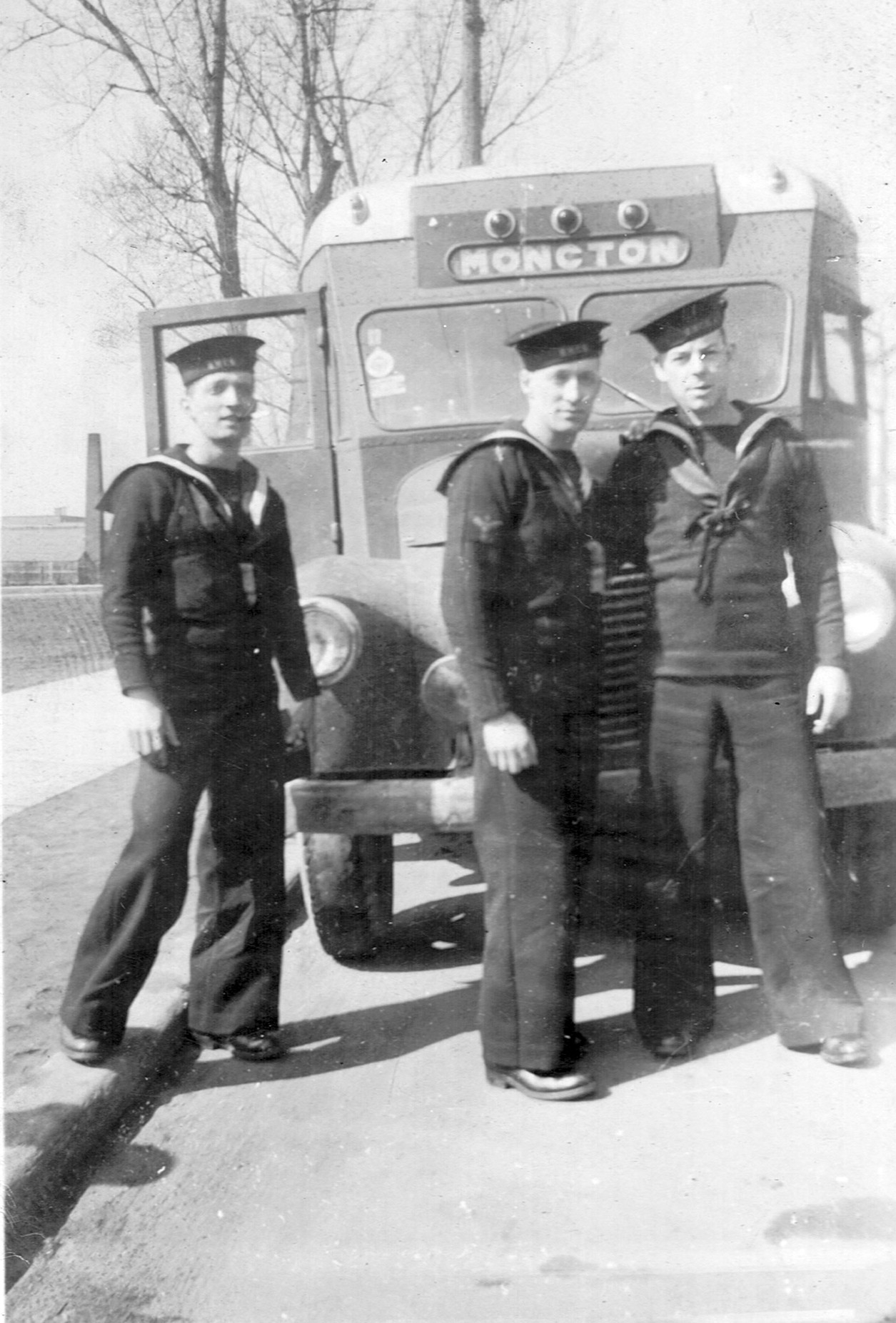 (RSR066 - RSR067) Unidentified sailors in front of a bus in Moncton, NB (RSR068 - RSR070) Unidentified sailors posing for photos from the train car windows - location unknown - though likely the train station at Moncton, NB