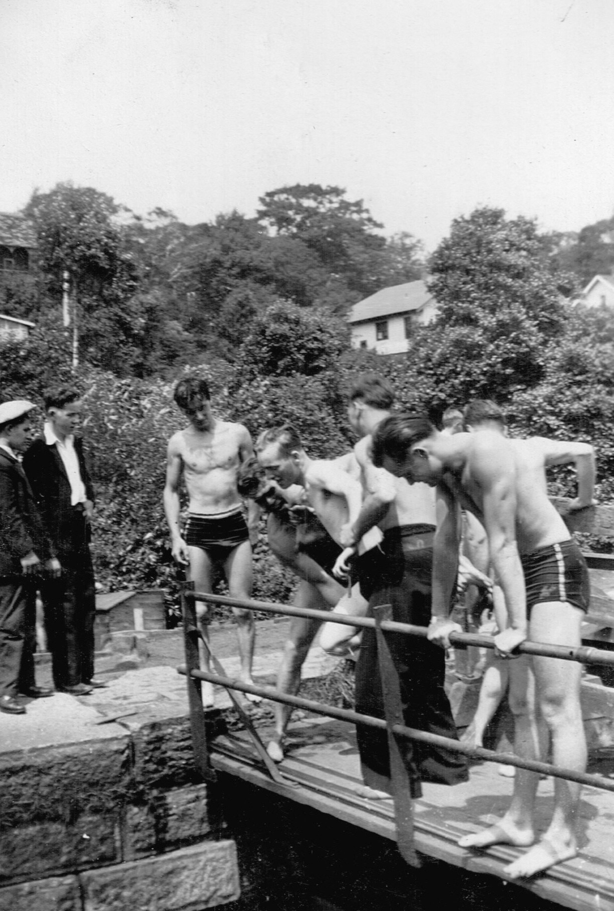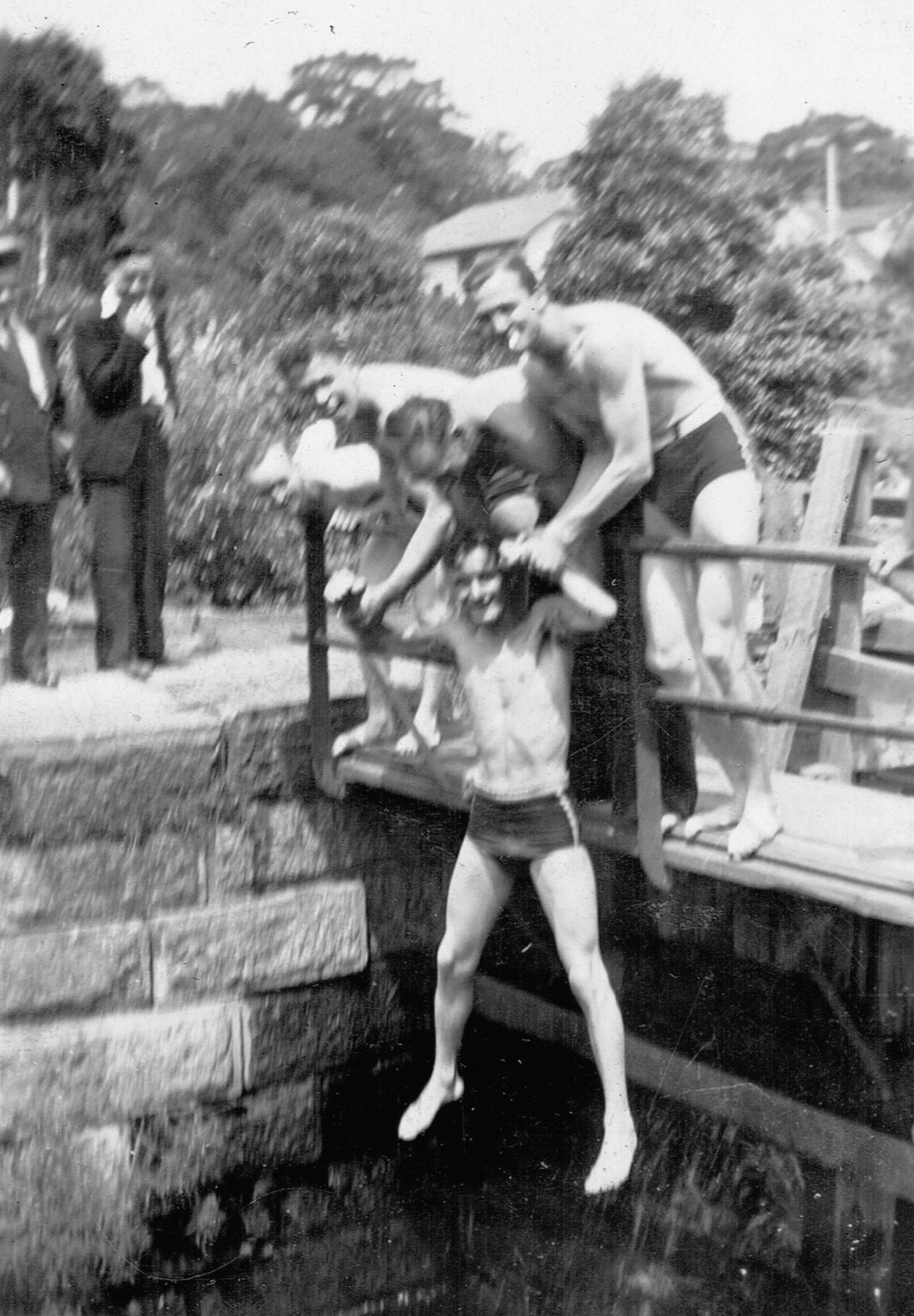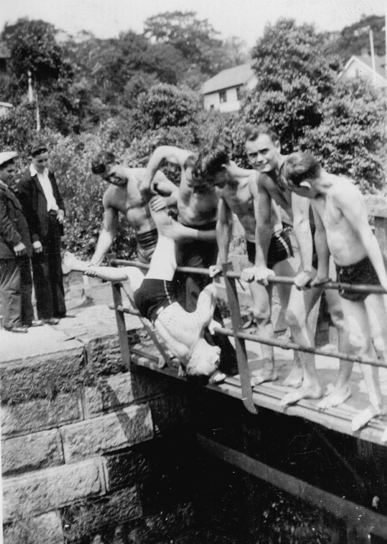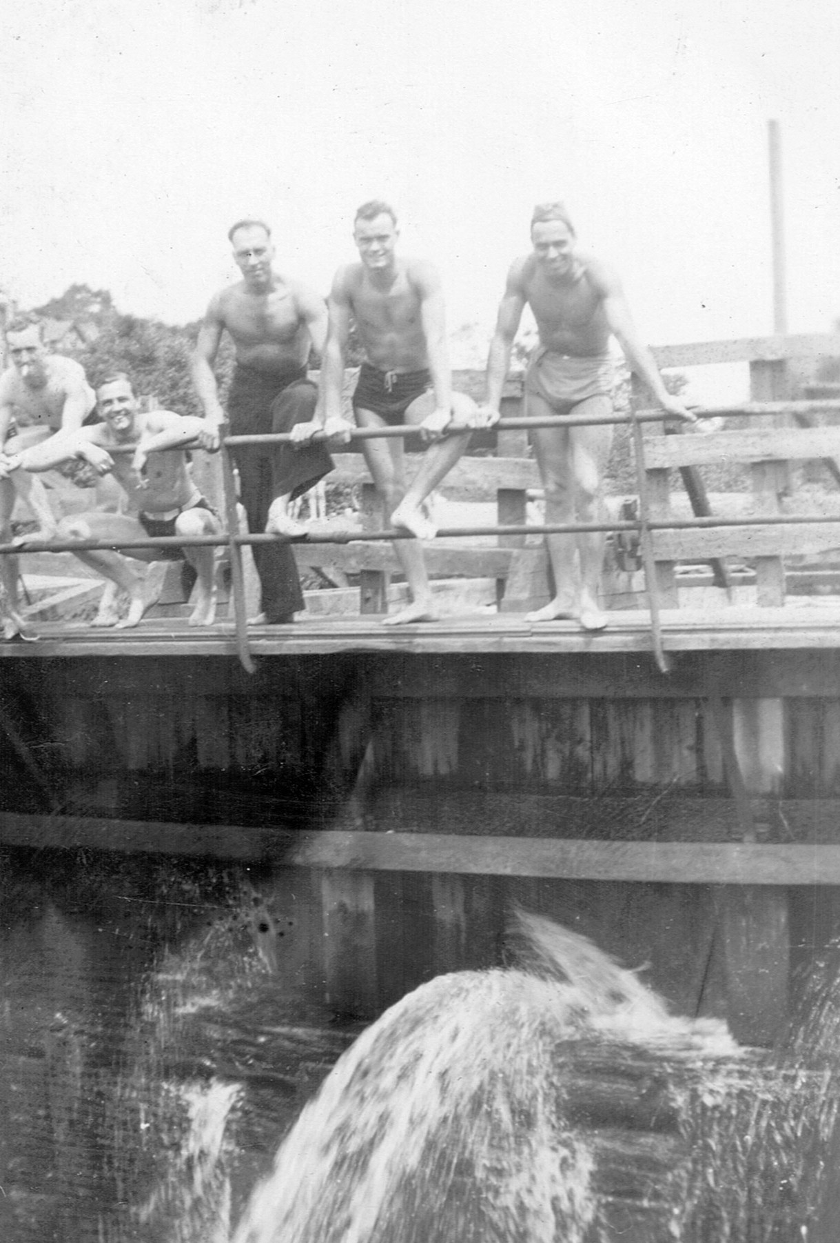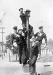 (RSR056 - RSR060) Unidentified sailors taking part in antics on the lock at the entrance to the Shubenacadie Canal on Lake Banook