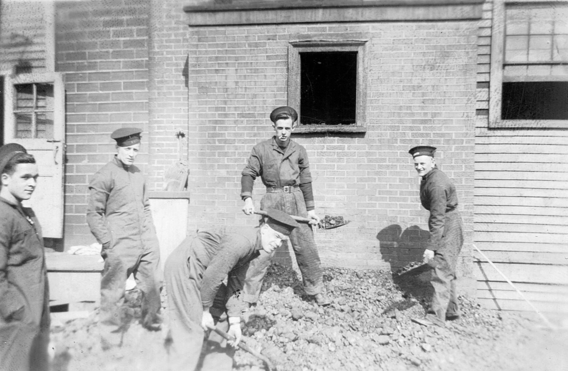 (RSR013) Unidentified sailor with ships nested in the background. HMCS BATTLEFORD K165 alongside the jetty; HMCS DUNDAS K229 centre; outboard ship unknown. Possibly HMC Dockyard Halifax (RSR014 - RSR015) Unidentified sailors doing what appears to be shoveling coal in the window of the building behind them. It is believed the photo is taken at HMCS STADACONA or one of surrounding units such as HMCS PEREGRINE or in HMC Dockyard.