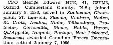 Ships served in: * Enlisted 08 Jan 1936 HMCS IROQUOIS - Served in IROQUOIS as a C2EM3 during her 3rd Korean War Tour