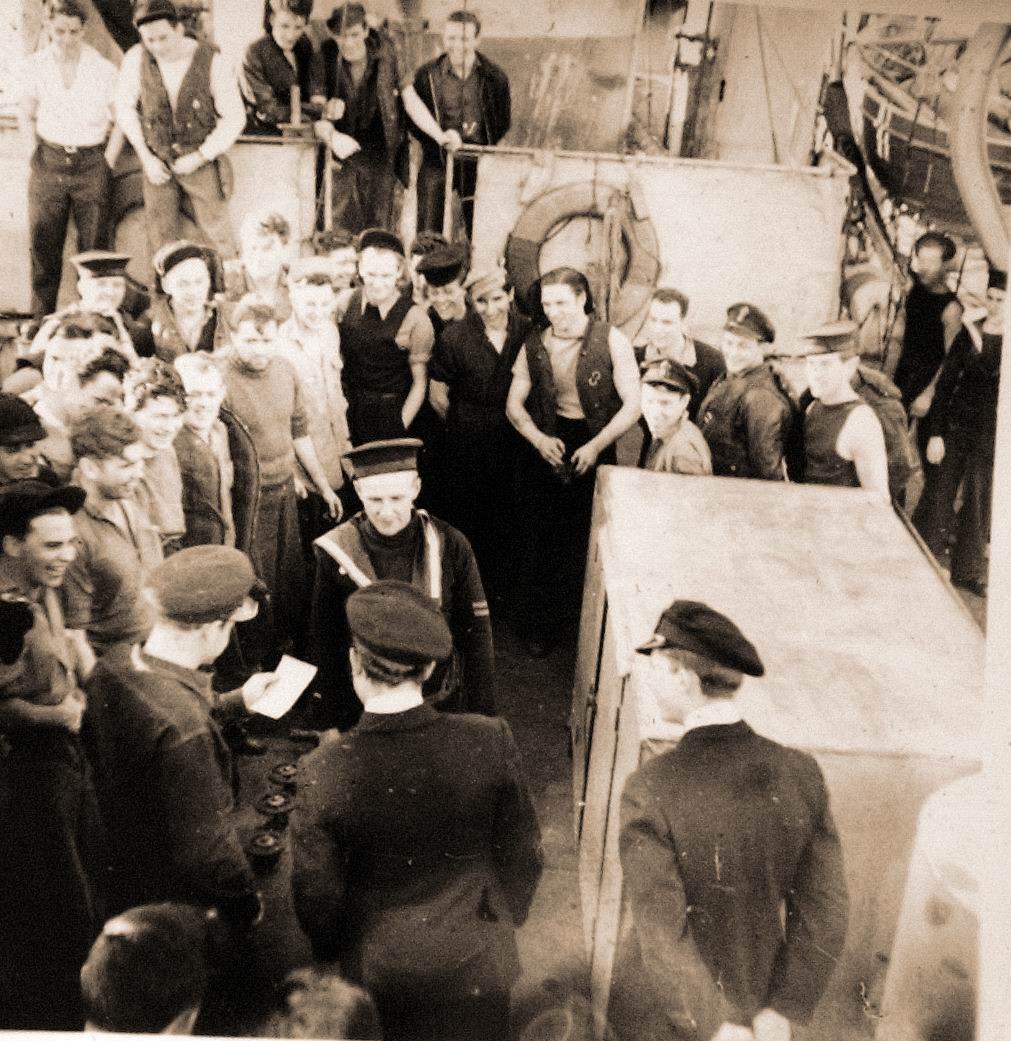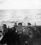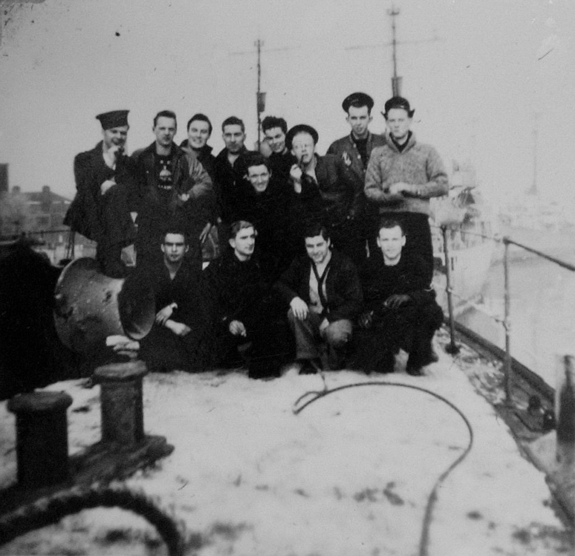 (CJR010-CJR012) Shipmates of Clarence Reid on the fo'c's'le of HMCS CHAMBLY K116 (CJR013-CRJ014) Shipmates on the fo'c's'le of HMCS CHAMBLY - Clarence Reid standing 3rd from right holding a pipe