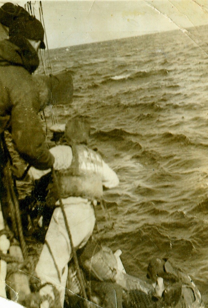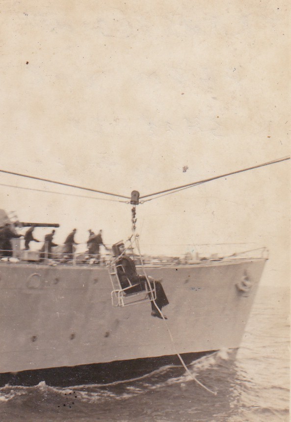 HMCS ATHABASKAN rescues downed American pilot off Korea - who apparently was worth his weight in ice cream (NBB005) US aircraft marks position of down's pilot for HMCS ATHABASKAN'S whaler (NBB006) US pilot being brought aboard HMCS ATHABASKAN (NBB007 - NBB008) American pilot being jack-stayed back to his carrier