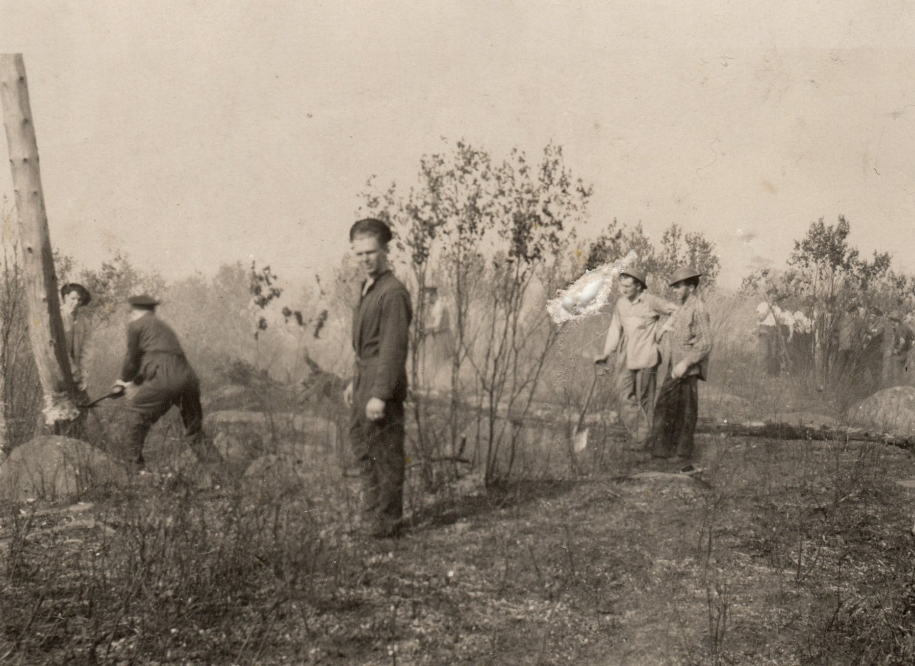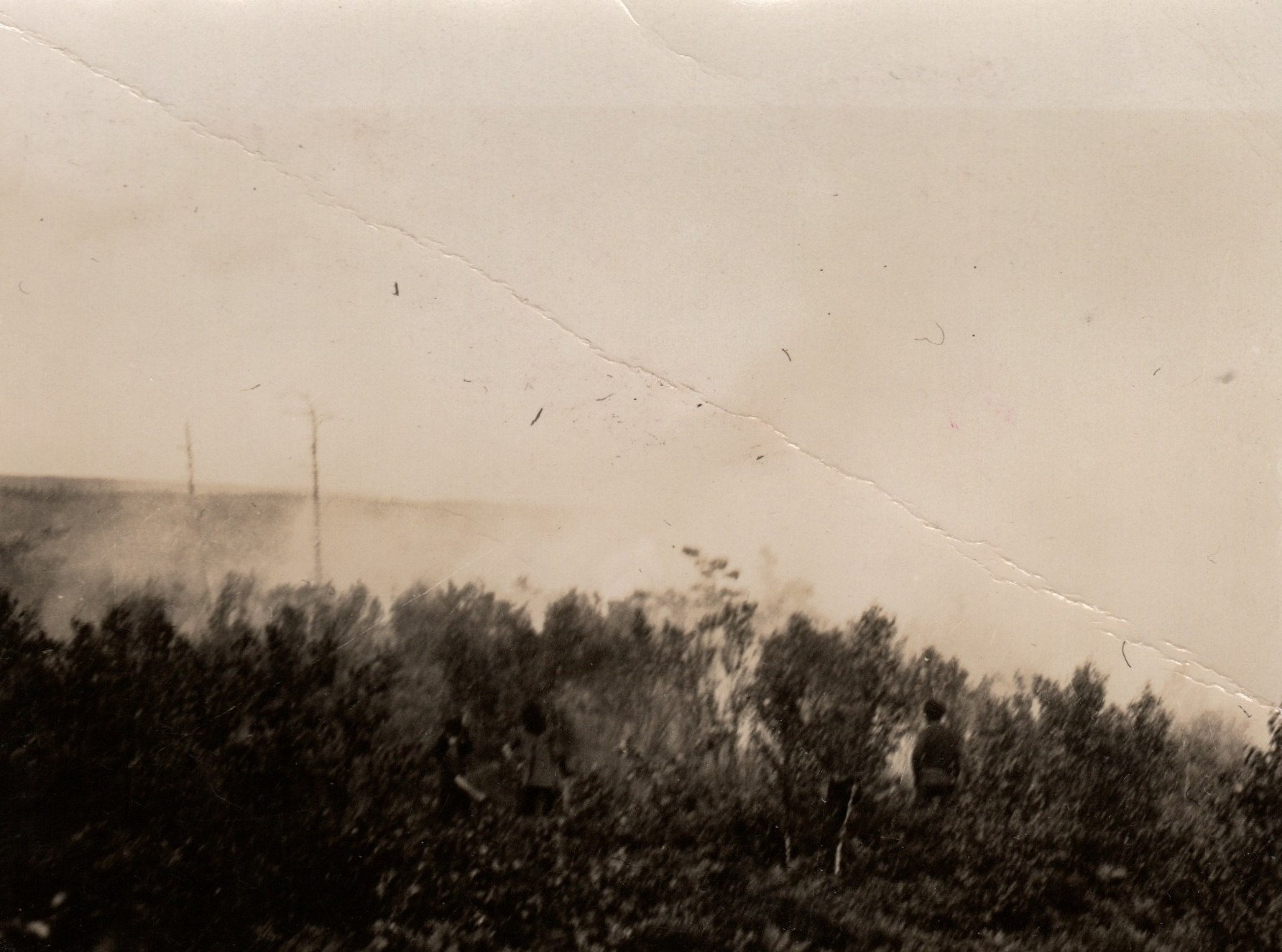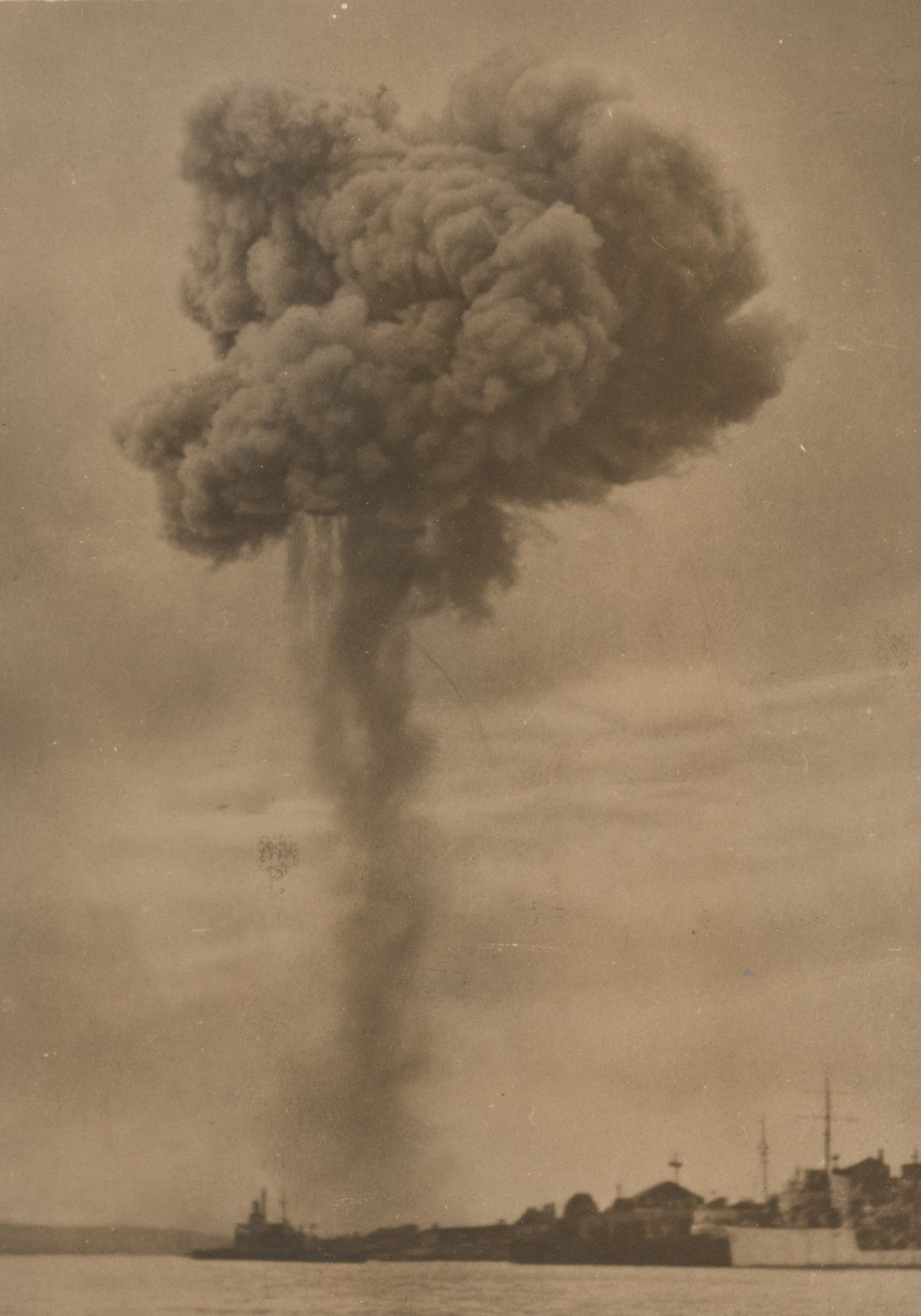 (...) Mushroom cloud from an explosion at the Bedford Magazine 18 Jul 1945 (...-...) Sailors fighting brush fires around the area of the Bedford Magazine (...) Projectile on the road a half mile away from the Bedford Magazine