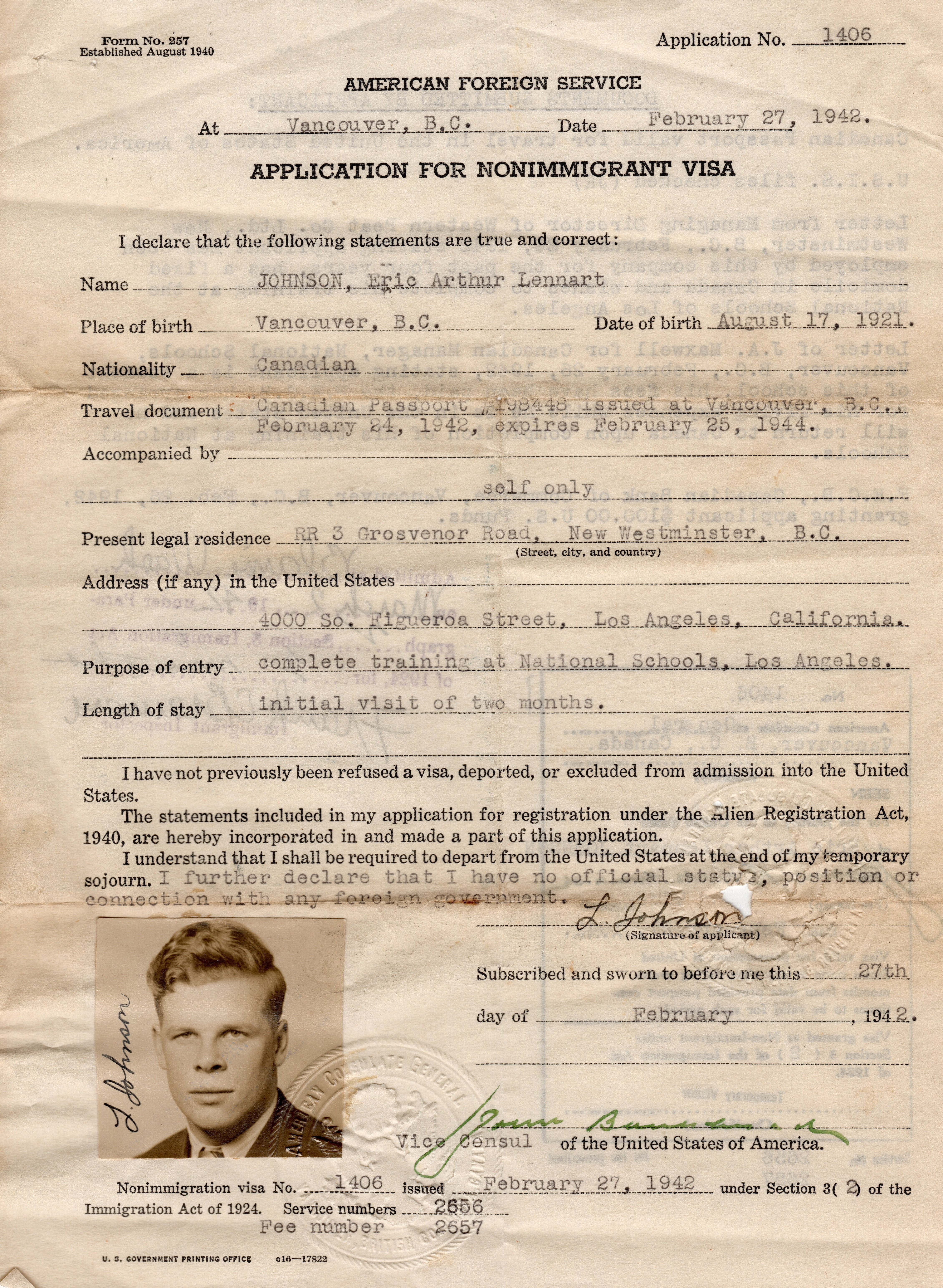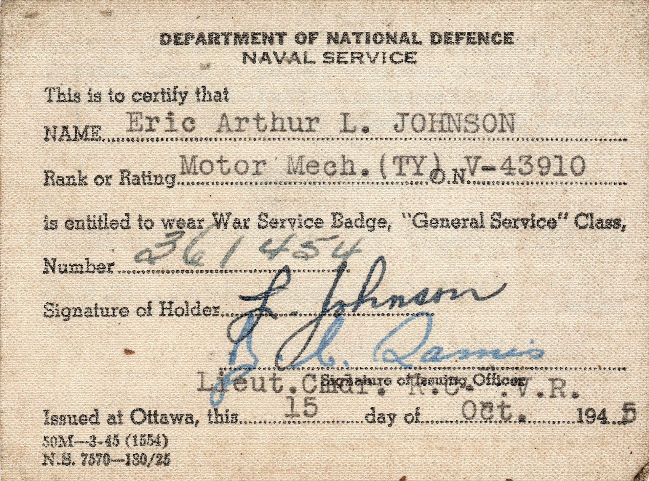 (EALJ001) Petty Officer Motor Mechanic Len Johnson (EALJ002) Len's application for a non-immigrant visa - 27 Feb 1942 (EALJ003) HMCS SANS PEUR 1994 Reunion newsletter (EALJ004) HMCS SANS PEUR jacket patch (EALJ005) Authorization to wear War Service Badge