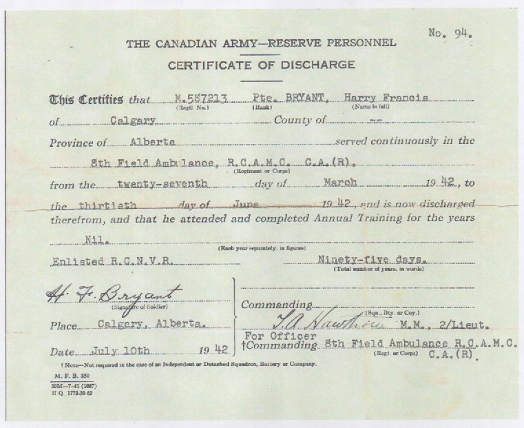 Harry Bryant enlisted in the Canadian Army at the age of 17 with the 8th Field Ambulance on 27 Mar 1942. He took his discharged 30 Jun 1942 to join the RCNVR.