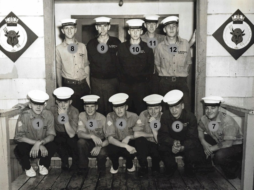 Assiniboine I Division Apr - Sep 1957 Click on the above photo to view the image without numbers (1) Donald (2) Gillard (3) Beaulieu (4) Curtis (5) Unknown (6) Gresdal (7) Corder (8) Parent (9) Coughlin, Dave (10) Foyne (11) Clark (12) Dnistransky From the collection of Dave Coughlin, CPO1, RCN / C.A.F. (Navy) Courtesy of Dave Coughlin