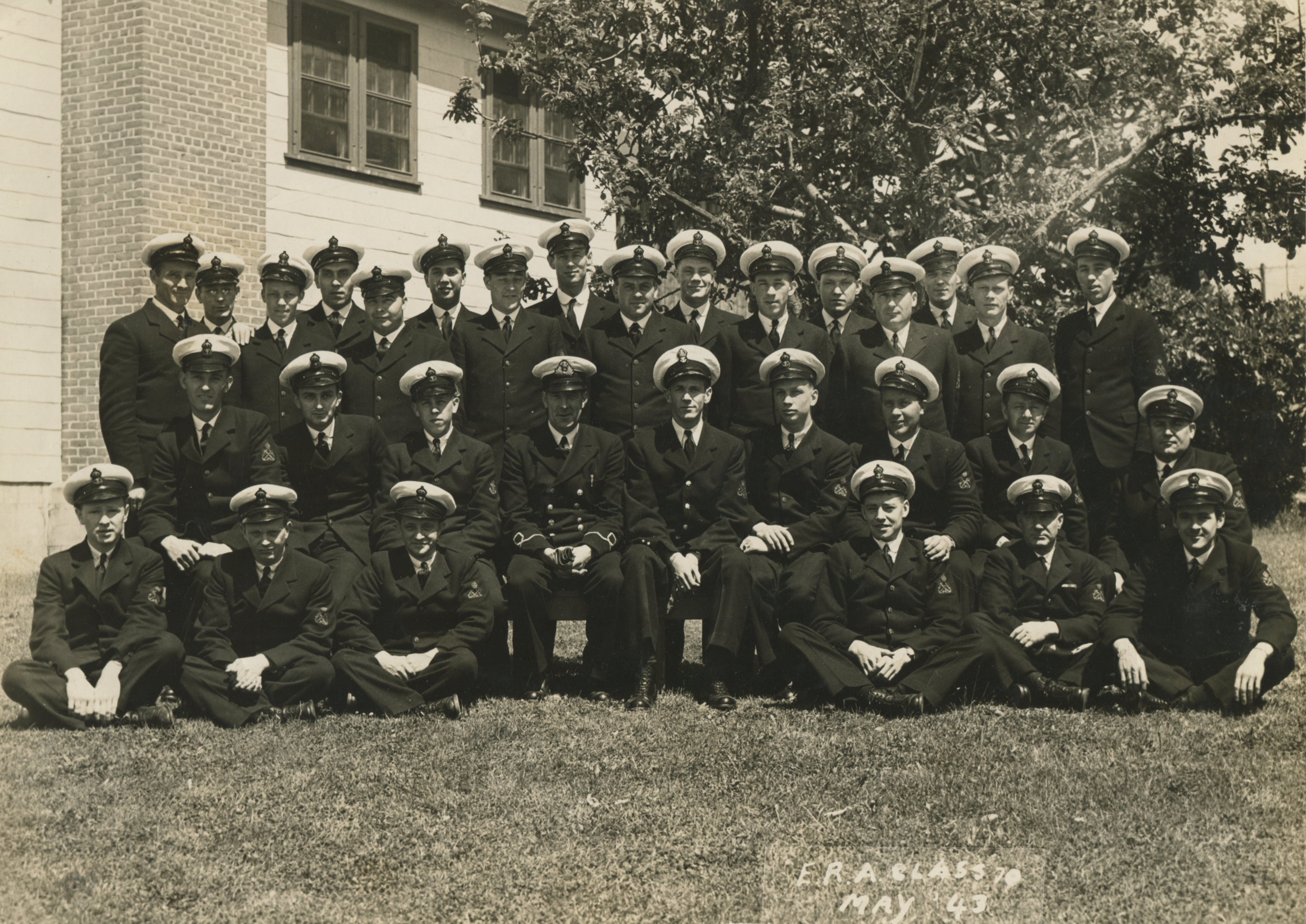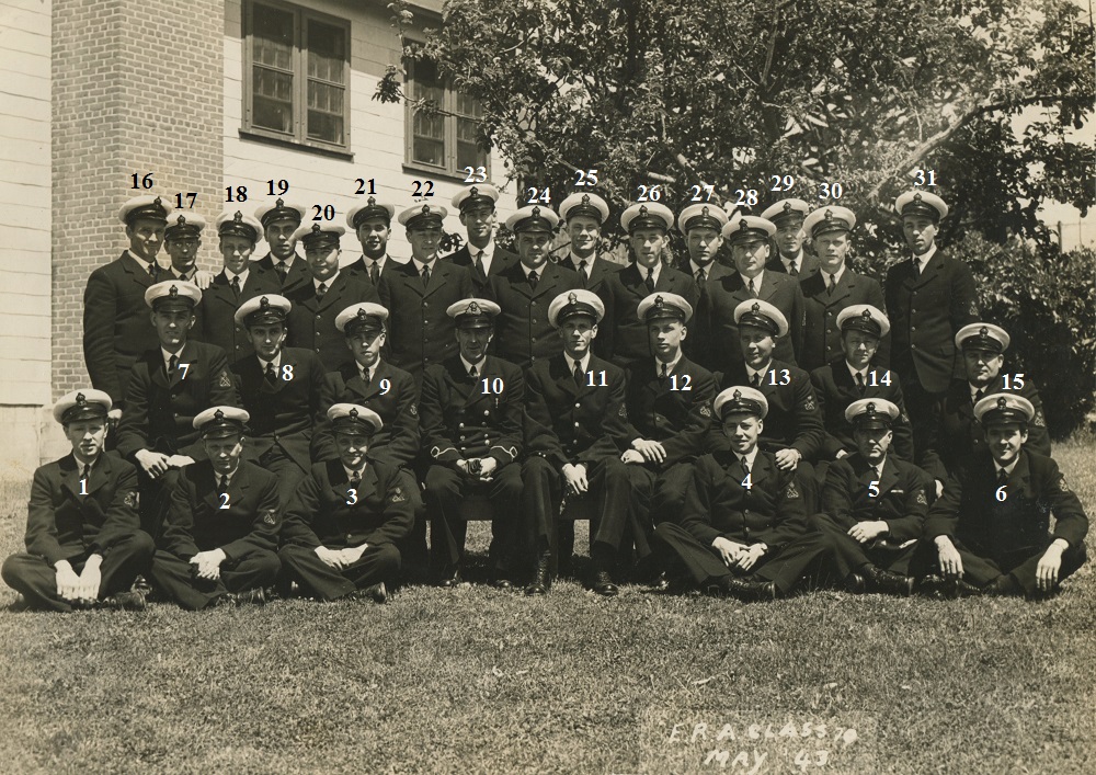 Engine Room Artificers, E.R.A. Class 70, May 1943 Click on the above photo to view a larger image (1) Gawbie, James H (2) Parkinson, Jim (3) Hurrington, Frank (4) Plain, Hilton (5) Lamont, Donald (6) Pedduck, Laurie (7) Blair, Ernest (8) Collins, Larry (9) Hirtanen, Bill (10) Elliott, Bill, WO (11) Durrell, Allan (12) Dawson, Kenneth N. (13) Wilson, Allan W. (14) Fleming, M. (15) Robinson, Lloyd (16) Murchison, John W. (17) Mcauley, Edwin (18) McClennan, Bob (19) Zimmerman, Fred (20) Burteh, Malvin (21) Kelly, Harold (22) Boyd, Russell (23) Alcock, Tom (24) Gilchrist, Harry (25) Dunn, Don (26) Smith, George (27) Jamieson, Frank (28) Palmer, Victor (29) Kay, John B. (30) de Pencier, H.T. (31) Boeckner, Nelson Click here to see the names written on the back of the photo From the collection of Kenneth Dawson Courtesy of Randy Dawson