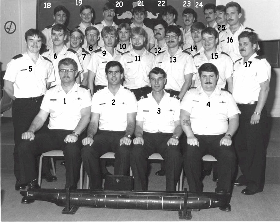 (1) Downie, R., PO1 (Instructor) (2) Shergold, Lt (3) Bowden, Lt (4) Presley, W., PO1 (Instructor) (5) Keough, OS (6) MacDonald, D., LS (7) Livingstone, OS (8) Borwn, LS (9) Mishak, OS (10) Wroclawski, OS (11) Wallace, LS (12) Jones, AB (13) Bojin, OS (14) MacGregor, AB (15) MacDonald, OS (16) Barber, LS (17) Bandura, MS (18) Monsigneur, OS (19) Douglas, OS (20) Fraser, LS (21) MacDonald, OS (22) Dugay, OS (23) Sears, OS (24) Lloyd, OS (25) Merineau, Cpl