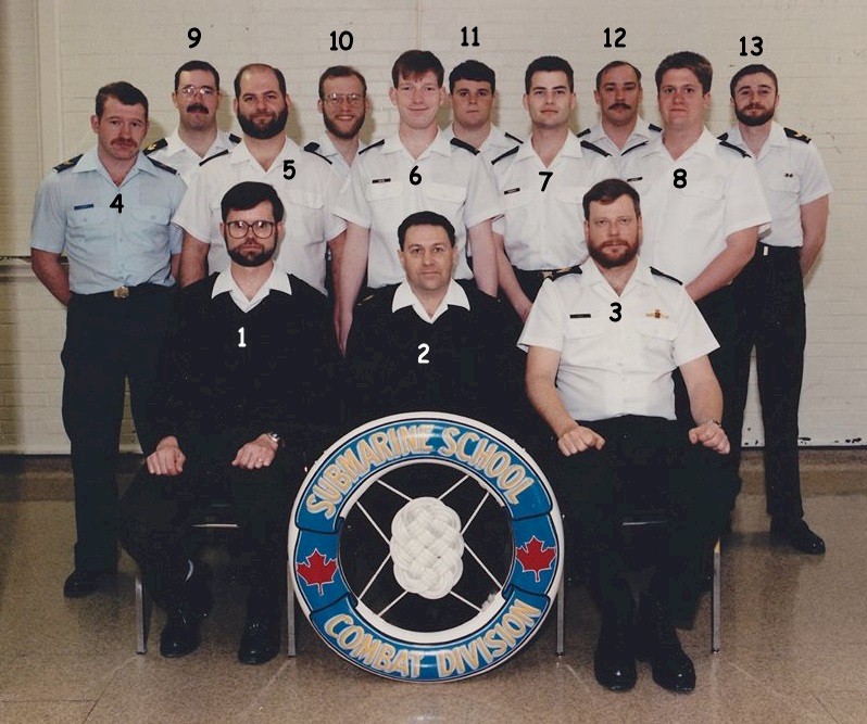 (1) Goodman, Kevin, PO1, Inst (2) O'Dwyer, John, PO1, Inst (3) Hayes, Derek, PO2, Inst (4) Dilworth, Mike, Cpl Cook (5) Griffin, Daniel, LS.RM (6) Daye, Daniel, OS.SN (7) McDonald, Joseph, OS.SN (8) Coffey, Sean, OS.SN (9) Ellerington, M., MS.ER (10) Bertrand, M.T. LS Admin Clk (11) Eddy, Scott, OS.SN (12) Alexander, Pat, LS.RM (13) Acheson, Chris, LS.RM