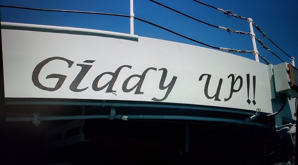 (ALG022 - ALG023) "Giddy up!!" "I wanna go fast" painted on the end of HMCS ALGONQUIN'S flight deck - date unknown // Source: Twitter feed of Joetey Attariwala // Courtesy of Colin Darlington
