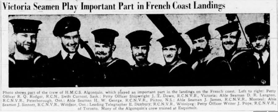(AGQ009) Victoria Seamen Play Important Part in French Coast Landings The Daily Colonist, Victoria, BC 11 Jun 1944 Photo shows part of the crew of HMCS ALGONQUIN, which played an important part in the landings on the French coast. Left to right; Petty Officer R.Q. Rodger, RCN, Swift Current, Sask.; Petty Officer Shipwright J.T. Down, RCNVR, Victoria; Able Seaman D.R. Langton, RCNVR, Peterborough, Ont.; Able Seaman H.W. George, RCNVR, Pictou, N.S.; Able Seaman J. James, RCNVR, Montreal; Able Seaman J. Sinnott, RCNVR, Windsor, Ont.; Leading Telegrapher E. Duxbury, RCNVR, Winnipeg; Petty Officer Writer J. Pope, RCNVR, of Toronto. Many of the ALGONQUIN's crew trained at Esquimalt // Courtesy of Frank Statham