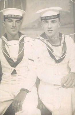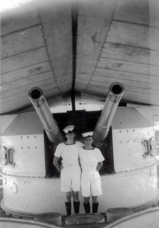 HMCS ALGONQUIN R17 in the Mediterranean Aug/Sep 1945 (WJB008) HMS GLASGOW and HMS HOGUE during manouveres off Malta (WJB009) " My chum Jack Buller (left) and myself under the twin gun of HMS HOGUE" From the collection of William J. Brooks, Stoker, RCNVR Courtesy of Ruth (Brooks) DeYoung