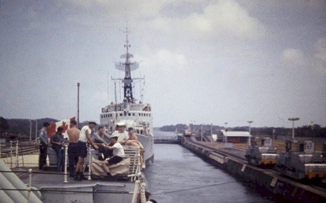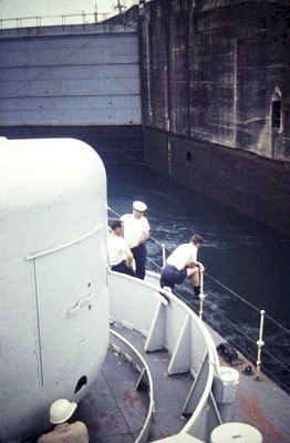 (UNK017) HMCS ALGONQUIN 224 approaching the Panama Canal * Transiting the Panama Canal - 09 Mar 1967 (UNK018) One of the locks of the Panama Canal (UNK019) Fo'c's'le of HMCS ALGONQUIN 224. Temperature 100 degrees Fahrenheit (UNK020) Fo'c's'le of HMCS ALGONQUIN 224. Temperature 100 degrees Fahrenheit (UNK021) HMCS CRESCENT 225 astern of HMCS ALGONQUIN 224