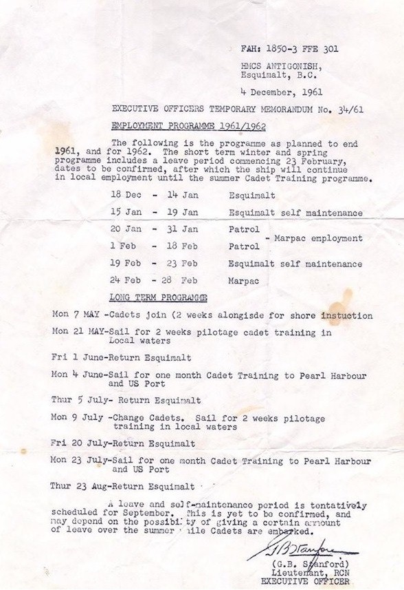 (ANT100) HMCS ANTIGONISH 301 shown approaching HMCS Cape Breton off the West Coast of Vancouver Island during the 'Cuban Missile Crisis' November 1962 // © 1962 Ken Watson RCN 1961-1968 (ANT101) HMCS ANTIGONISH 301, Esquimalt, Part of the 4th Escort Squadron, circa 1961-1962 // Courtesy of Michael Forshaw (ANT102) HMCS ANTIGONISH 301 // Courtesy of the CFB Esquimalt Naval and Military Museum (ANT103) HMCS ANTIGONISH 301 - 17 Sep 1965 // Photographer: Walter E. Frost // Source: City of Vancouver Archives (ANT104) HMCS ANTIGONISH 301 Station Card for OSTR Steve Hlasny, 1952 // From the collection of Steve Hlasny, CPO2.LT