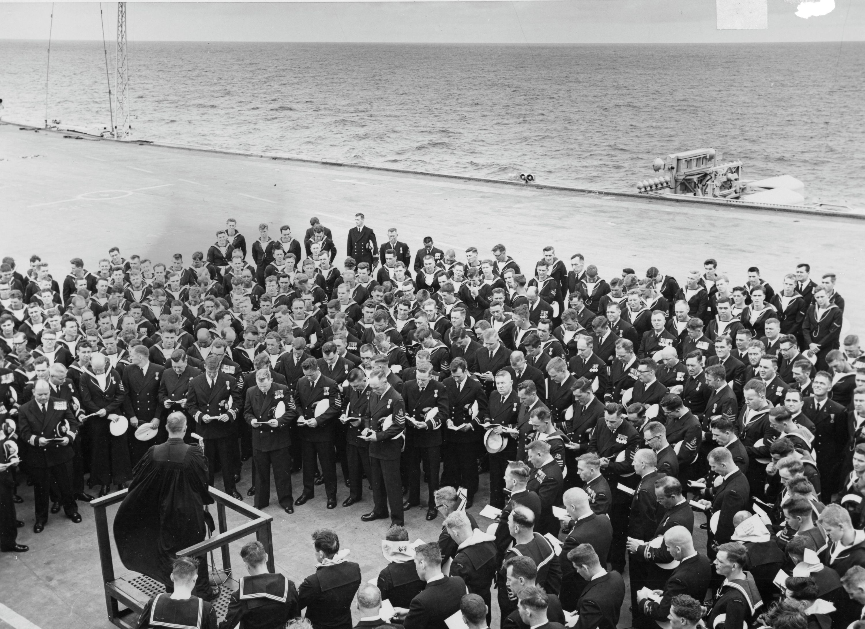(DP09-DP10) Chaplain Peebles conducting a service on board HMCS BONAVENTURE (DP11) Chaplain Peebles speaking with Captain Walter Timbrell, CO of BONAVENTURE (DP12) Chaplain Peebles conducting a Remembrance Day Service on board HMCS BONAVENTURE c1964-65 (DP13) Chaplain Peebles on board HMCS BONAVENTURE